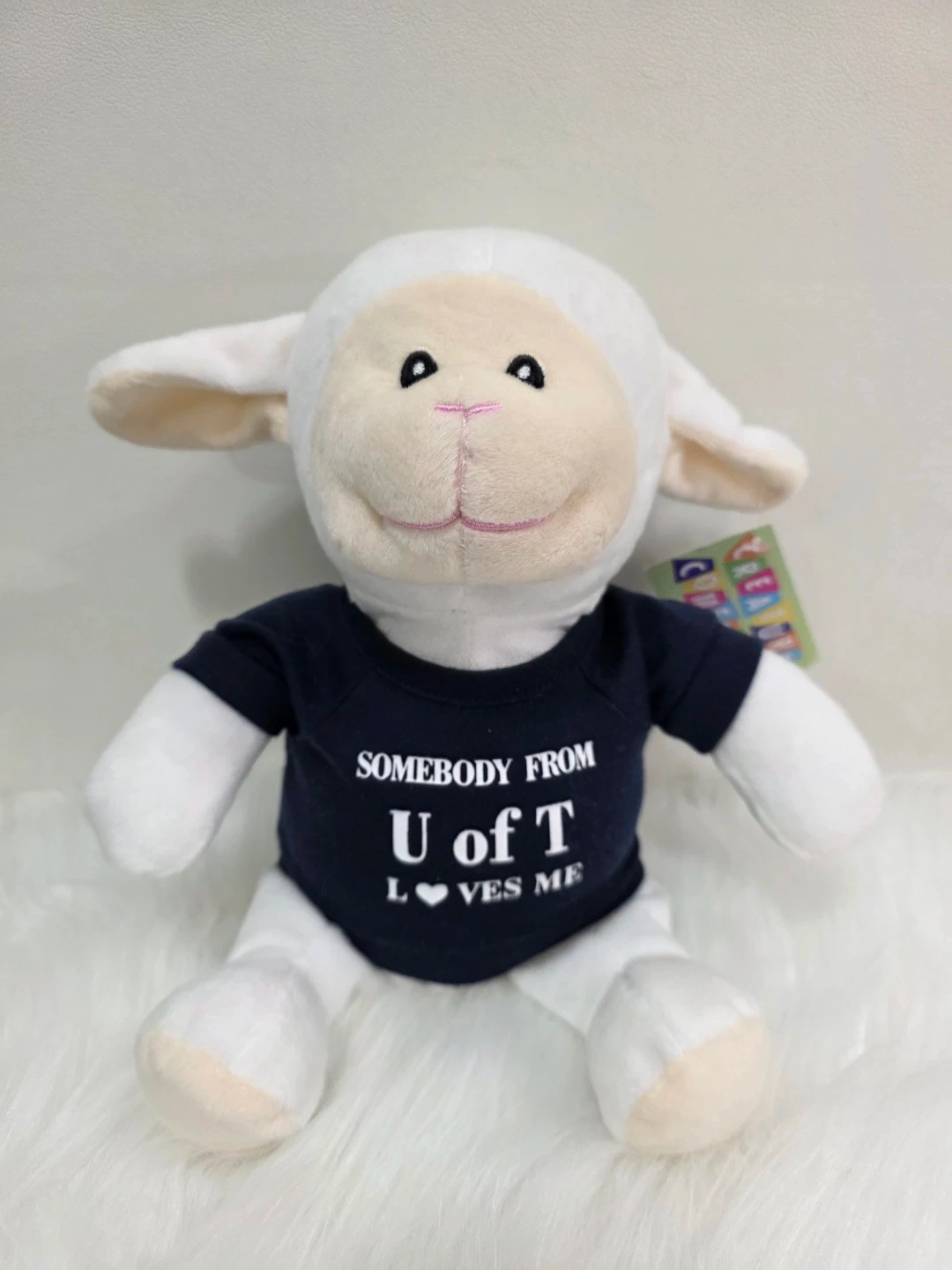 Cute lamb plushie wearing a "Somebody from U of T Loves Me" t-shirt! It's about 10 inches tall and in great condition. Perfect for any University of Toronto fan or as a souvenir