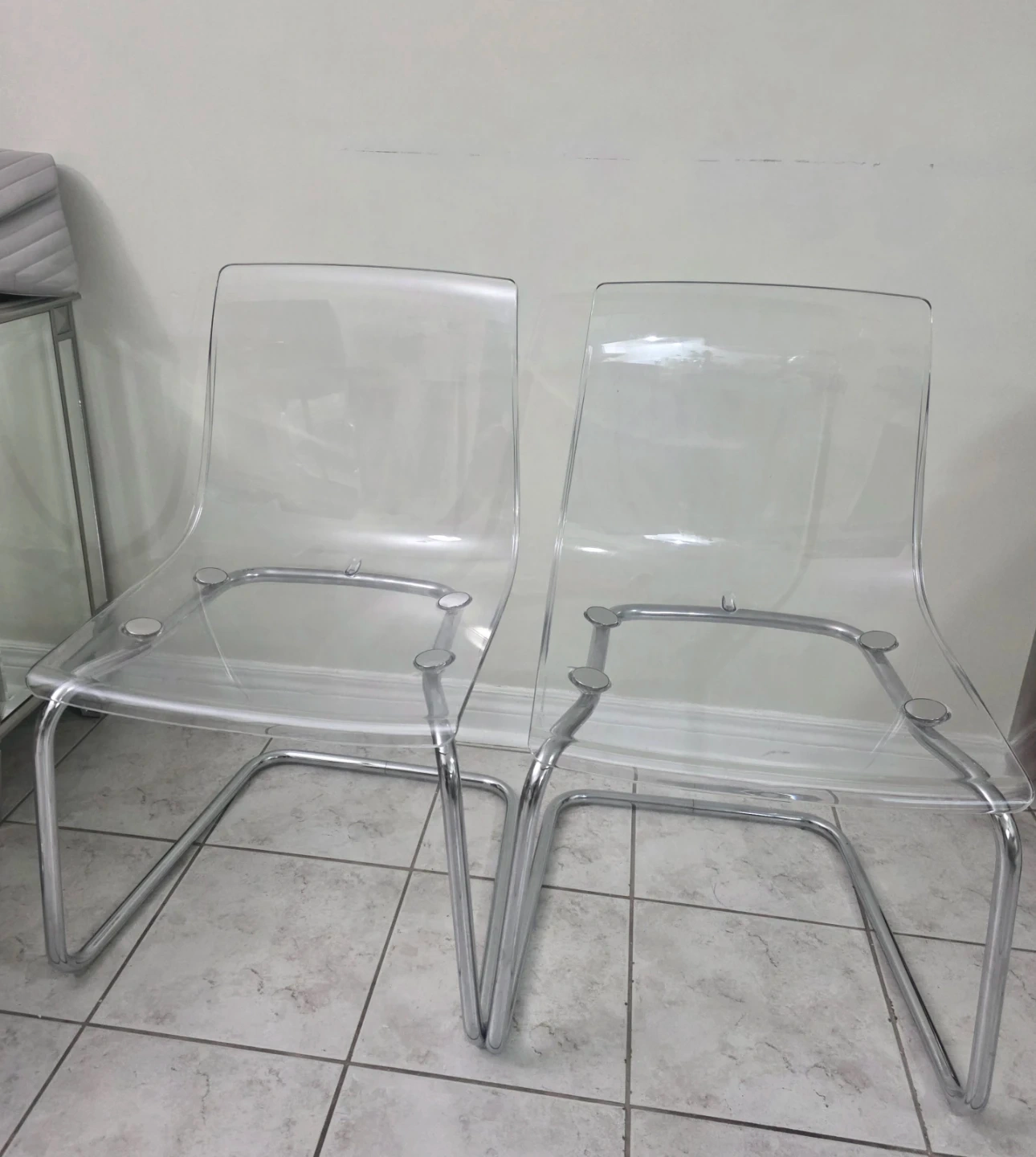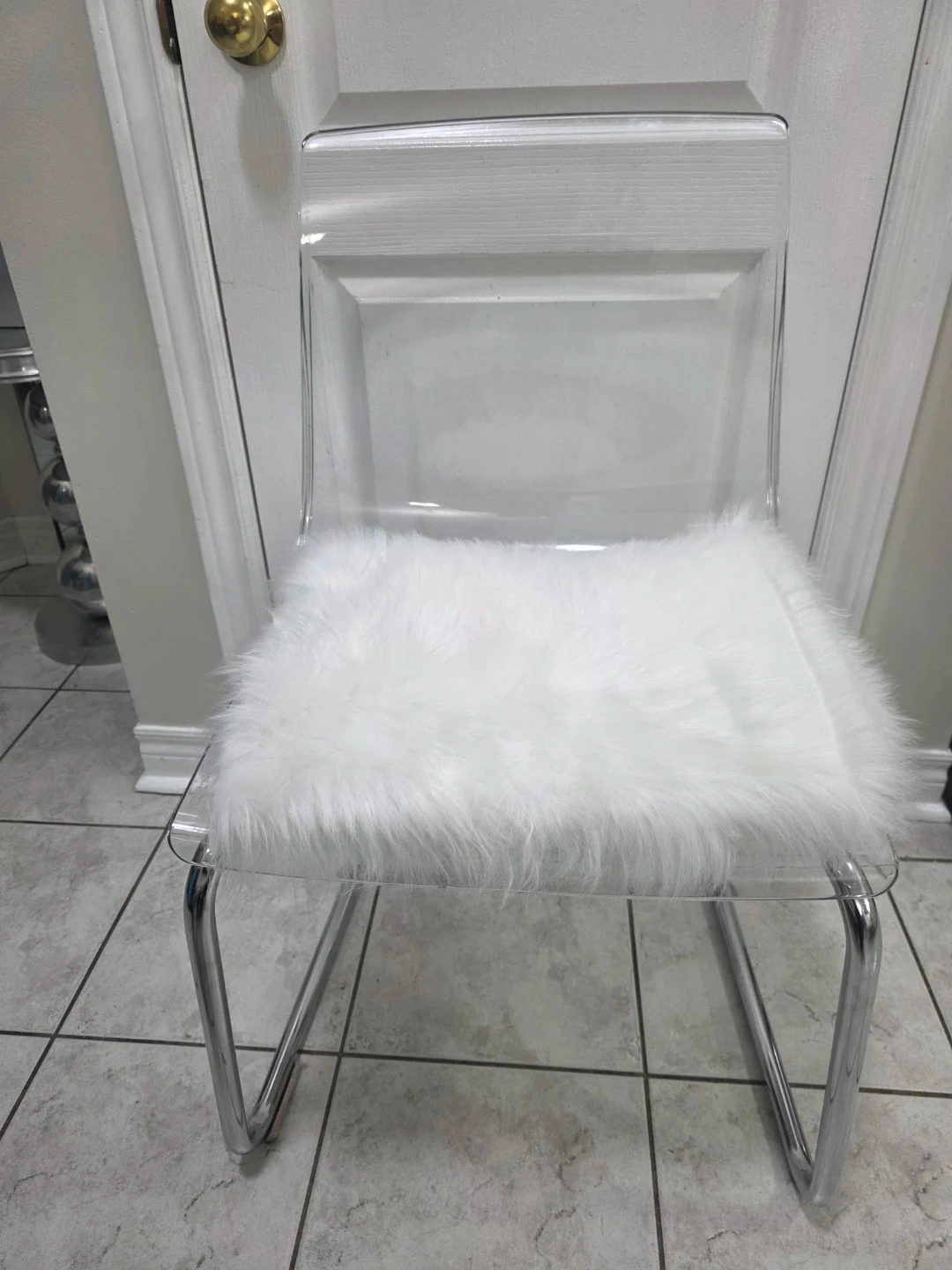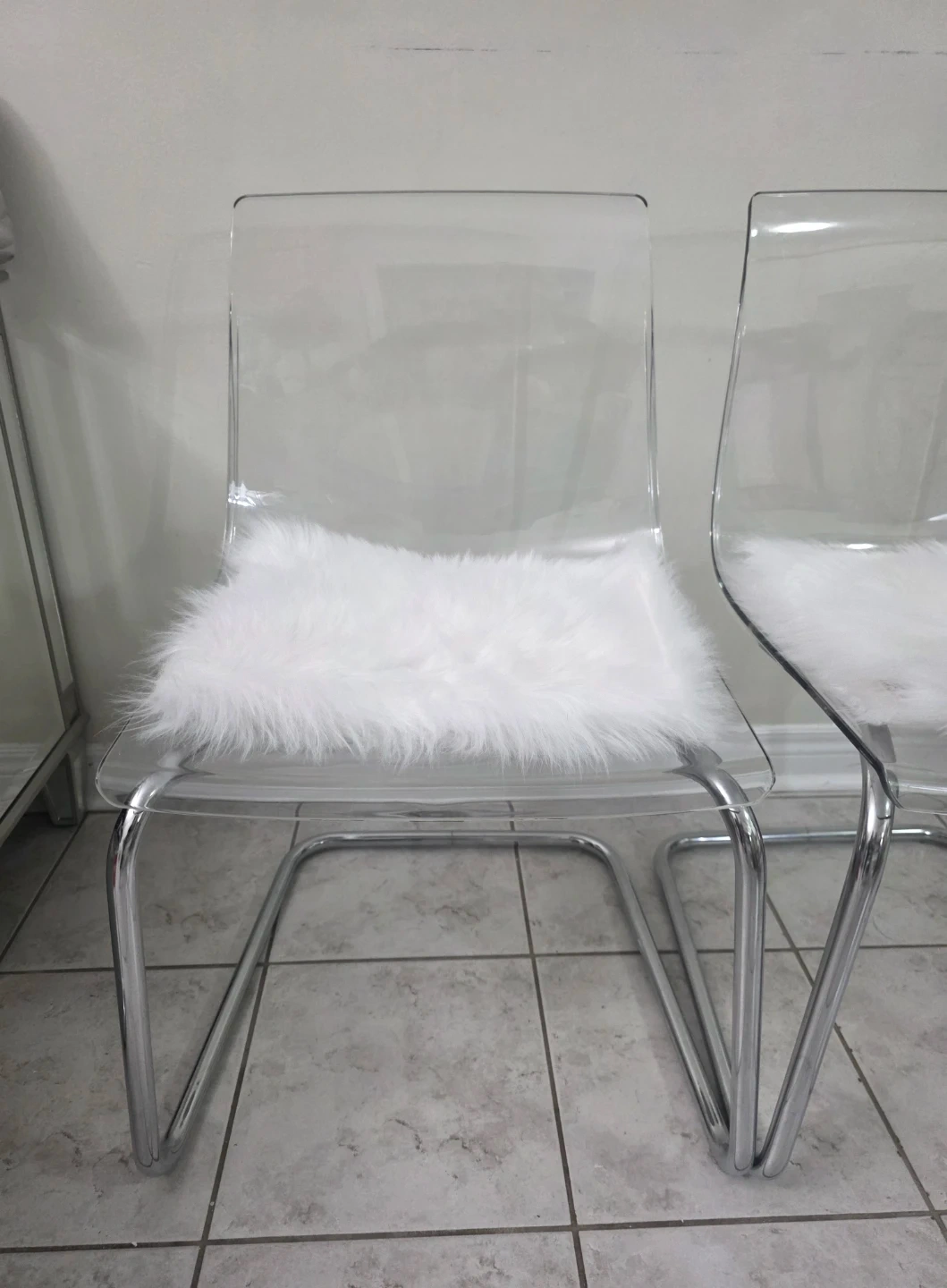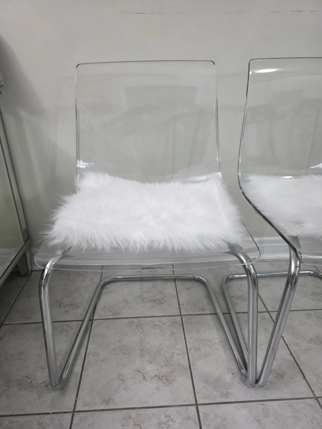 Selling 4 clear acrylic dining chair with chrome legs from Ikea. In great condition and would look great in any modern dining room or kitchen. The chair also comes with a white faux fur seat cushion.