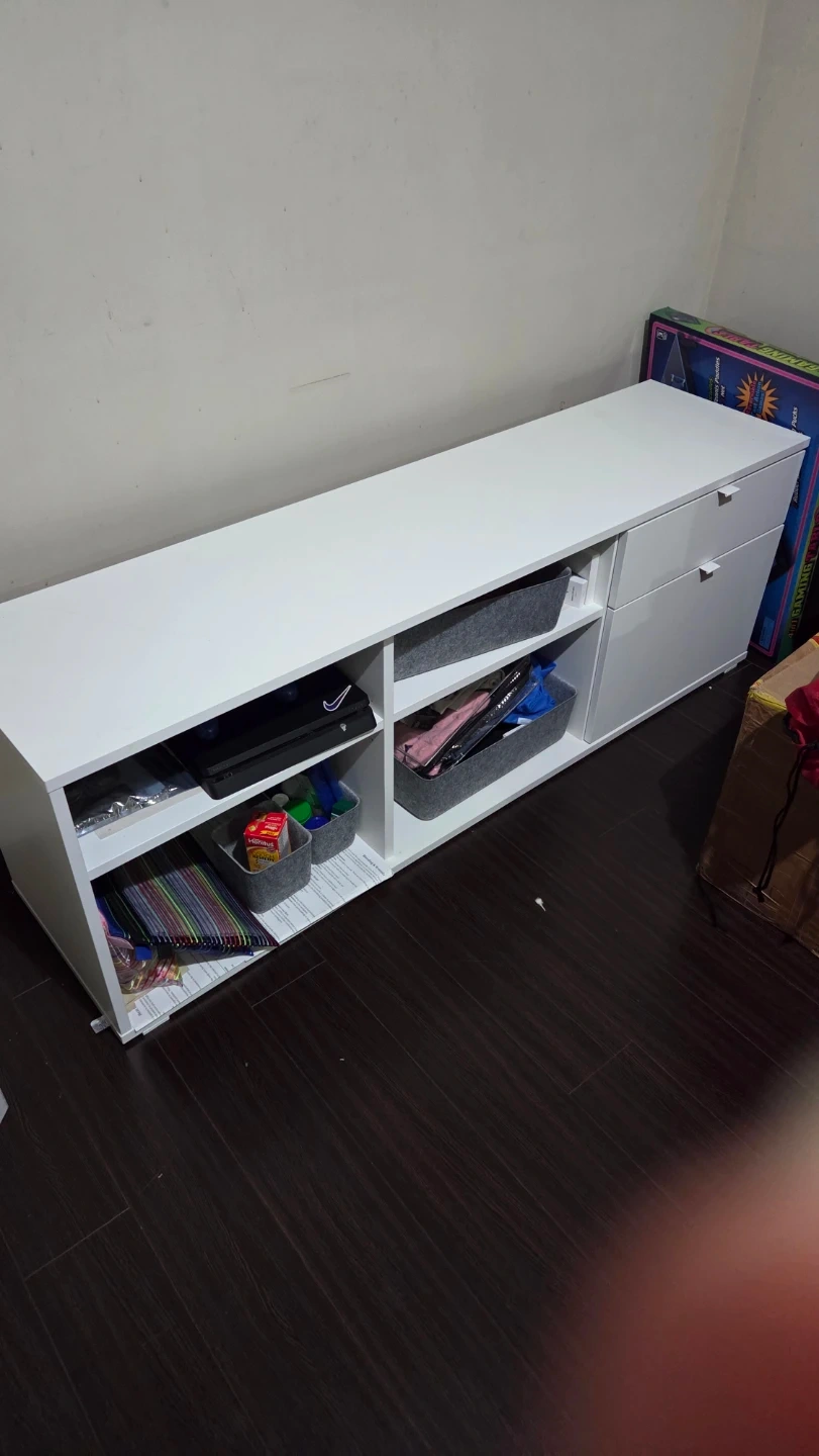 Can be used as a TV stand, storage unit, sideboard, or shelf. Has open shelves and drawers – perfect for books, toys, documents, or home items.