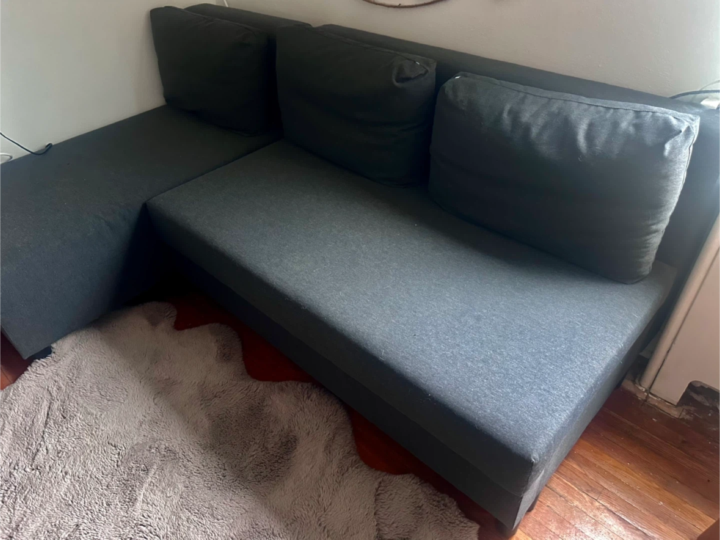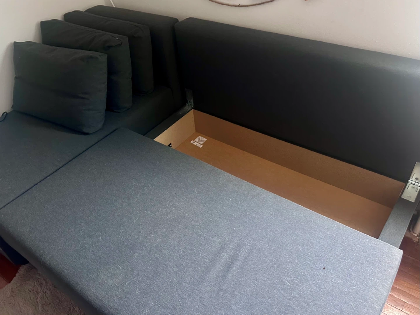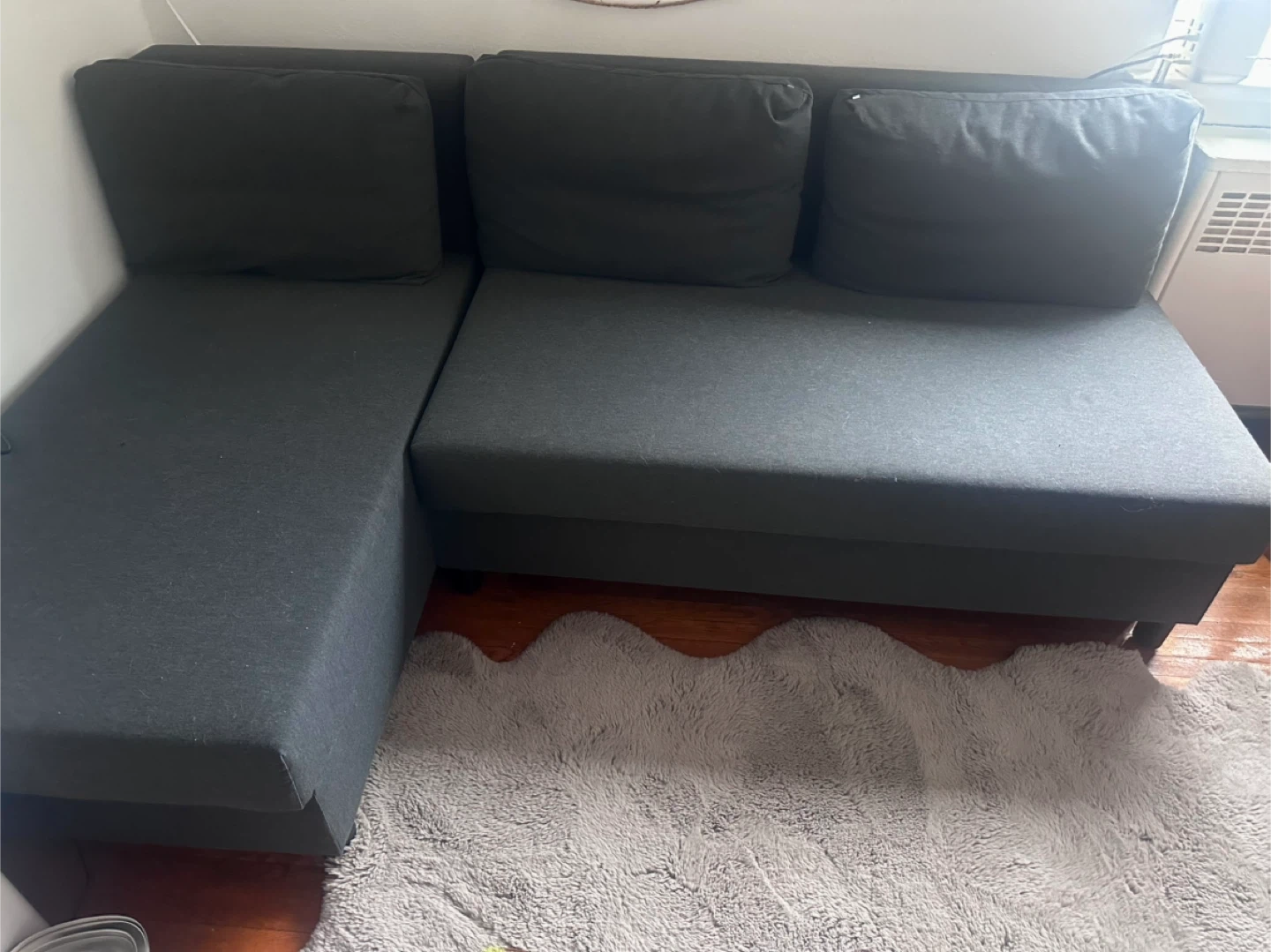 Selling a used Ikea Friheten sleeper sectional sofa in charcoal colour. It's in great shape and has a convenient storage compartment underneath the chaise. Perfect for small spaces or a guest room!