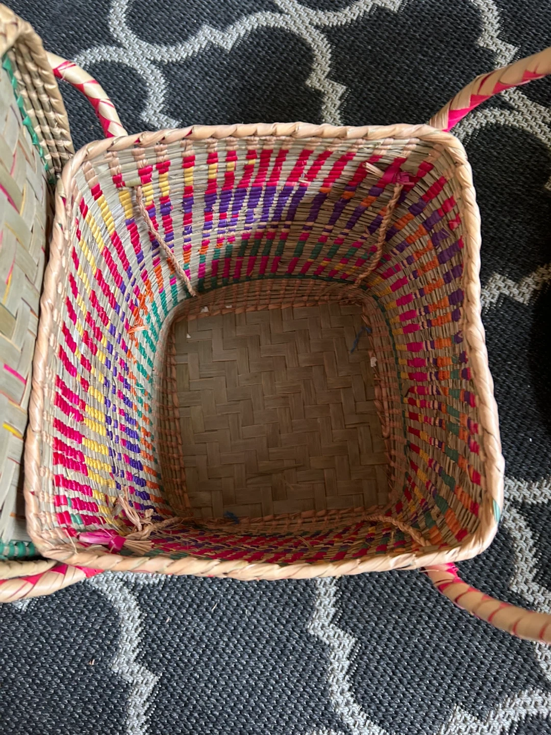 Here's a colourful woven basket! It comes with a lid and handles, making it easy to carry. Perfect for storage or decoration around the house