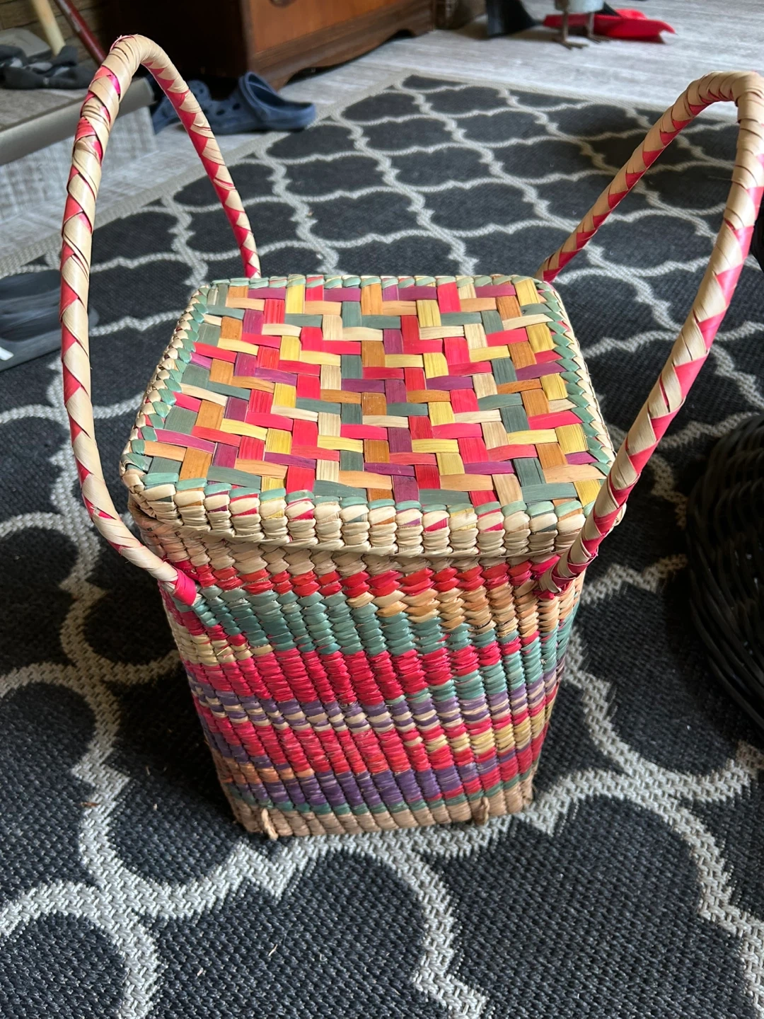 Here's a colourful woven basket! It comes with a lid and handles, making it easy to carry. Perfect for storage or decoration around the house