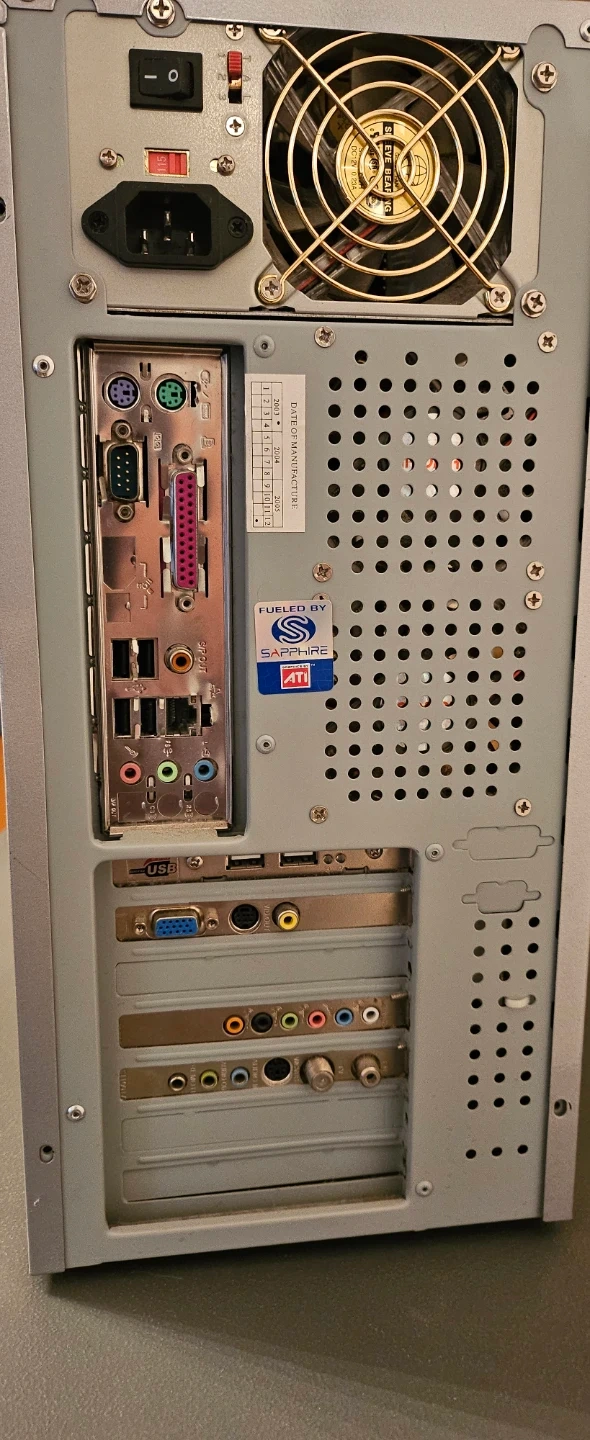 Selling a custom-built gaming PC. It features an MSI Mainboard and a Sapphire GPU. It also has a Samsung DVD RW and an LG DVD drive. The case is silver and has a unique design on the front panel. It's in used condition.