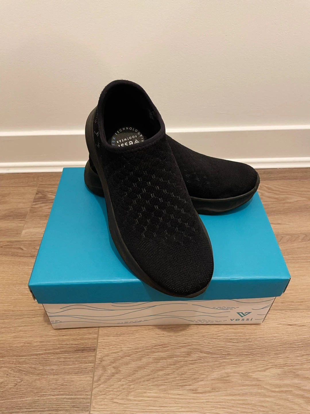 Selling these Vessi skyline slip on in lunar black. They were bought brand new and only wore once! I have wide feet, so I bought men’s size 6 (M6) after consulting with Vessi’s reps, which is equivalent of women’s size 7 but for wider feet. I originally tried their W7 but they were very narrow and uncomfortable, so I switched to M6, which is excellent for wide feet. However, the ankle collar is too tight for me, so I end up only wore once and they’ve been sitting on my shelf taking up space. Now I have less shelf space so sadly will need to part with them. In original box.