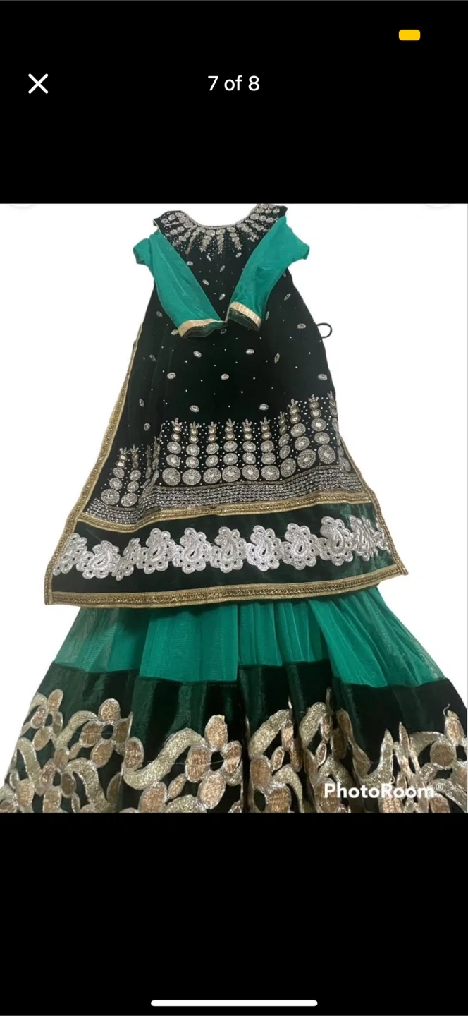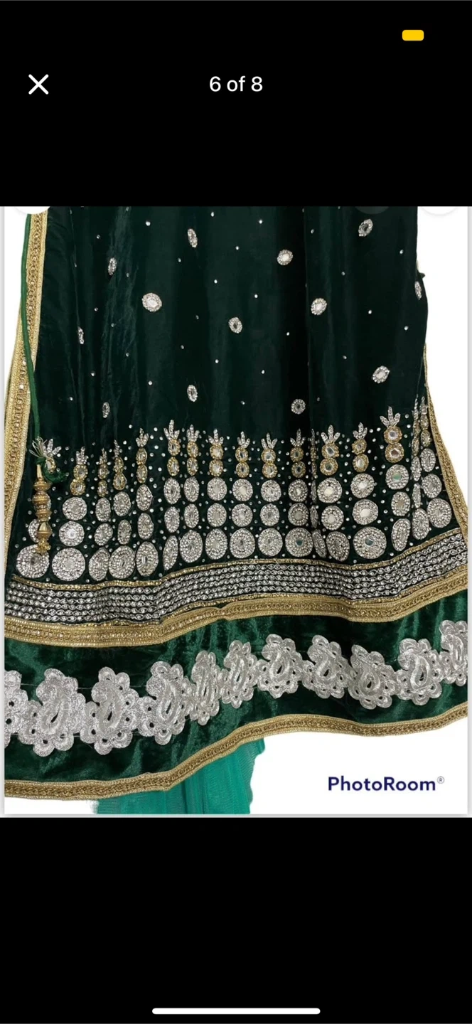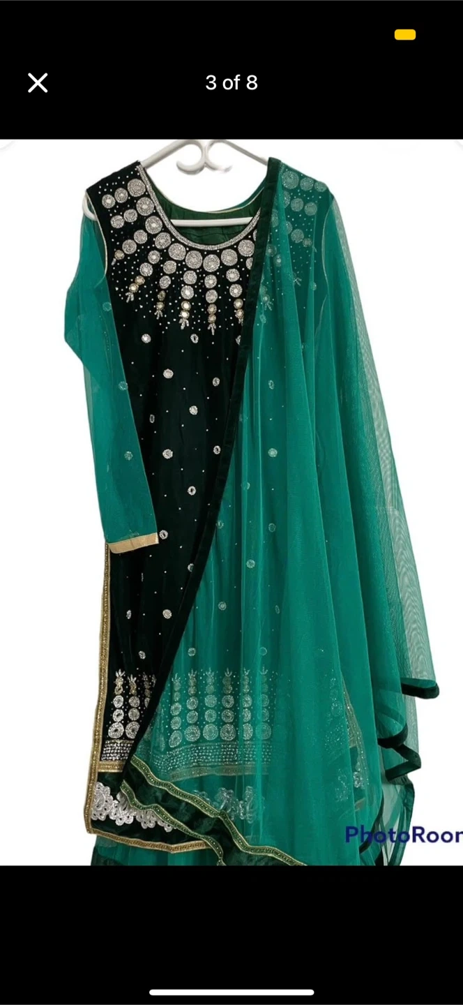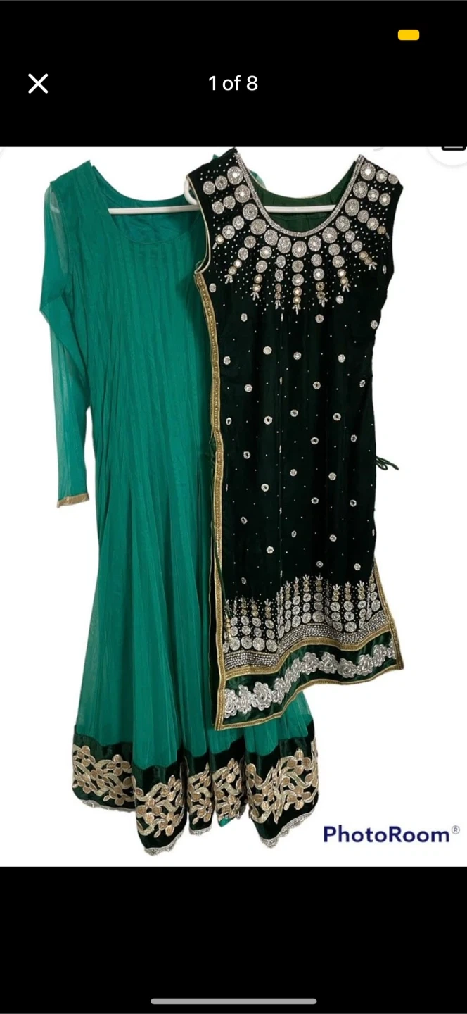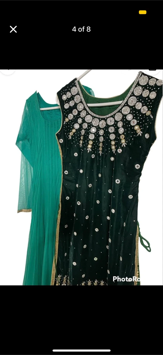 Selling a beautiful green salwar kameez! It features intricate embroidery and a lovely design. Perfect for special occasions or adding a touch of elegance to your wardrobe. The long sleeve, comes in the bottom and the dark green comes on top. U can wear it in tow different ways. Either with only pant and light green dress ( the long sleeve one), or only pant and the sleeveless one.Both ways will make u a look beautiful.