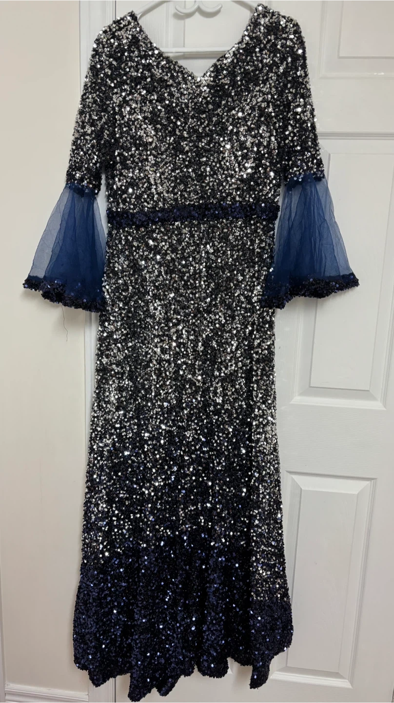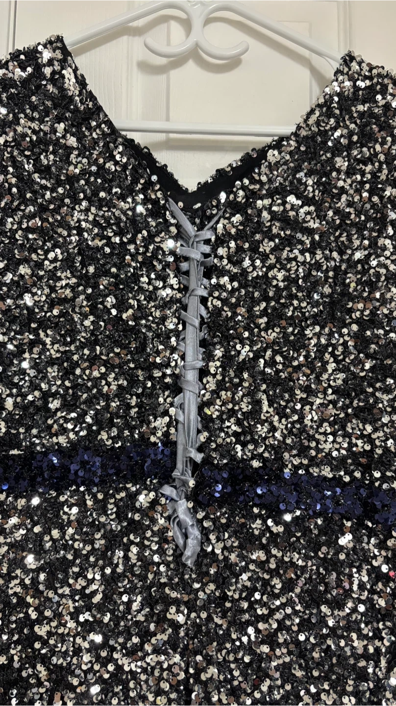 Beautiful sequin dress with navy blue accents! The dress features a unique design with shimmering sequins and elegant navy blue detailing. It's perfect for a special occasion or a night out. The dress is in great condition and ready to wear!