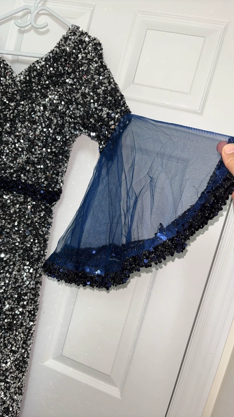 Beautiful sequin dress with navy blue accents! The dress features a unique design with shimmering sequins and elegant navy blue detailing. It's perfect for a special occasion or a night out. The dress is in great condition and ready to wear!