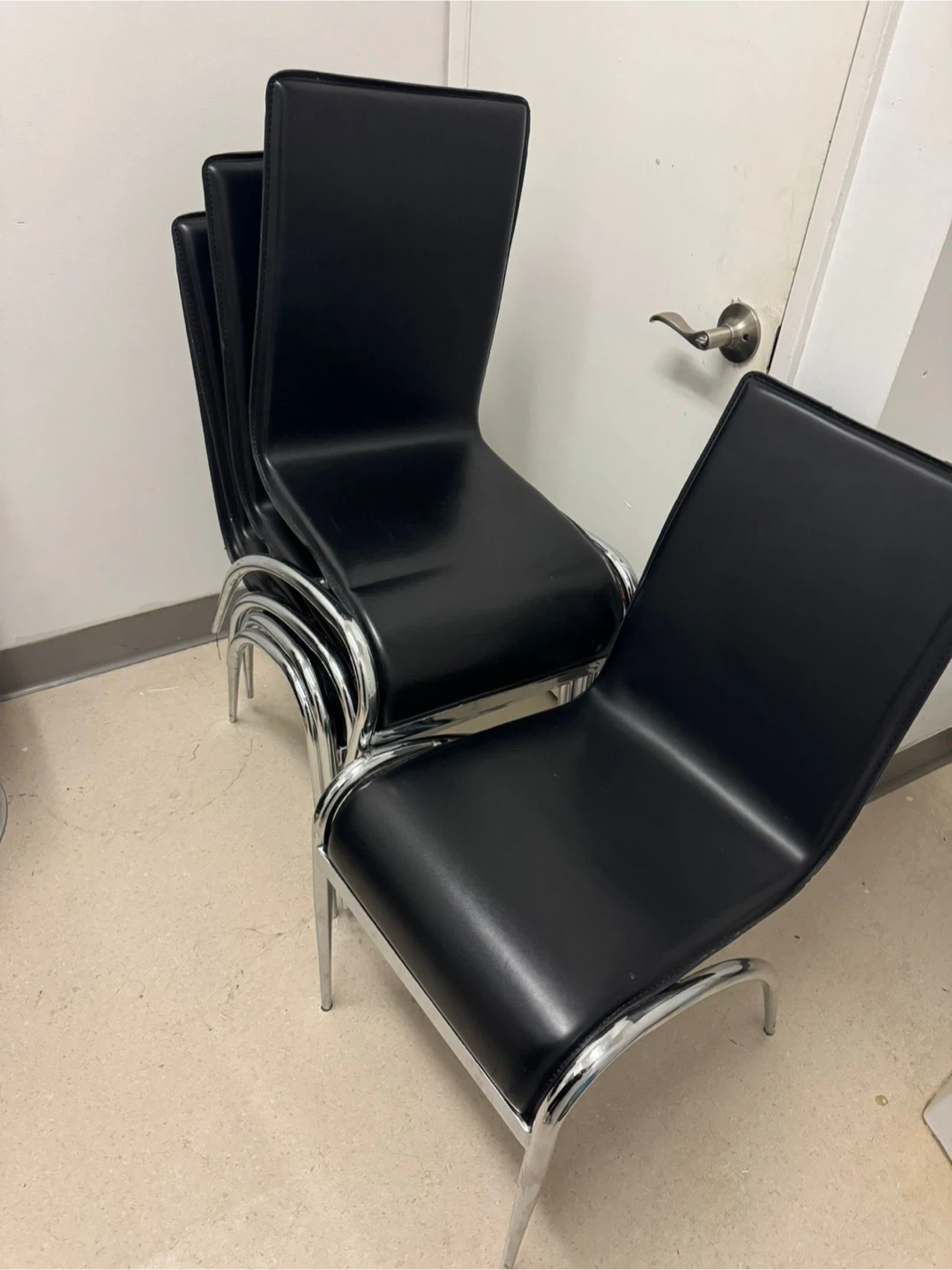 Selling a set of four dining chairs! They feature a sleek black leather seat and back, complemented by a chrome frame. These chairs are perfect for adding a modern touch to your dining area or office space. They're in great shape and ready to use!