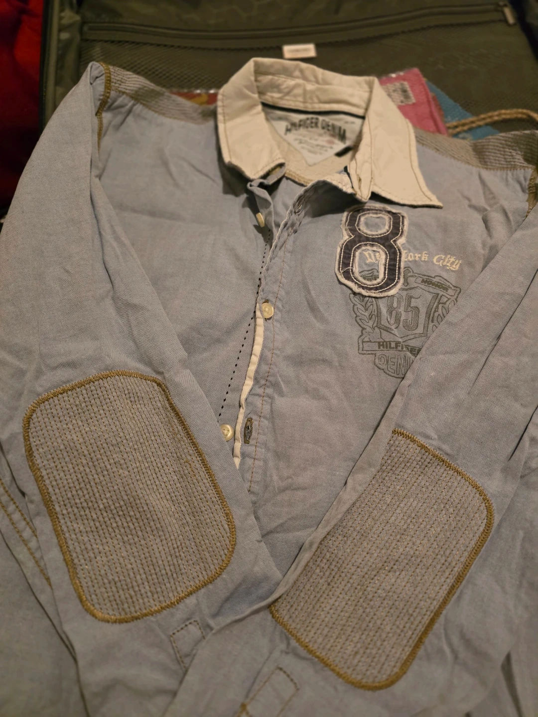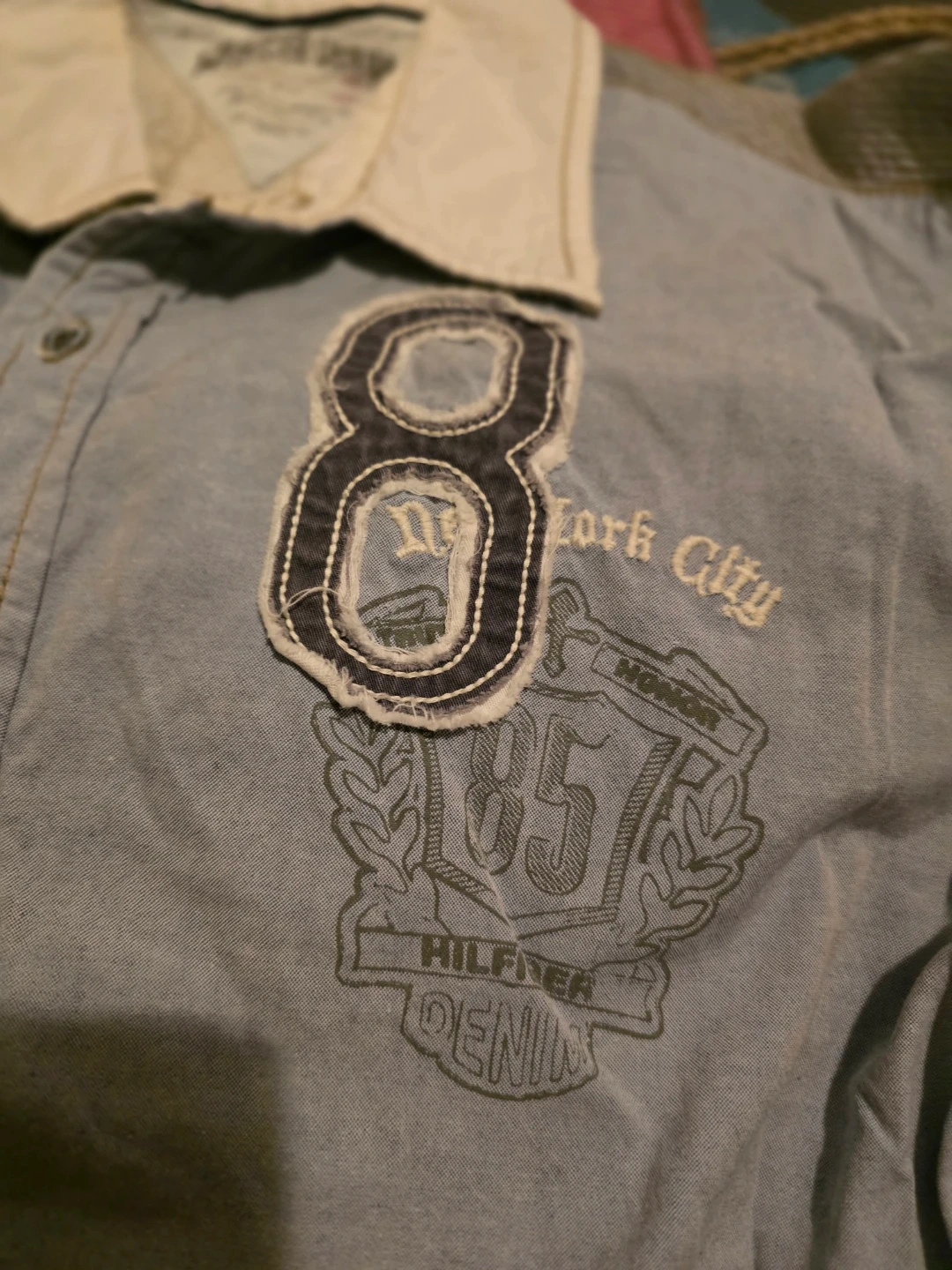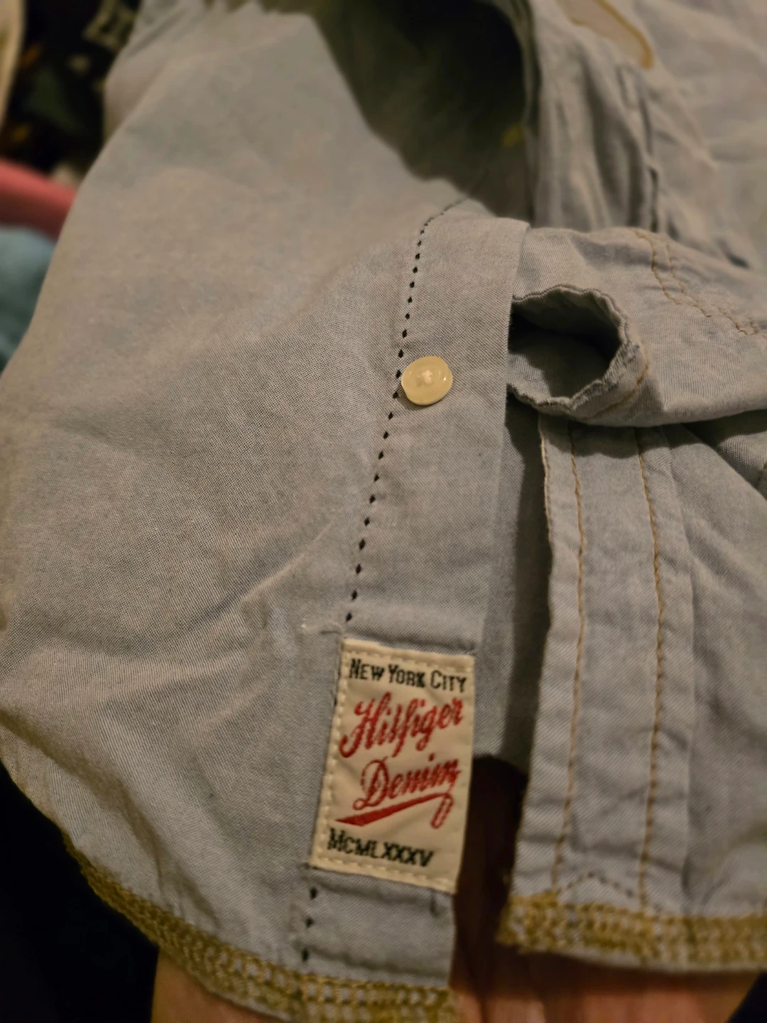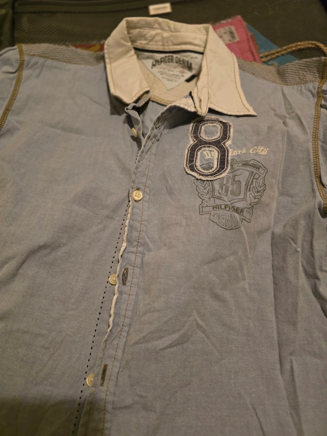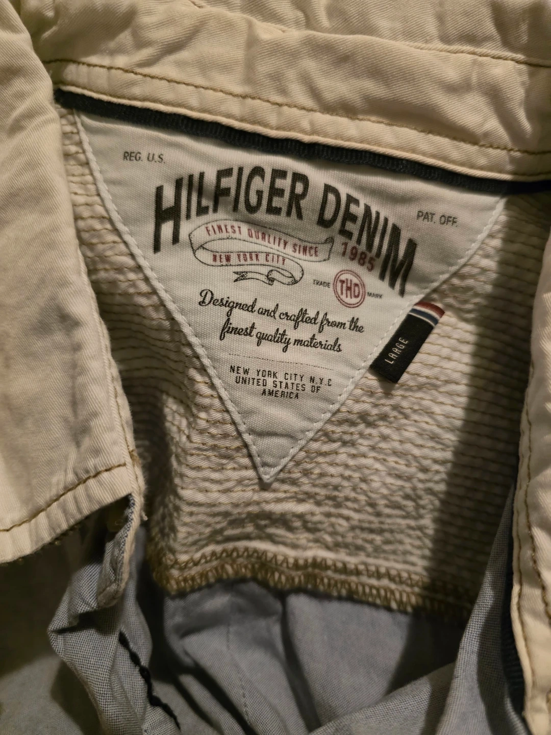 Tommy Hilfiger Denim shirt in size large! This shirt has a unique design with patches on the elbows and nice detailing on the front. It's in great condition and ready for a new home!