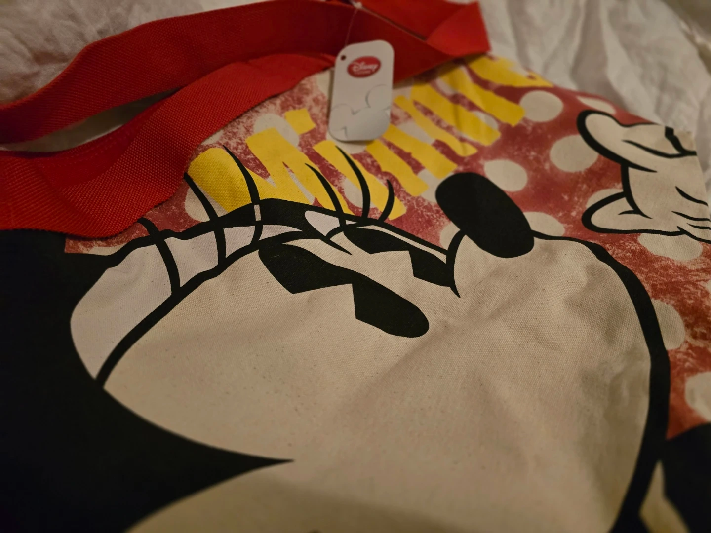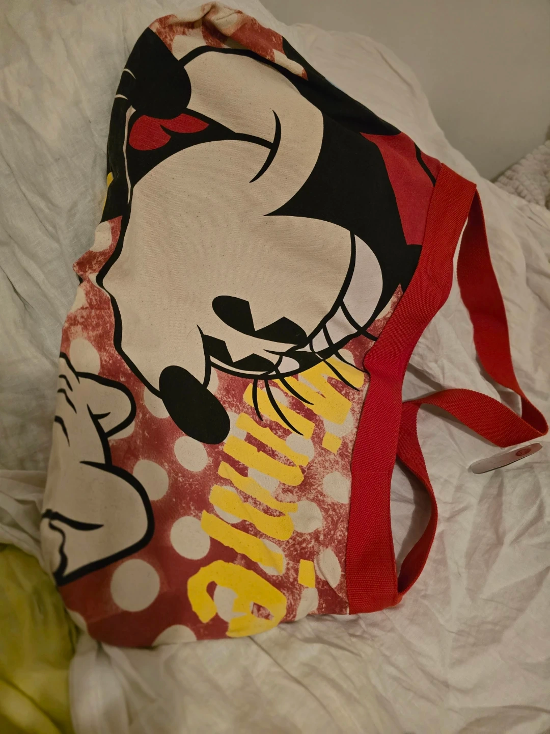 Selling a cute Disney Mickey Mouse tote bag! It's in great condition and perfect for carrying your essentials. The bag features a fun Mickey Mouse design with red accents and a convenient zipper closure. From Japan Disney.