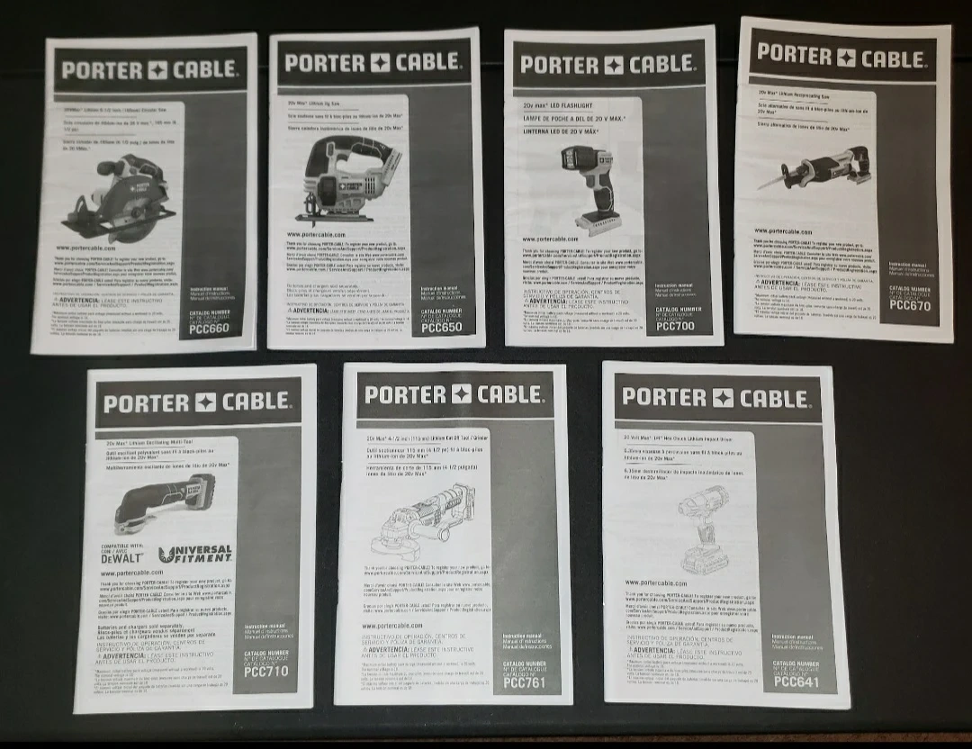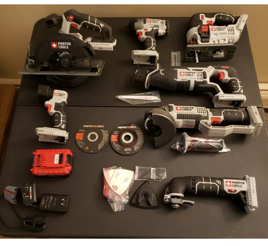 Selling a Porter Cable 20V cordless power tool set. It includes various tools like a circular saw, jigsaw, flashlight, reciprocating saw, drill, grinder, and oscillating tool. Also included are a battery, charger, and manuals. Great for DIY projects!