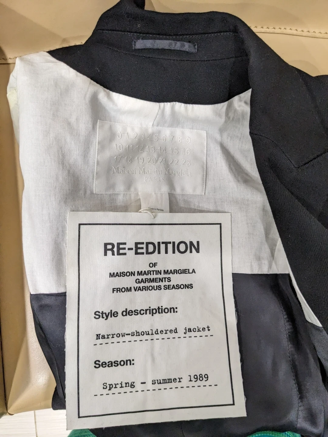 Selling a Maison Martin Margiela Re-Edition Garments jacket. The style description is a narrow-shouldered jacket from the summer of 1989.