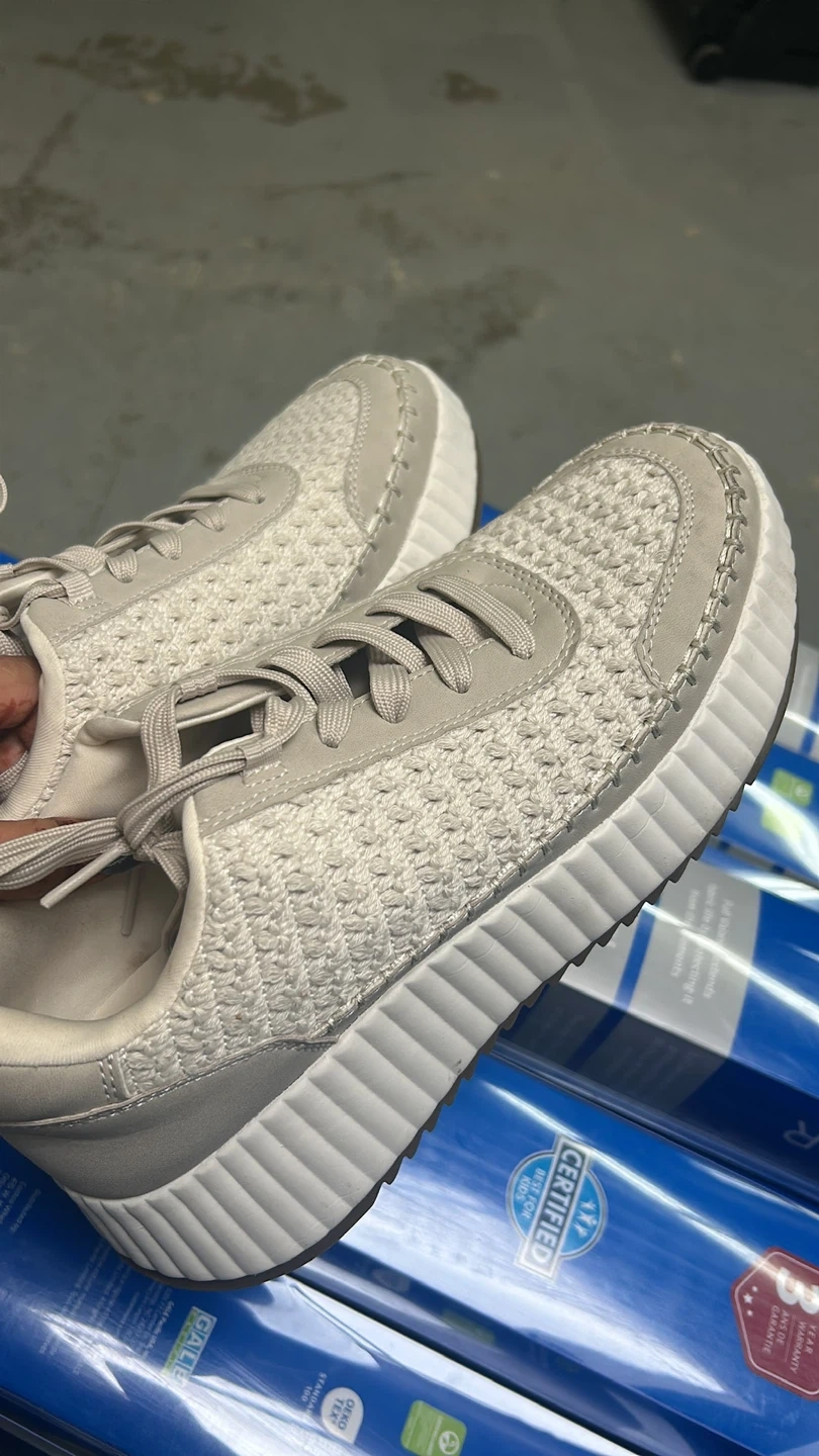Selling a pair of comfortable beige knit sneakers. They feature a stylish knit design and a sturdy sole, perfect for everyday wear