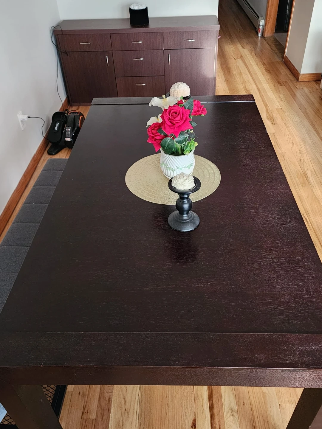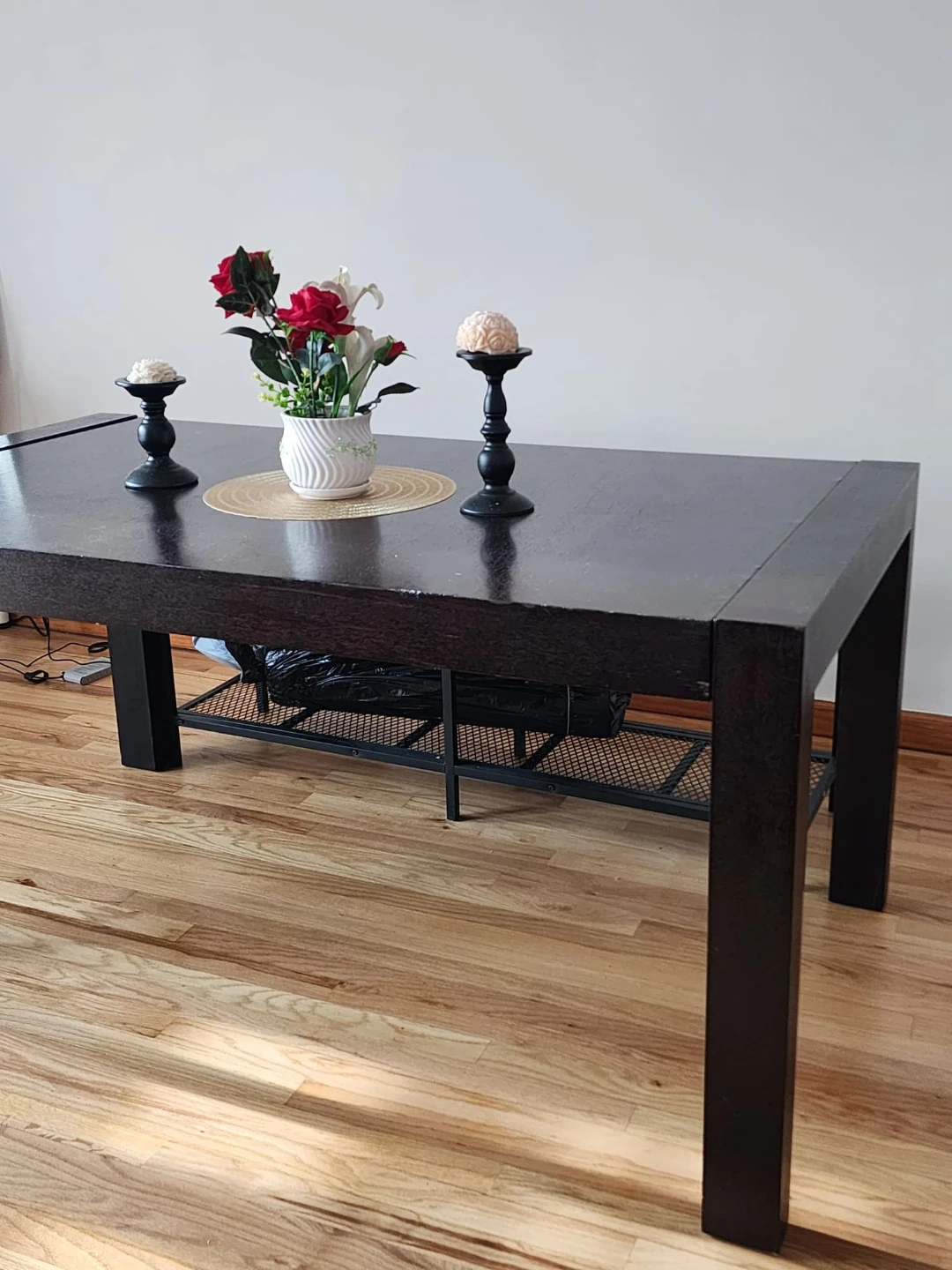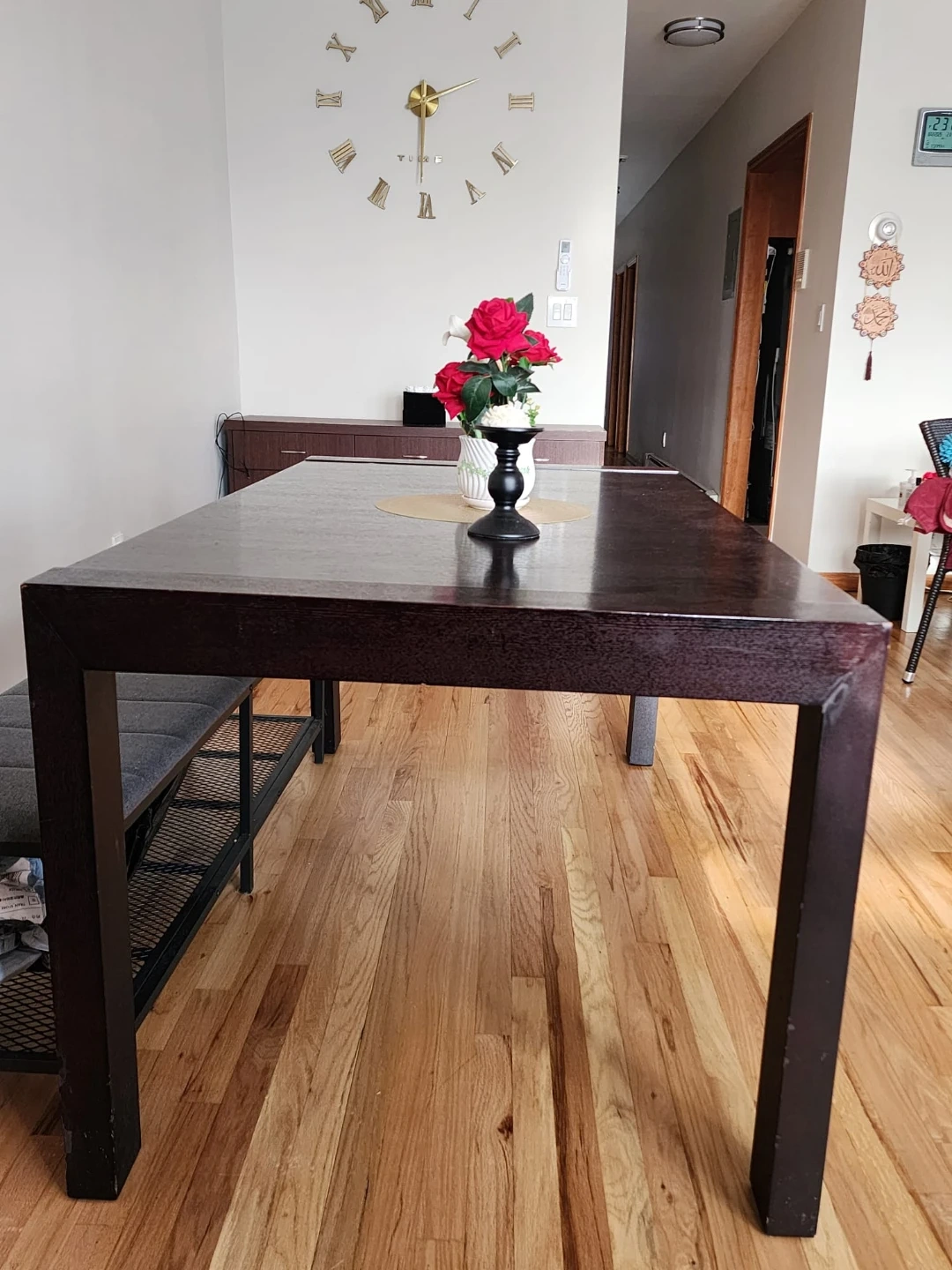 Selling a dark brown wood dining table. It's a sturdy and functional table that would be great for any dining room. It has a simple, modern design that would fit in with any decor. It's in good condition and ready for a new home. Up to 6 to 8 people.