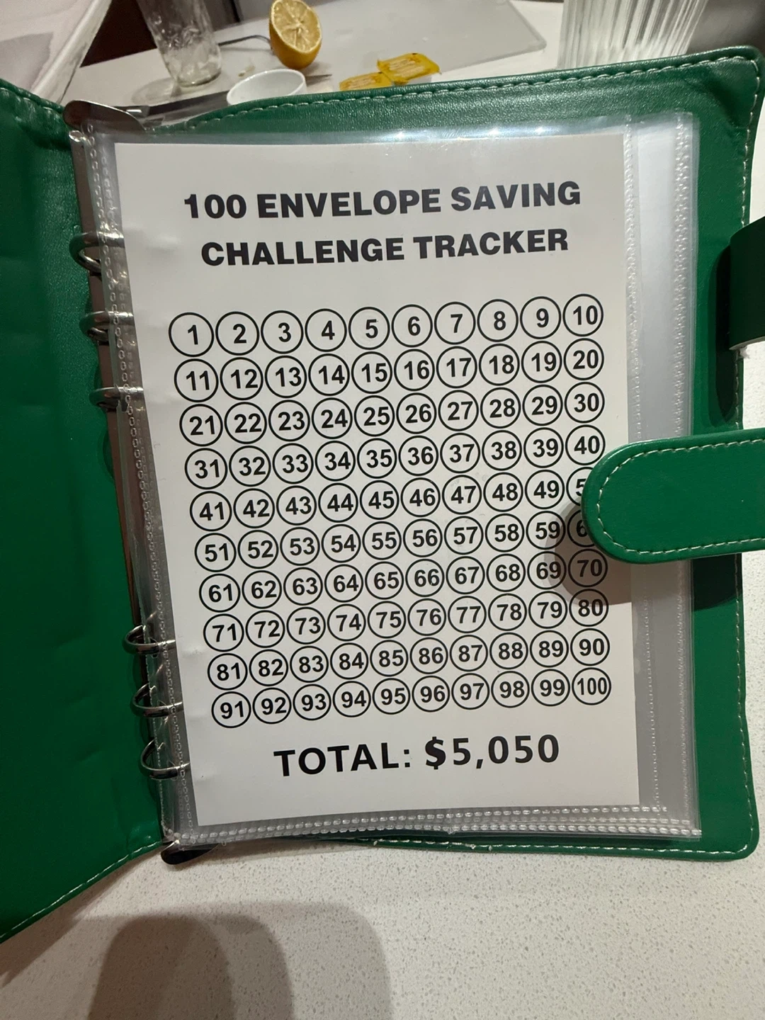 Get organized with this 100 Envelope Savings Challenge Tracker! It's a fun and effective way to save up to $5,050. The green binder keeps everything neat and tidy, so you can easily track your progress