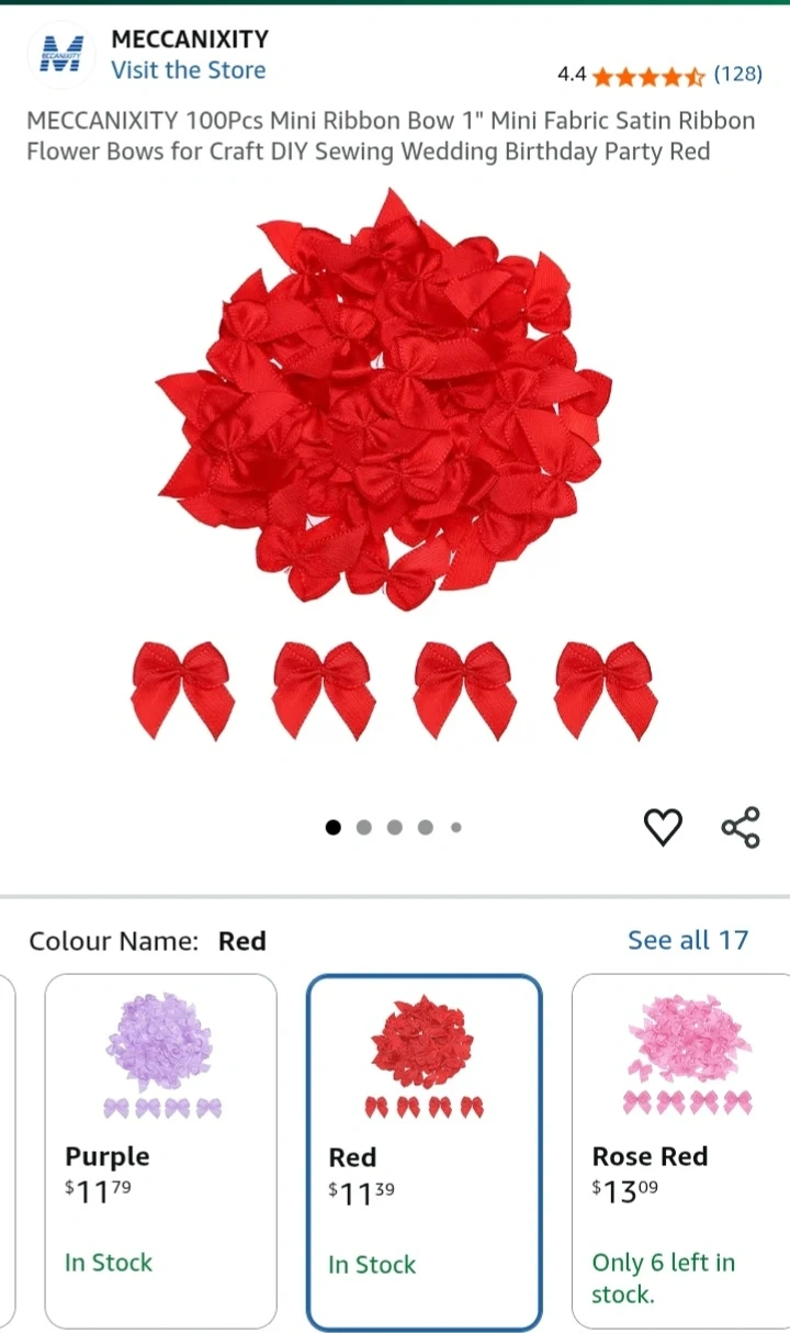 I have sets of MECCANIXITY mini ribbon bows available, perfect for adding a touch of charm to your craft projects! These 1" mini fabric satin ribbon flower bows are great for DIY sewing, wedding decorations, or birthday party embellishments. Available in various colours.