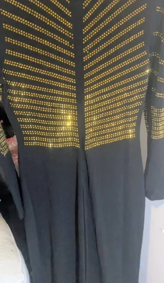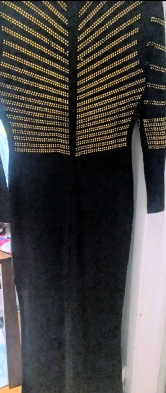 This is a striking black long-sleeve dress featuring a unique design of gold studs. It's perfect for making a statement at any event! The dress has a sleek, form-fitting silhouette and the gold studs add a touch of glamour