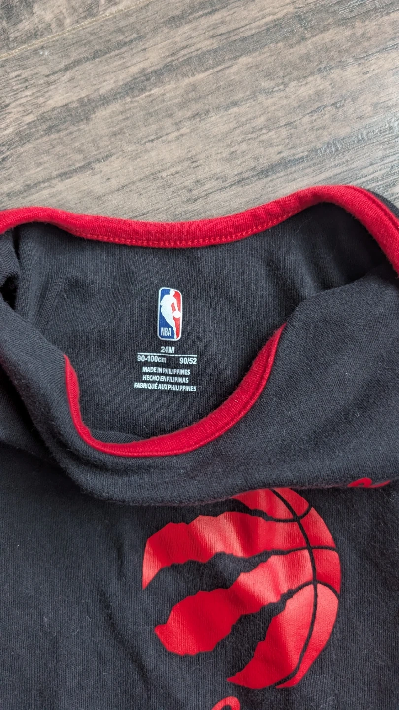 Two adorable NBA Toronto Raptors baby rompers in excellent condition! One is black with "Forever Love" and a basketball design, while the other is red with a heart and basketball design. Both are size 24M (90-100cm). Perfect for your little Raptors fan!