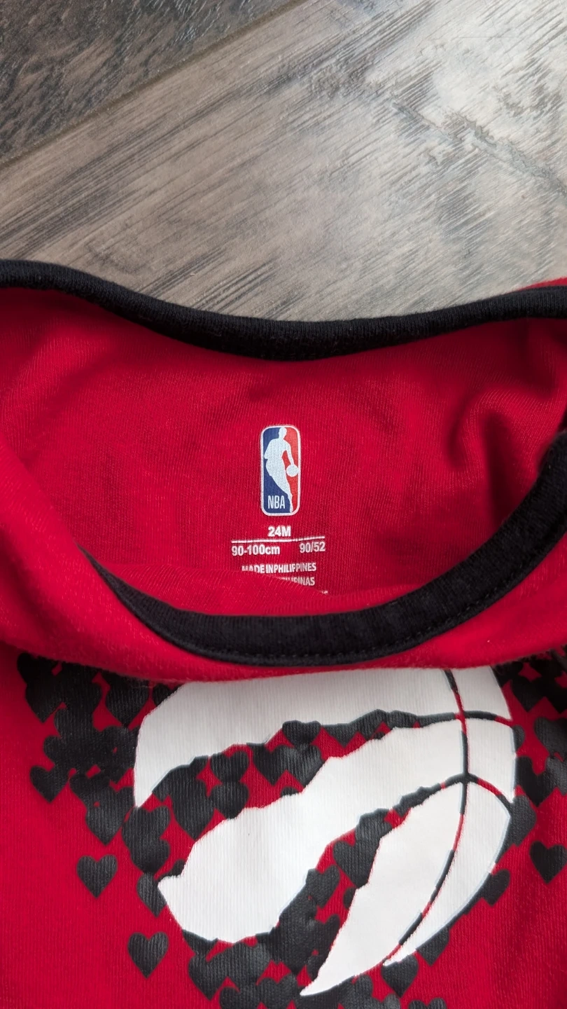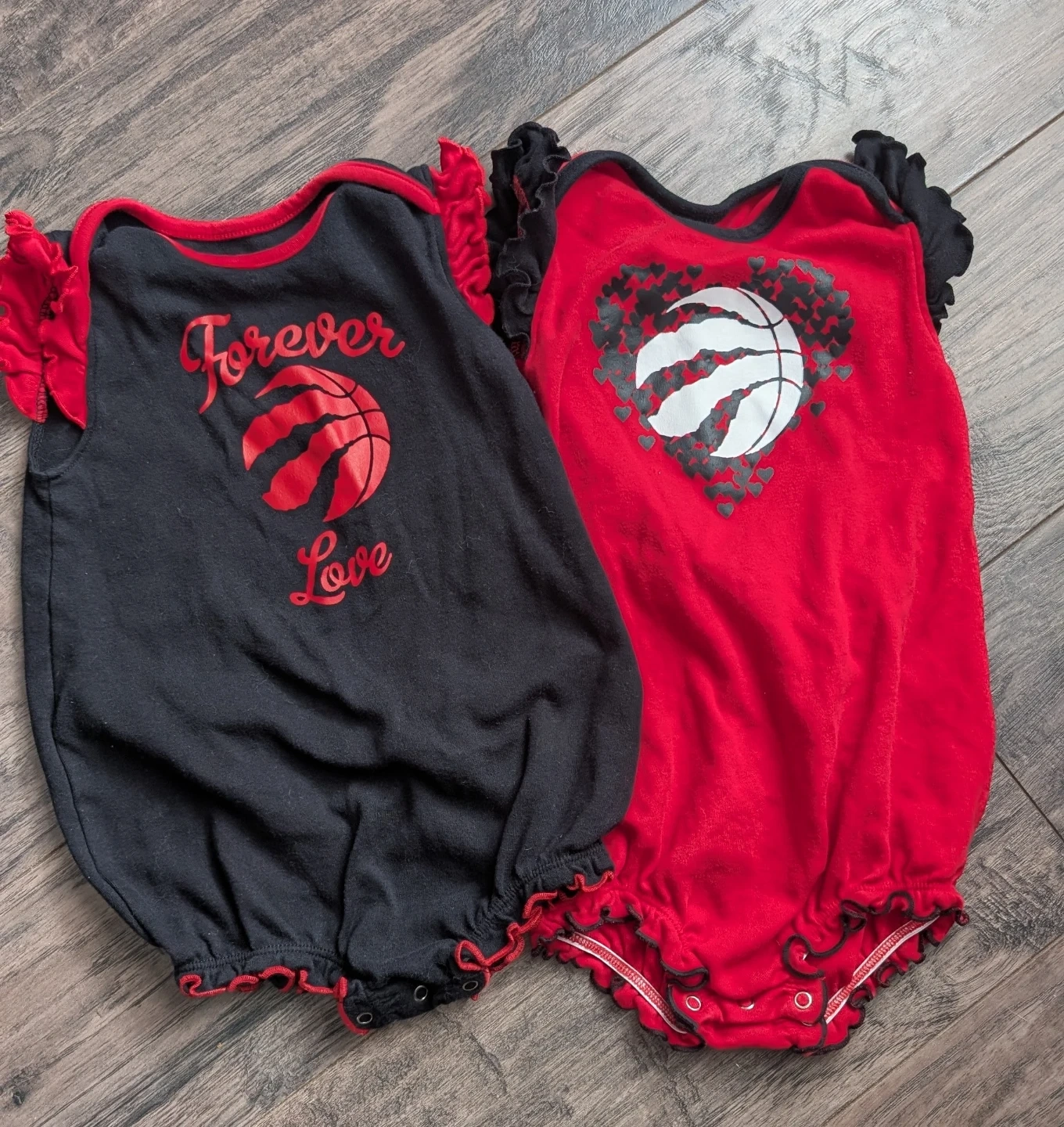 Two adorable NBA Toronto Raptors baby rompers in excellent condition! One is black with "Forever Love" and a basketball design, while the other is red with a heart and basketball design. Both are size 24M (90-100cm). Perfect for your little Raptors fan!