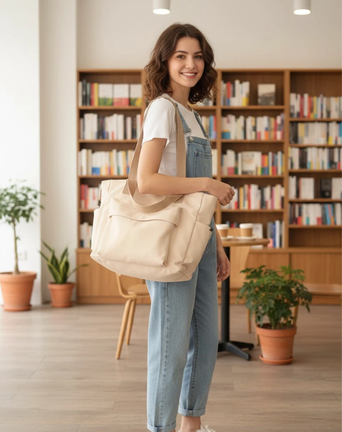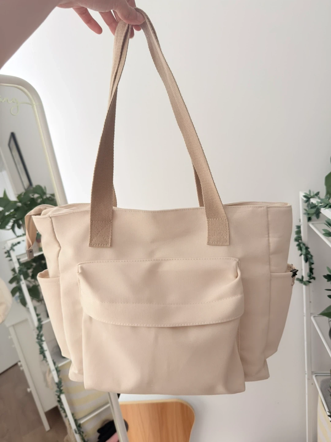 A cute and versatile beige canvas tote bag! Perfect for everyday use, shopping, or carrying books. It has several pockets for organization, making it super practical. It's in great condition and ready for a new owner