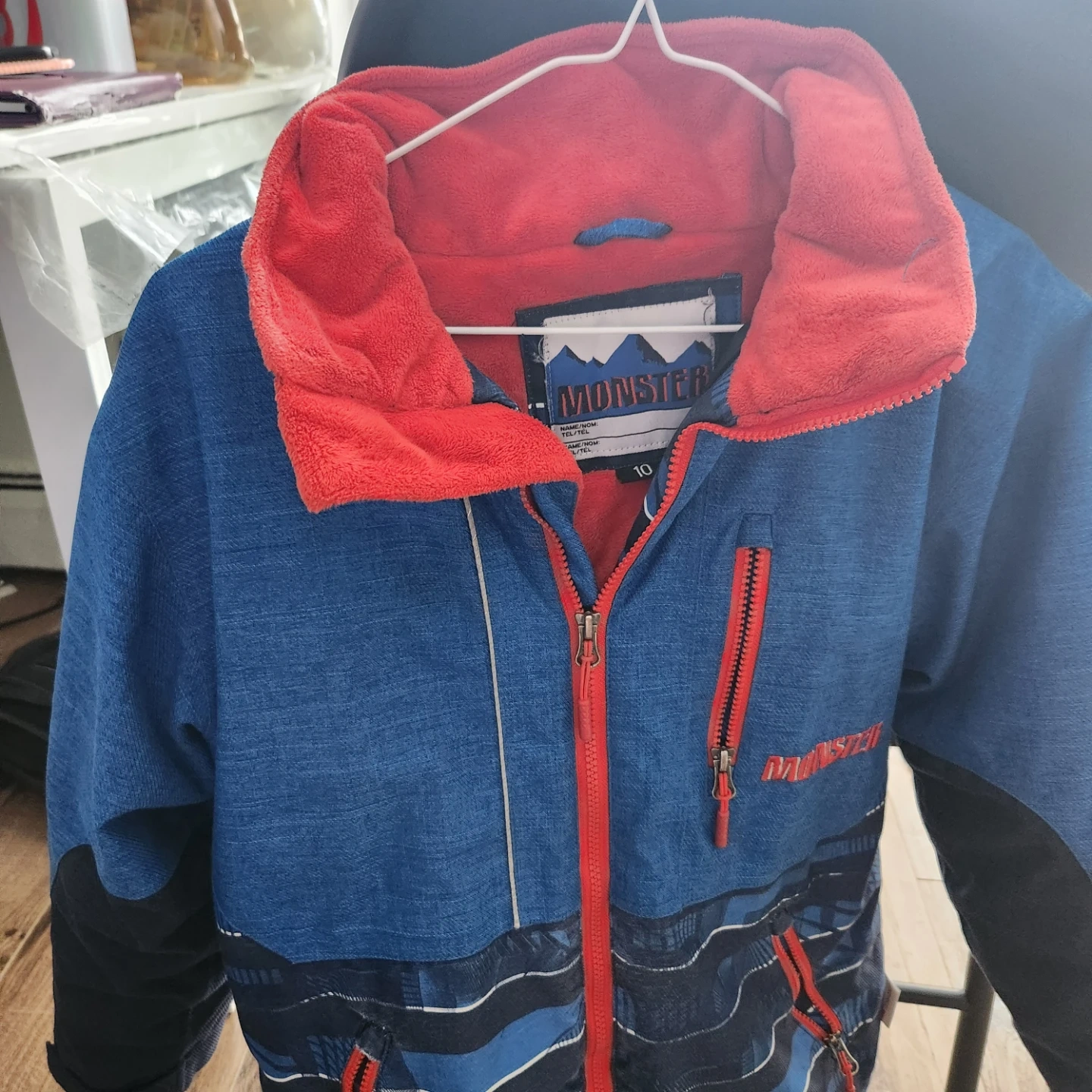 Selling a gently used Monster brand snow jacket and pants set for kids. The jacket is a vibrant blue with red accents and a cozy red fleece lining. The pants feature a cool geometric pattern in shades of blue and grey. Both are size 10 and ready for some winter fun! But pant is size 8