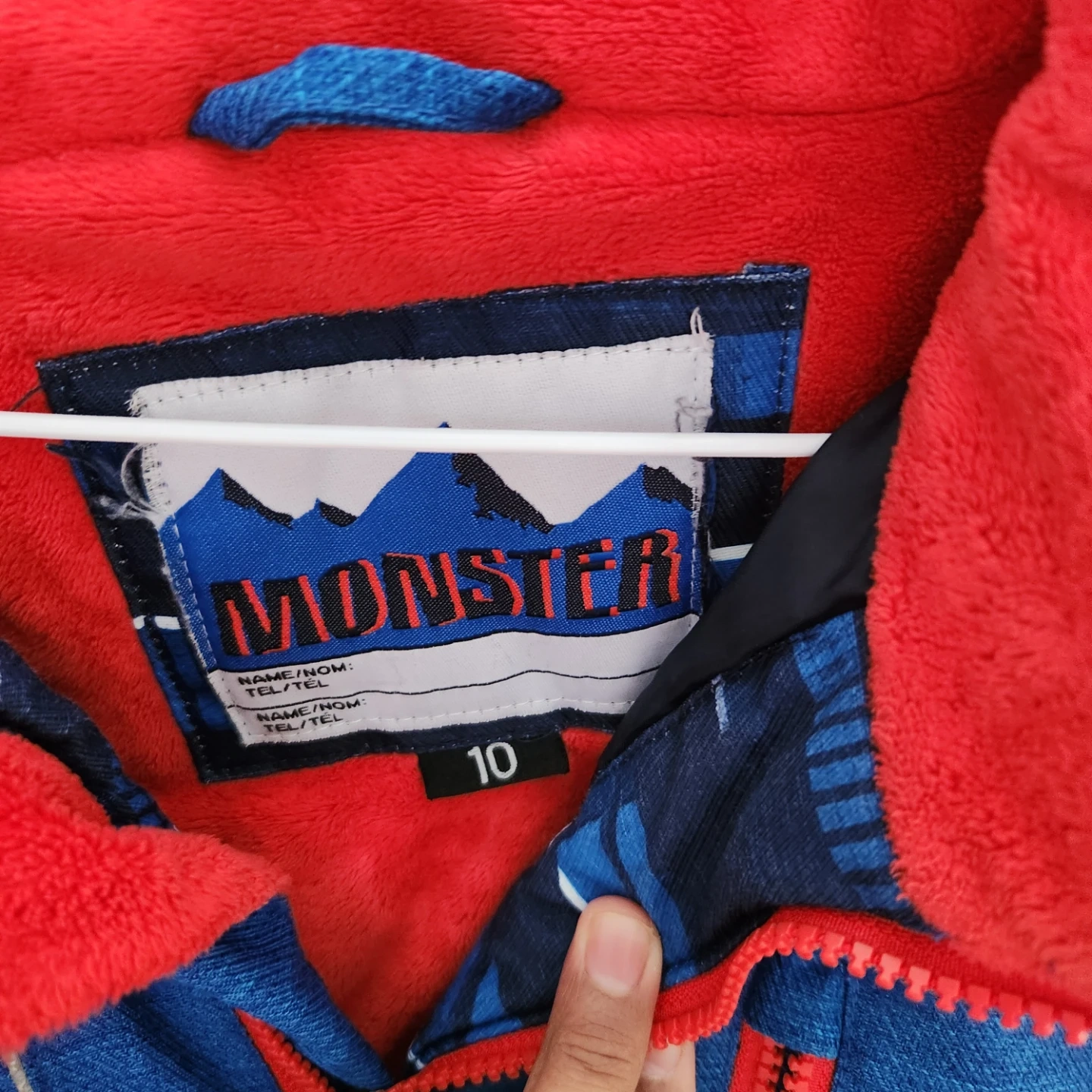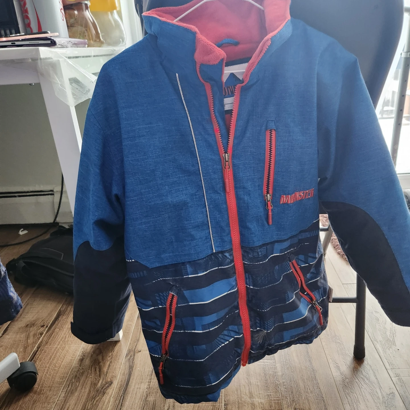 Selling a gently used Monster brand snow jacket and pants set for kids. The jacket is a vibrant blue with red accents and a cozy red fleece lining. The pants feature a cool geometric pattern in shades of blue and grey. Both are size 10 and ready for some winter fun! But pant is size 8
