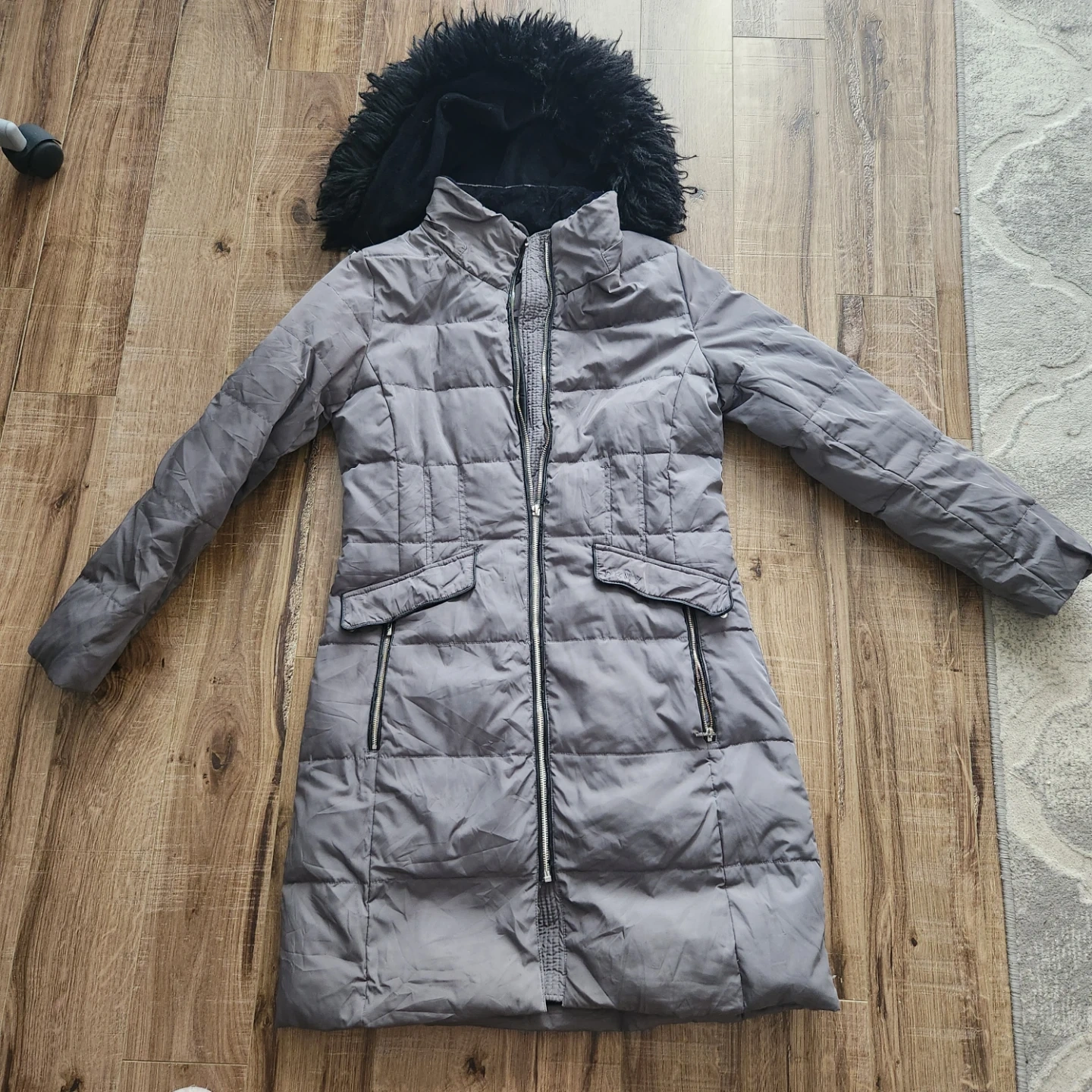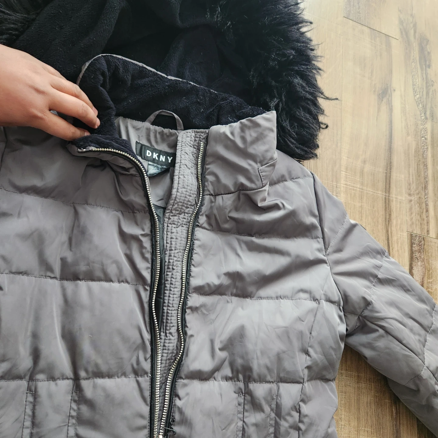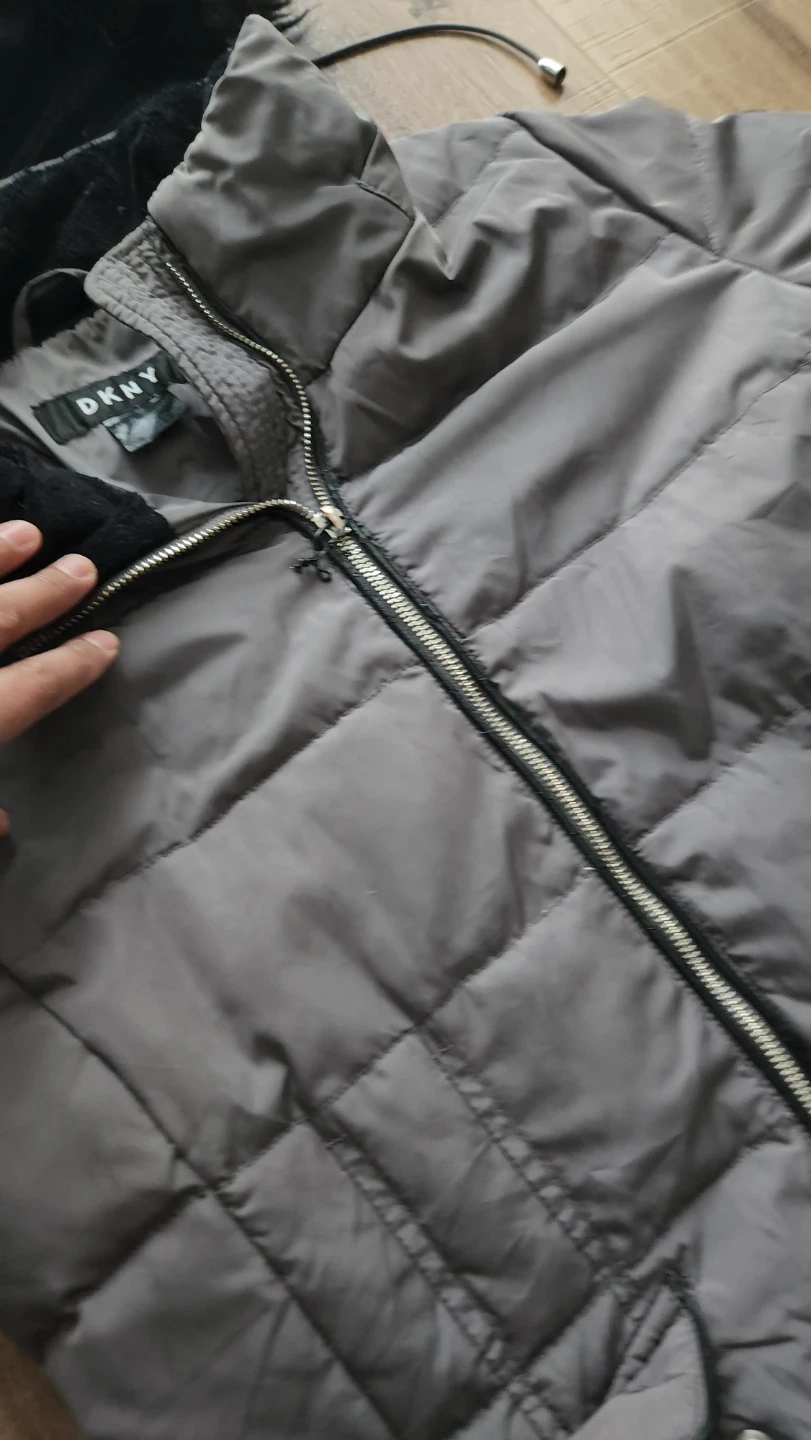 Cozy DKNY puffer jacket in size XS! It's a stylish and warm choice for those chilly Canadian days. The jacket features a faux fur-trimmed hood and a sleek design. Perfect for staying snug and fashionable!
