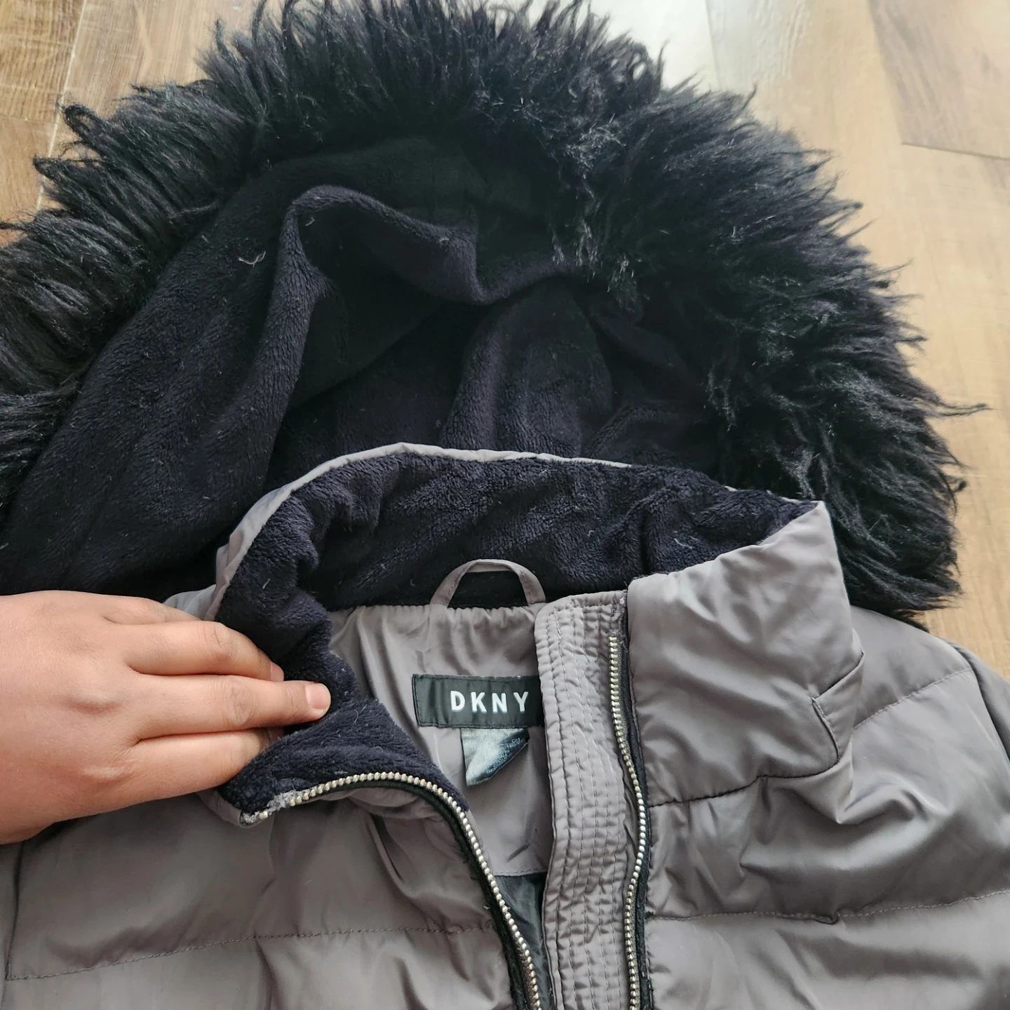 Cozy DKNY puffer jacket in size XS! It's a stylish and warm choice for those chilly Canadian days. The jacket features a faux fur-trimmed hood and a sleek design. Perfect for staying snug and fashionable!