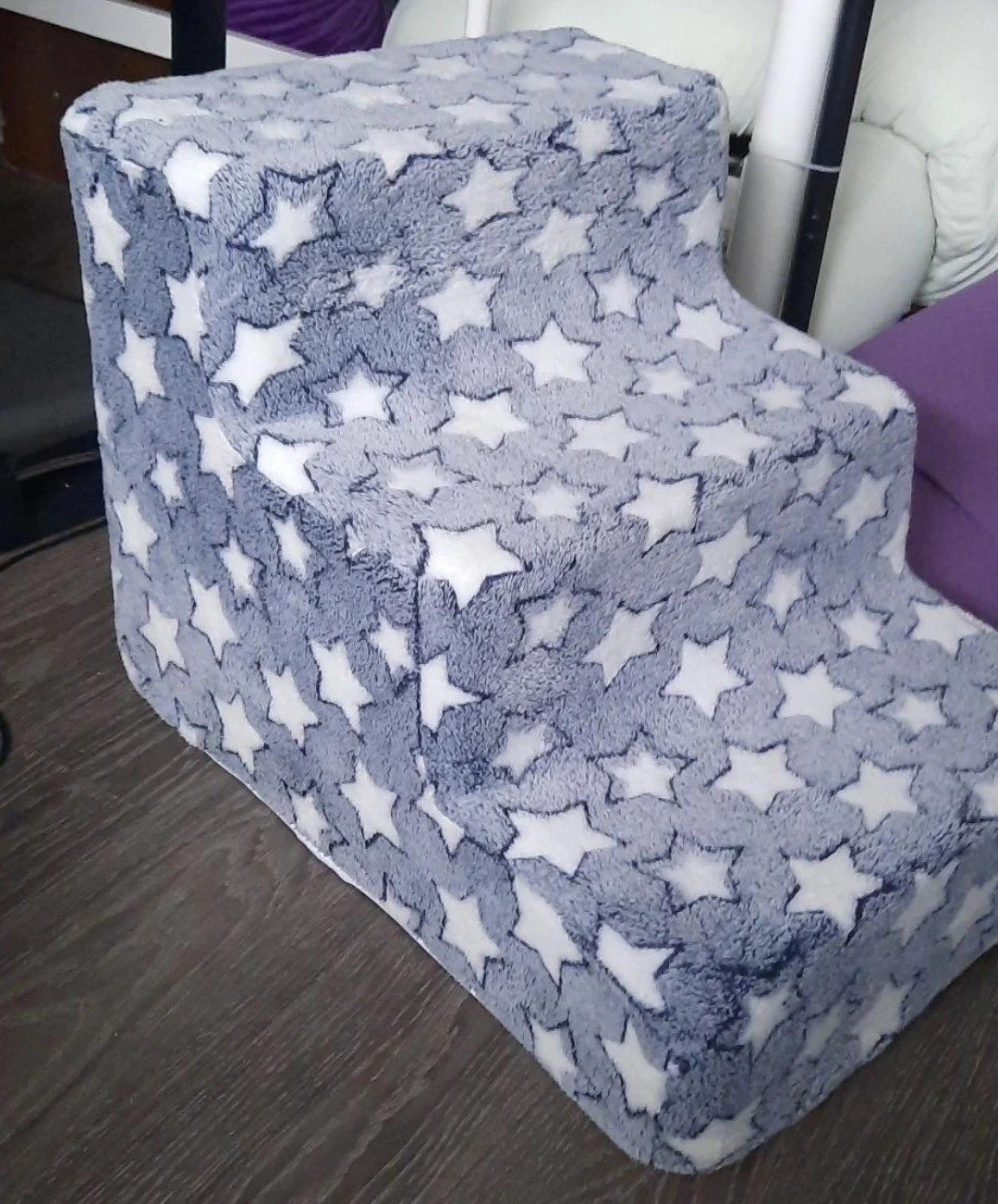Pet steps with a cute star pattern. In great condition, perfect for helping your furry friend reach higher places with ease. The inside is a kind of foam that is very firm. Approx. 16" tall, 22" x 15" base.
