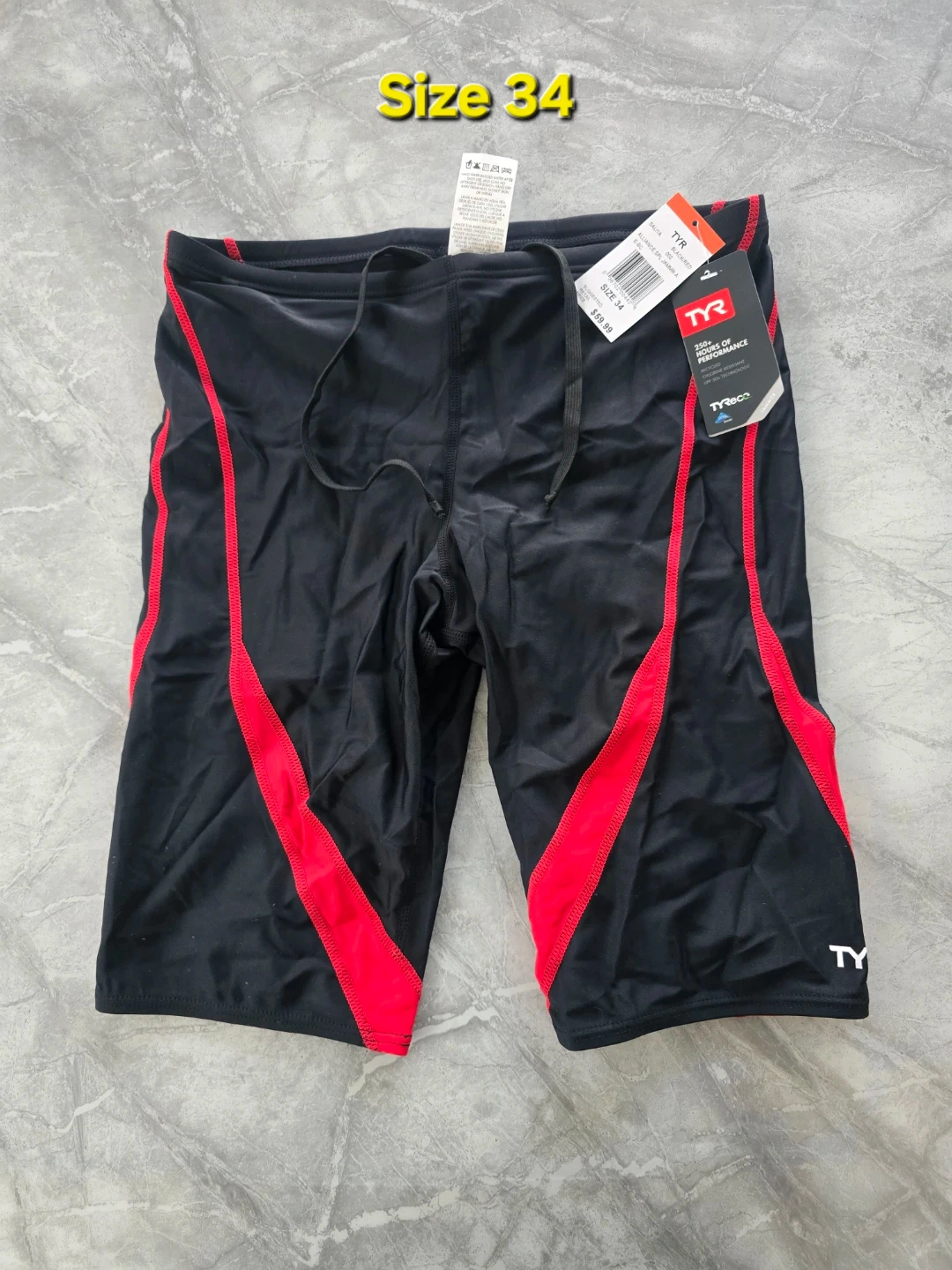 Selling a TYR jammer swimsuit, size 34. It's in black with red accents. Great for competitive swimming or training!
