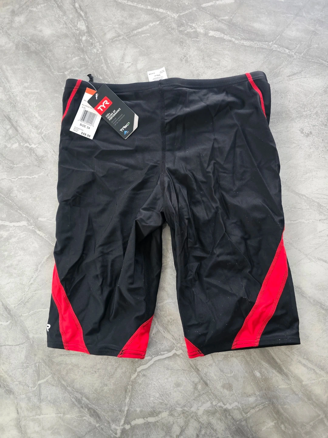 Selling a TYR jammer swimsuit, size 34. It's in black with red accents. Great for competitive swimming or training!