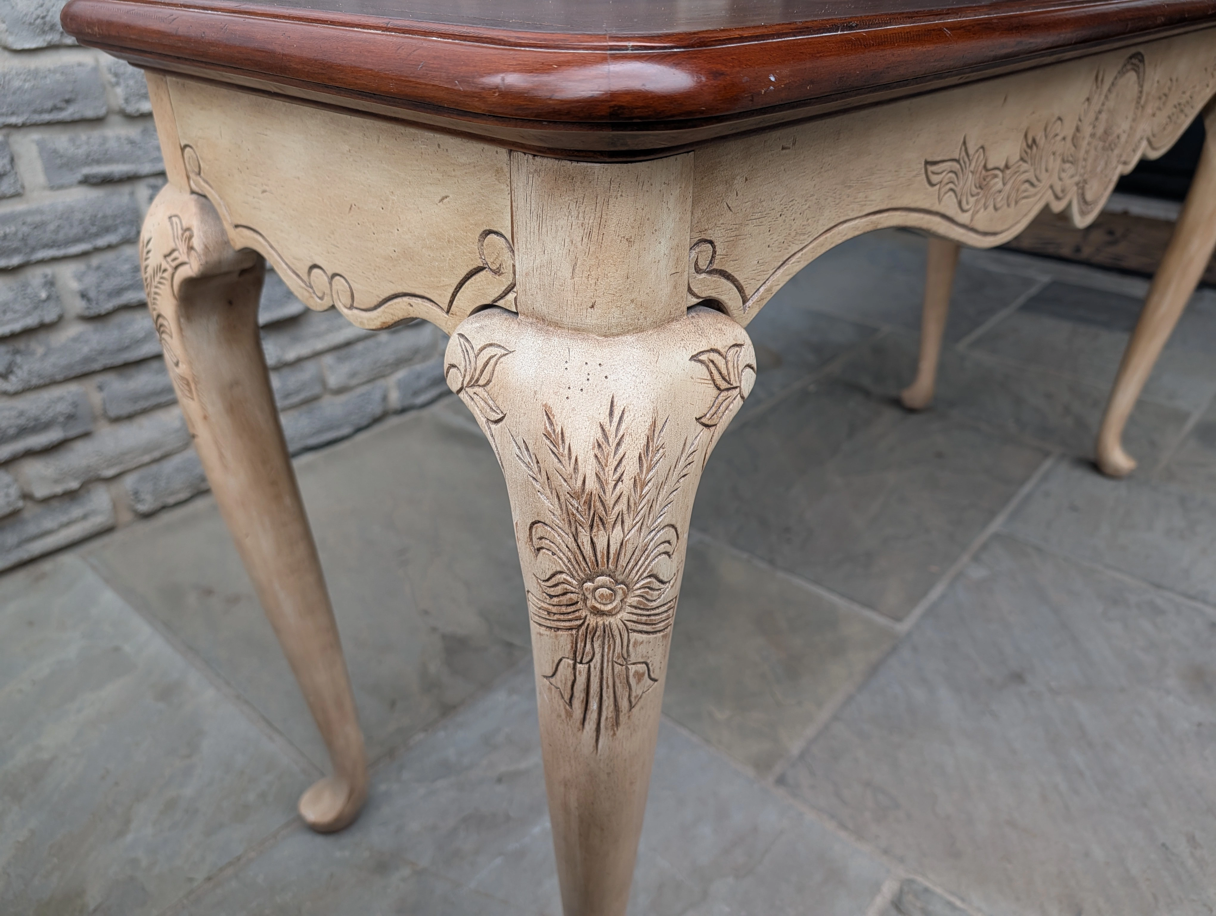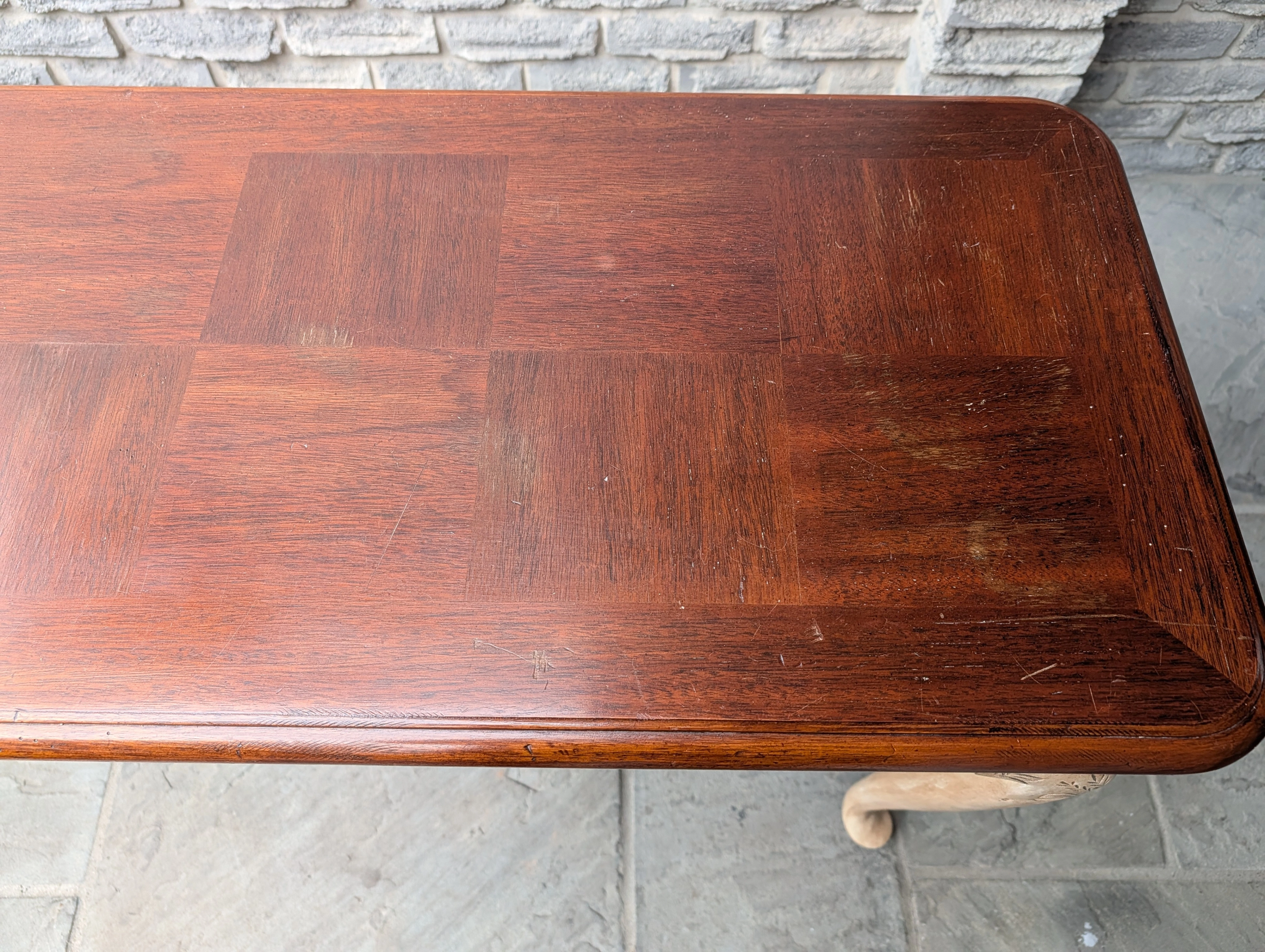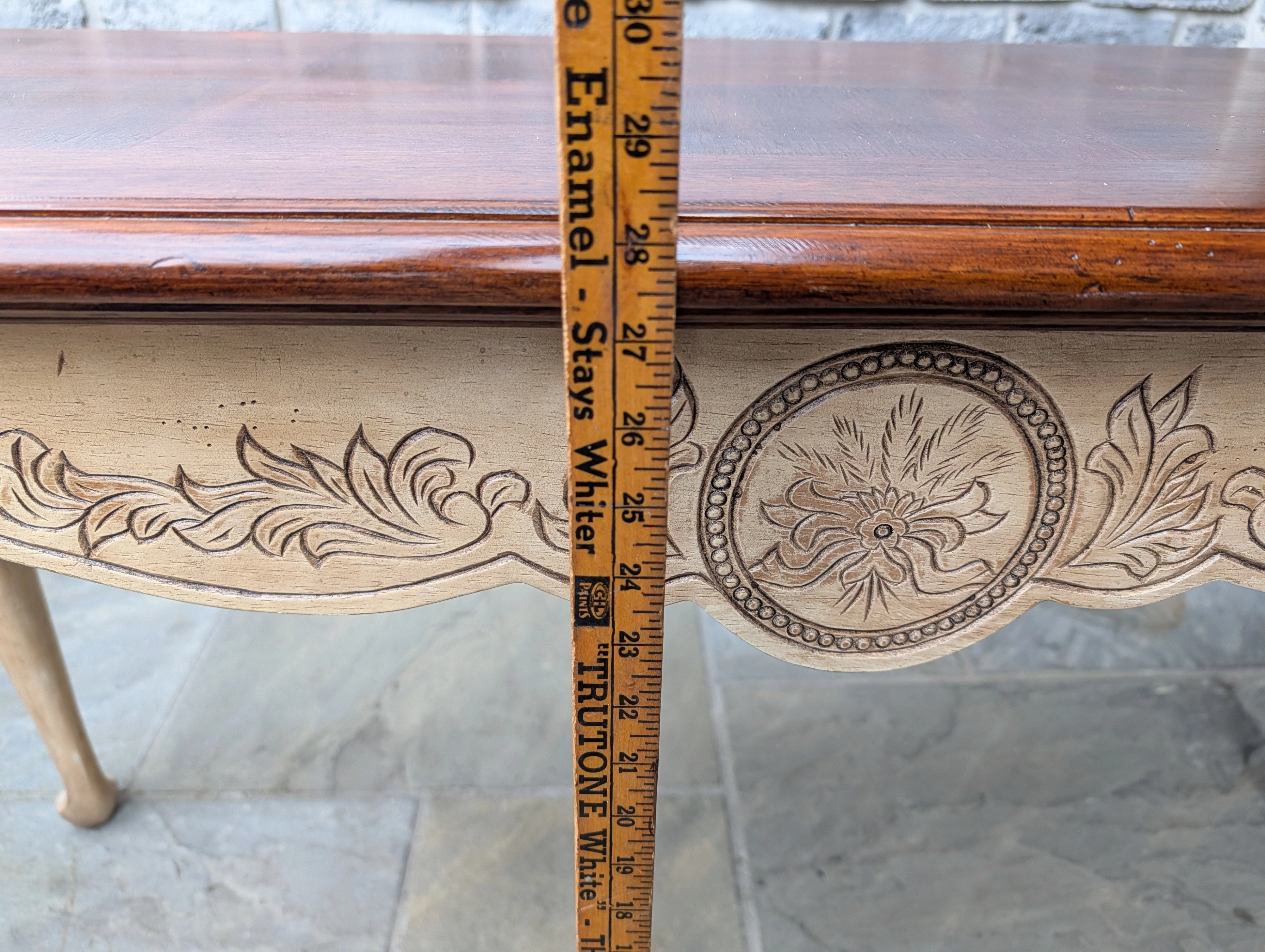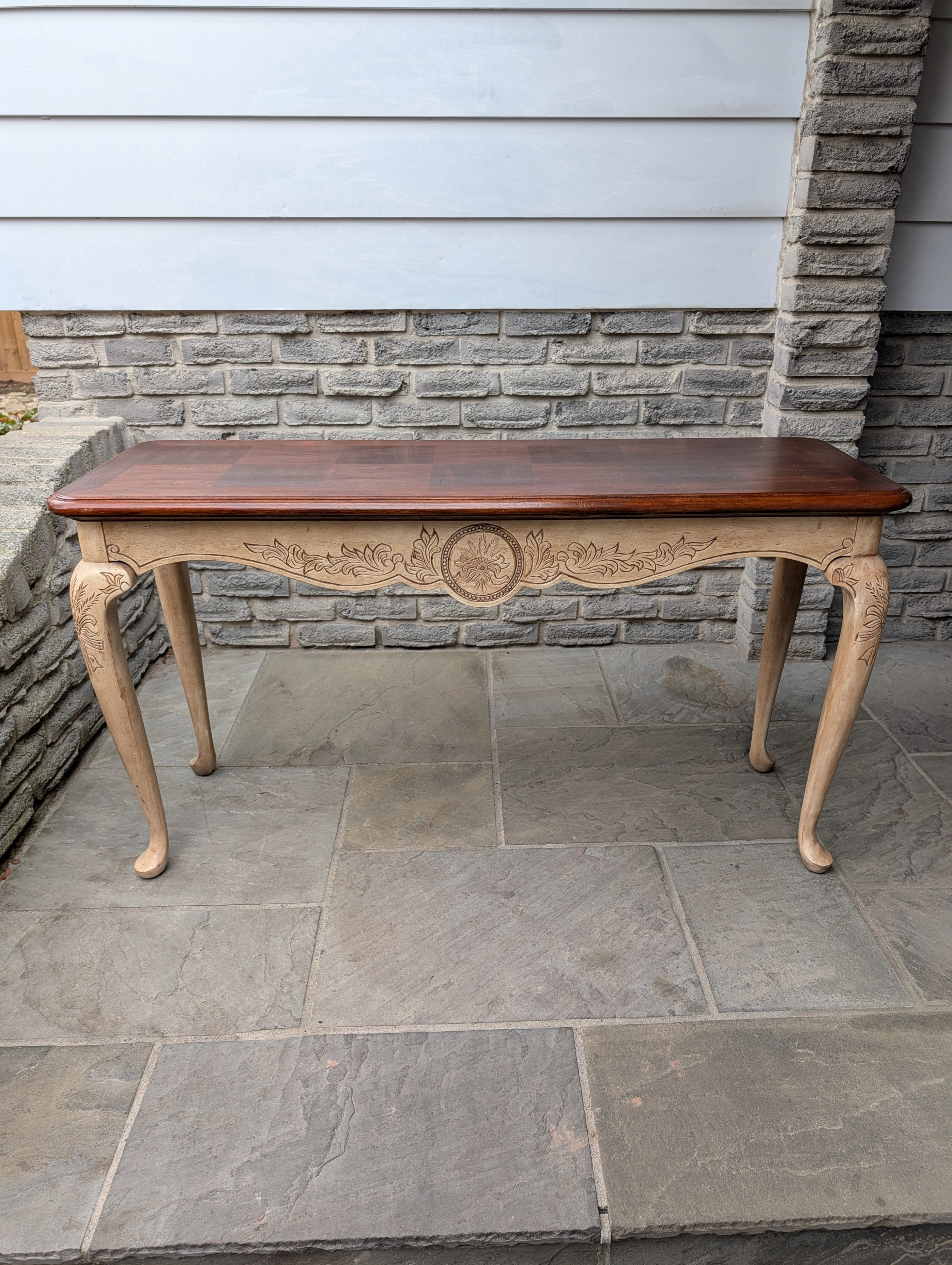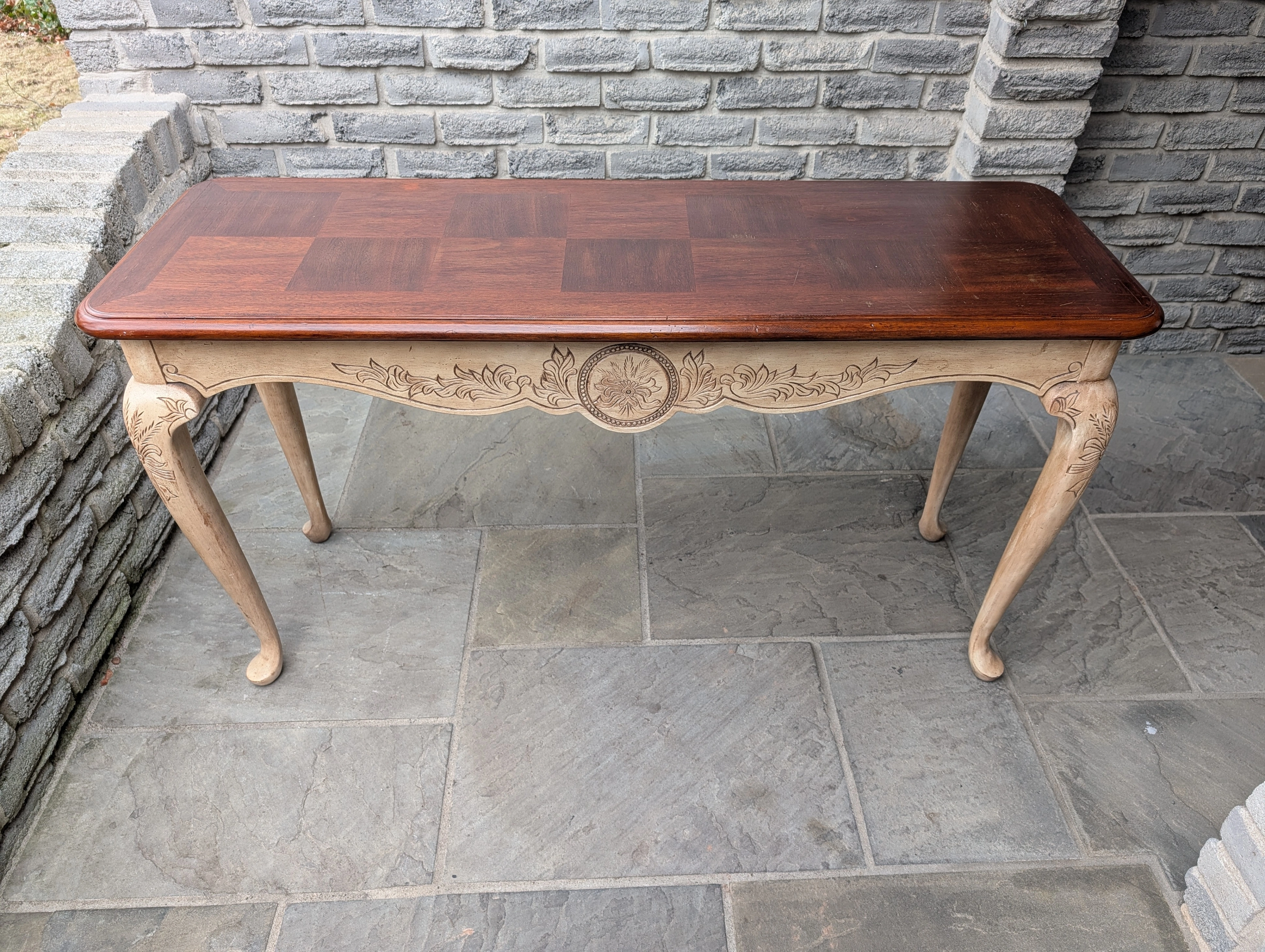 Ornate accent side table with engraved carved out design on the wood base. Good hallway or behind the couch table. Some light wear on the table top finish. Good, clean condition. 1 available only. Pick up in Guelph Line and Upper Middle Rd area of Burlington.