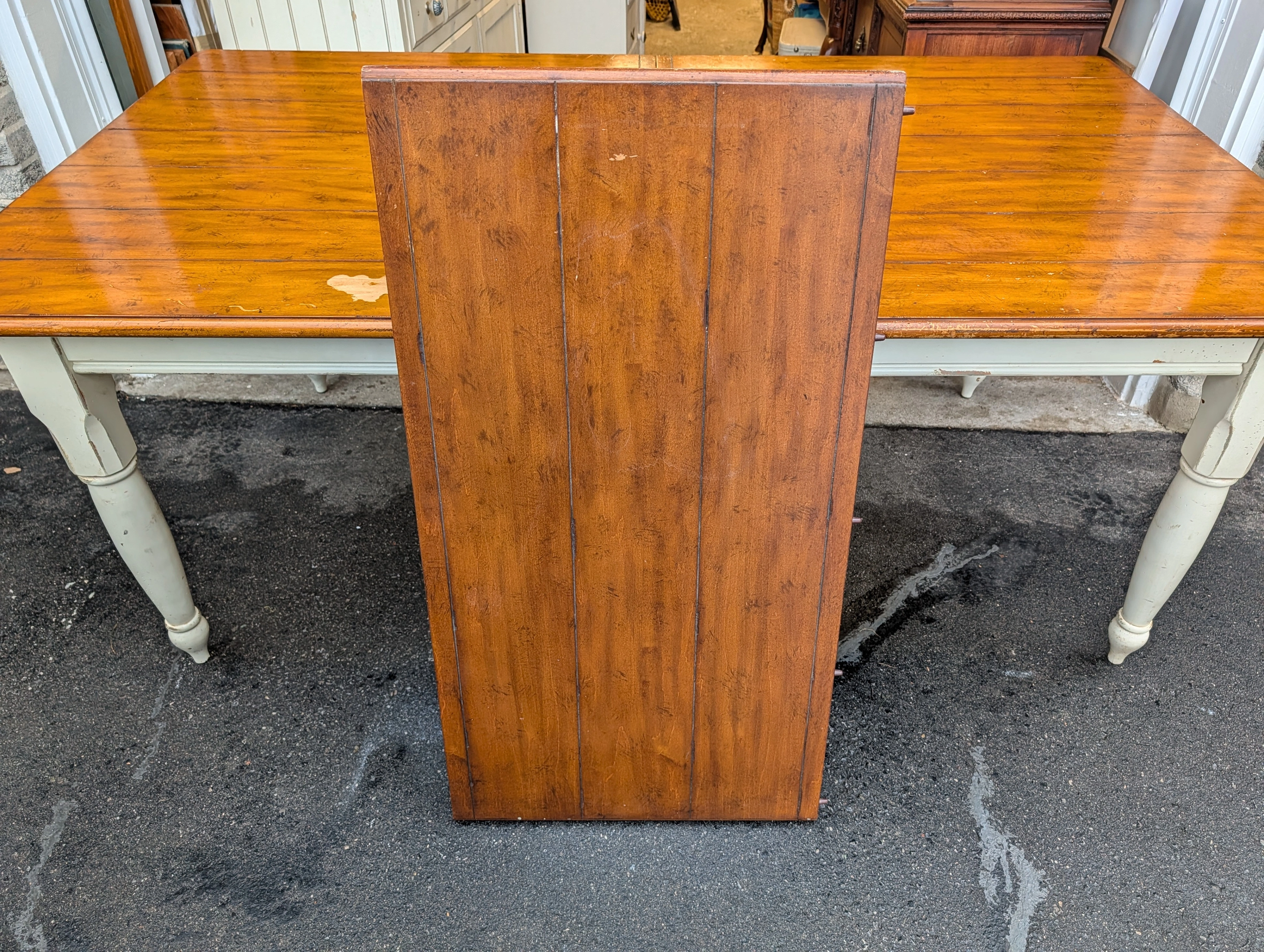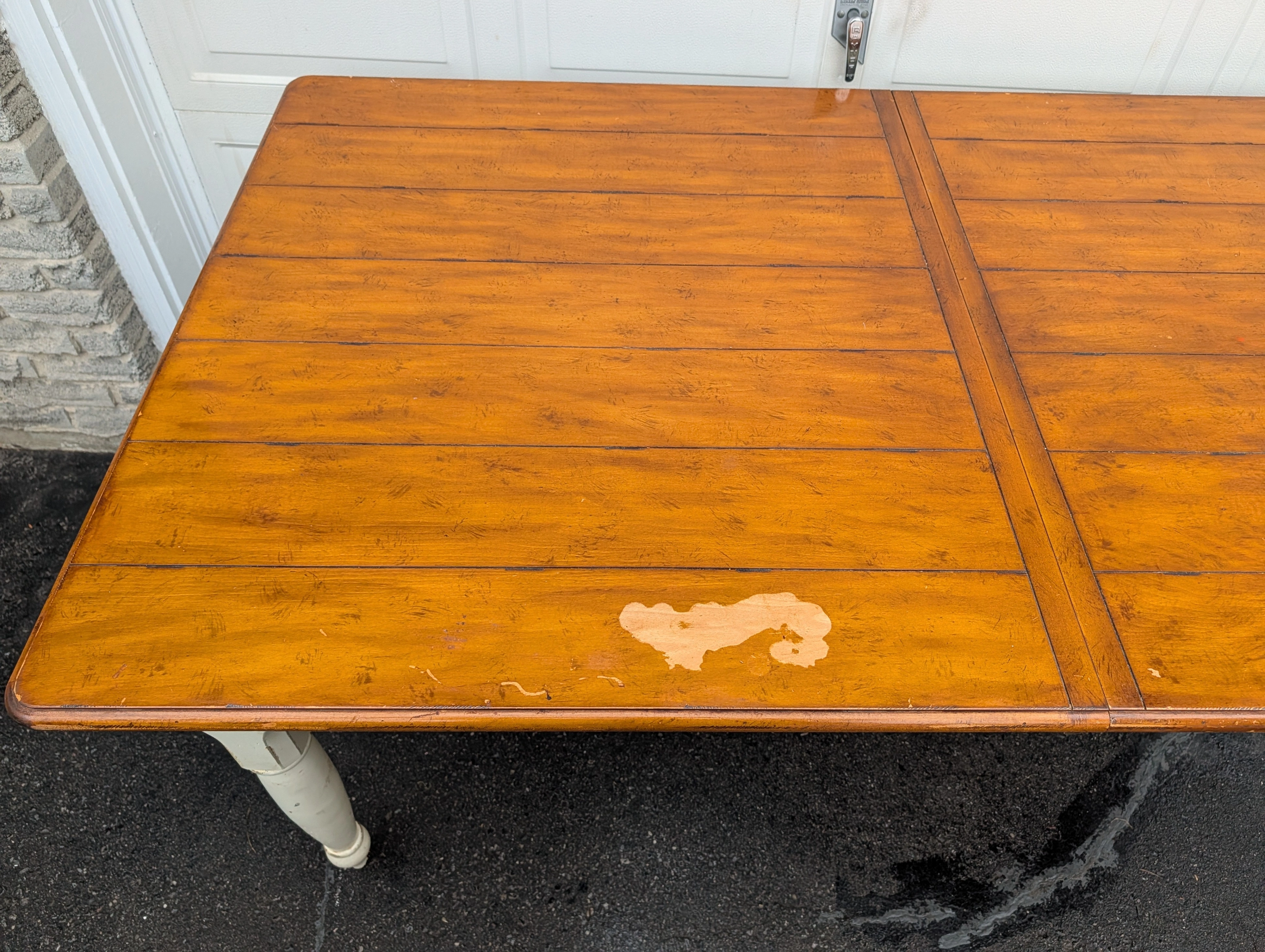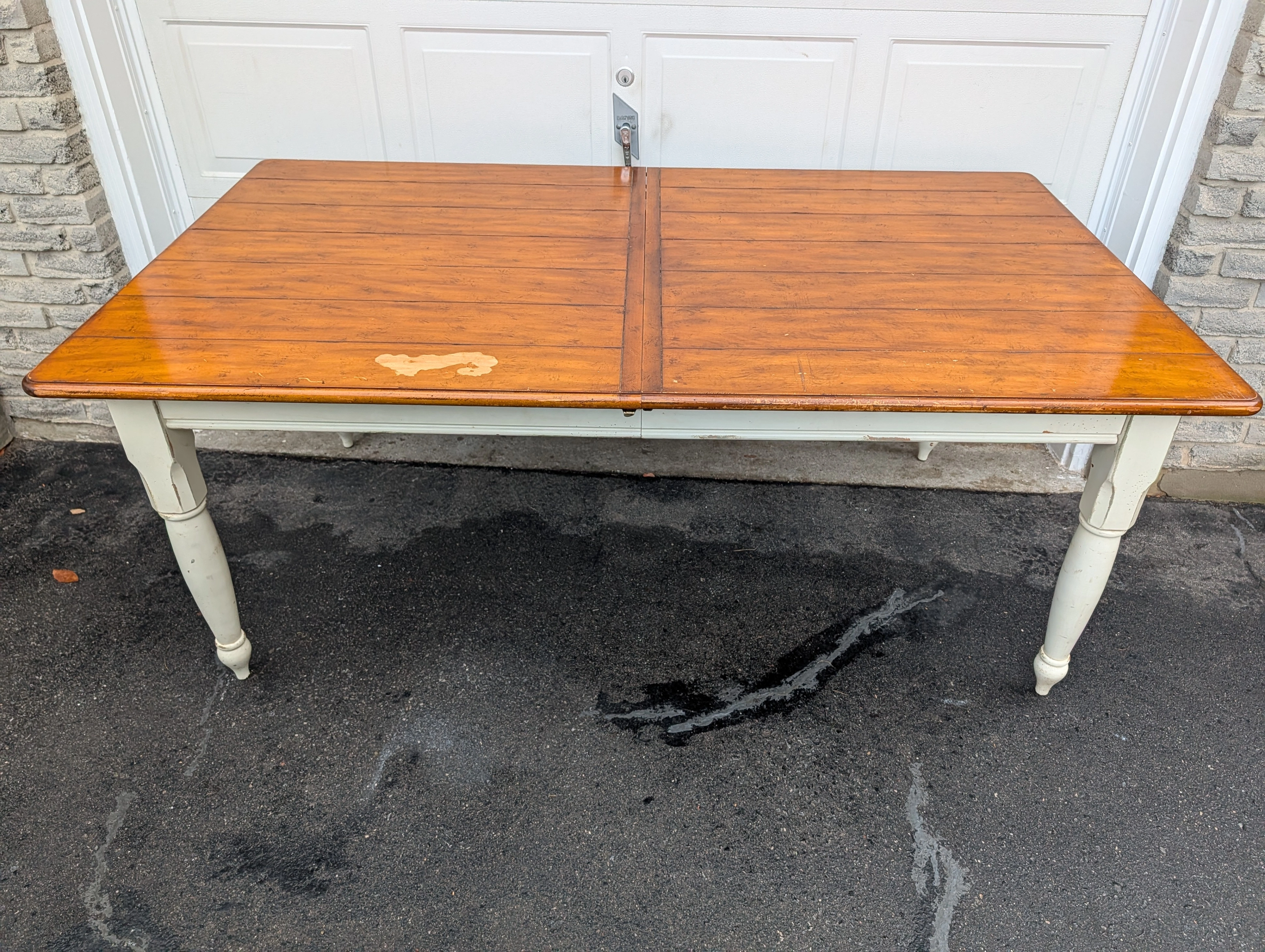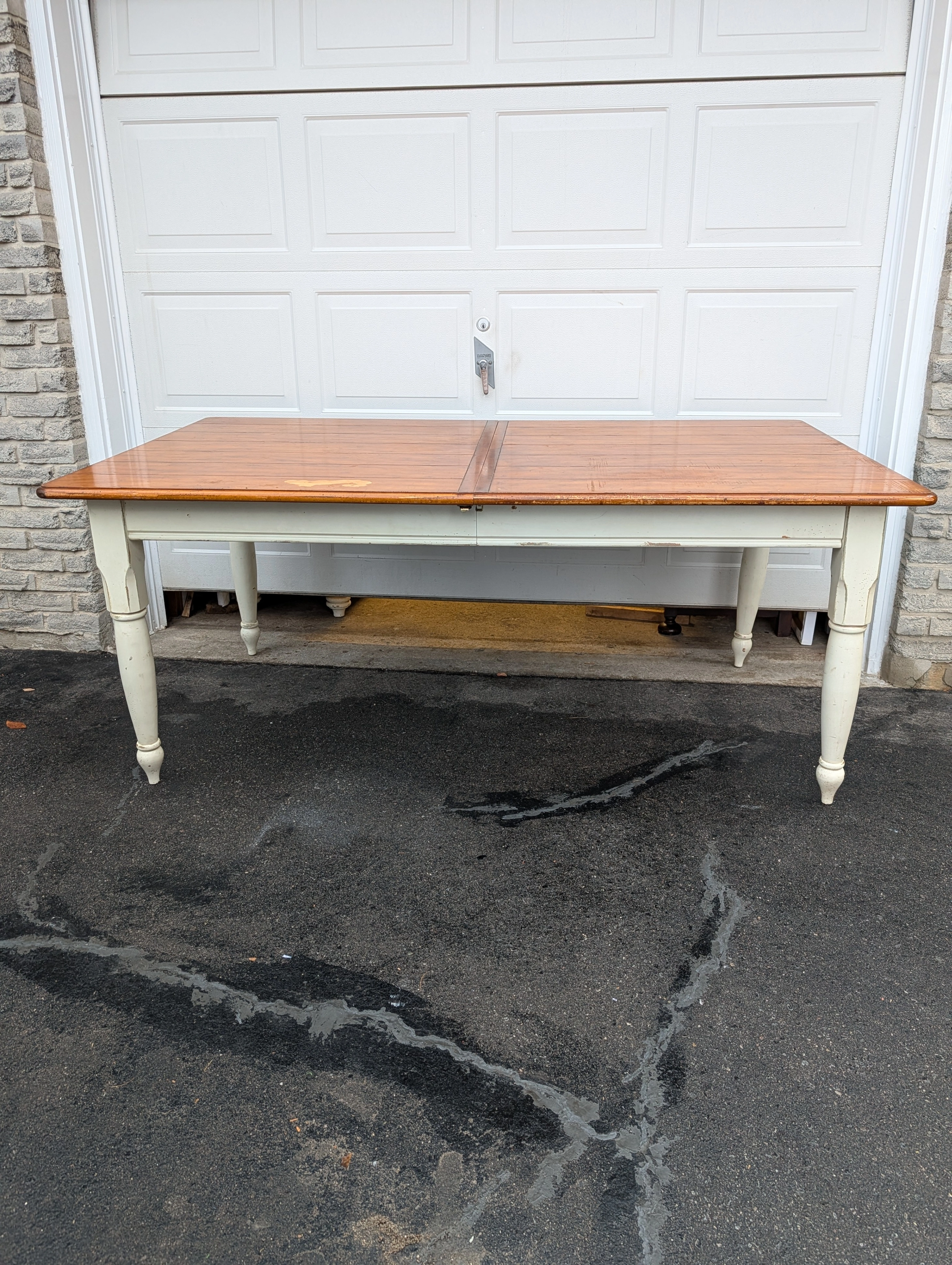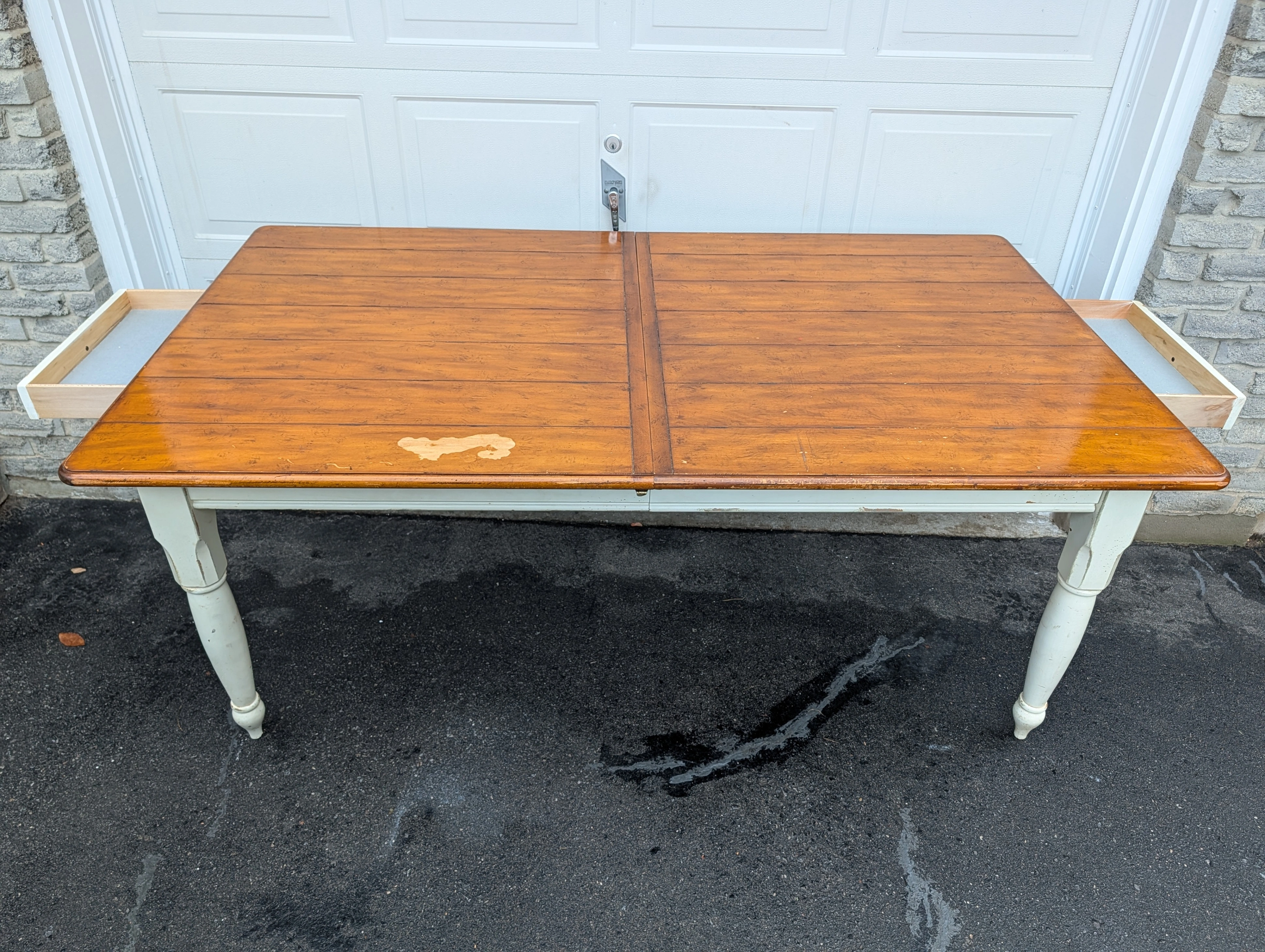 Large solid pine wood, country Harvest style kitchen table with leaf and end cutlery drawers. From Drexel Studio Furniture Company. Heavy duty table with some weathering and noticeable wear on the table top. Beautiful and usable as is or refinish. Legs come off for easier transport. Pick up only in the Guelph Line and Upper Middle Rd area in Burlington.