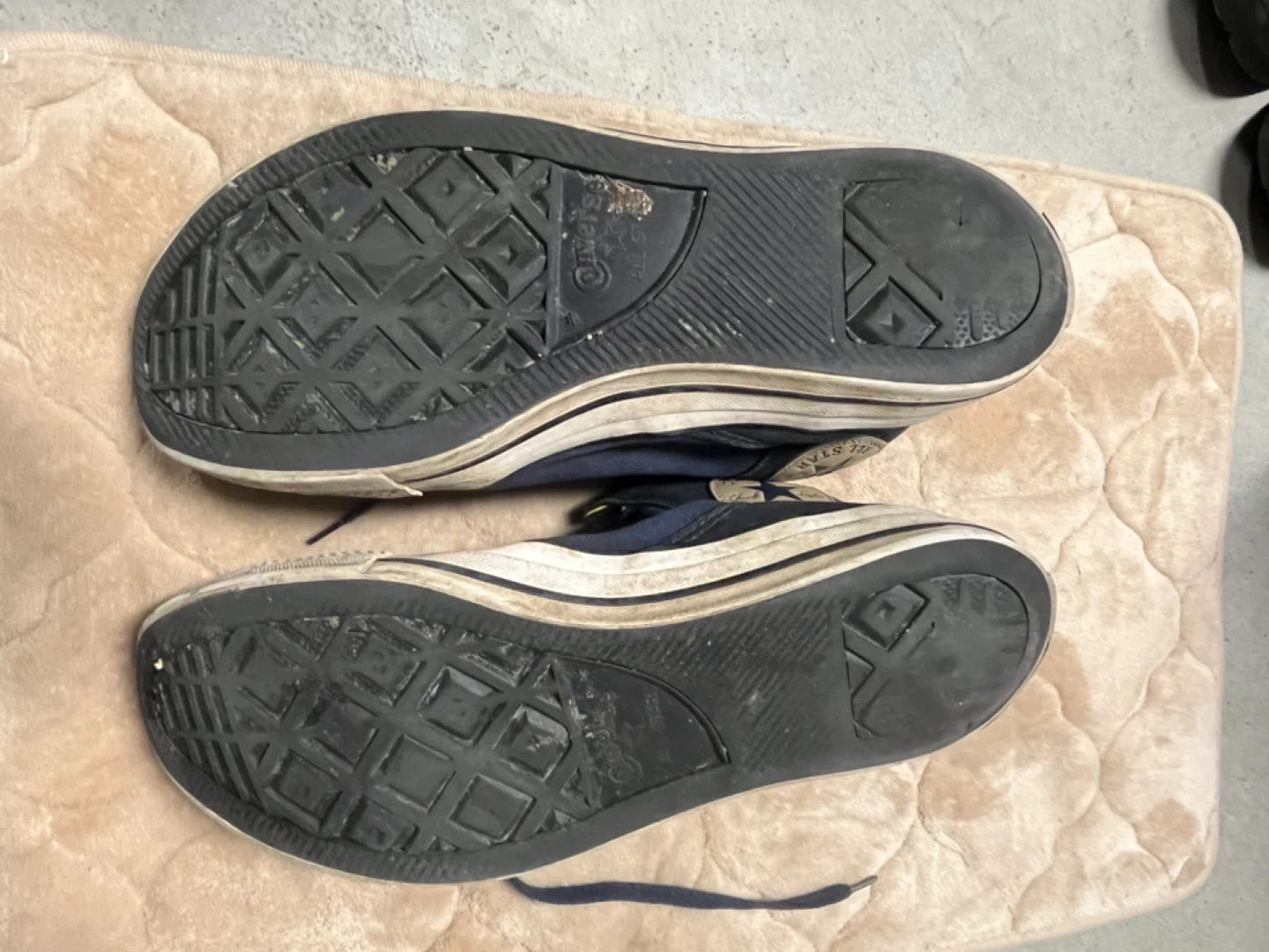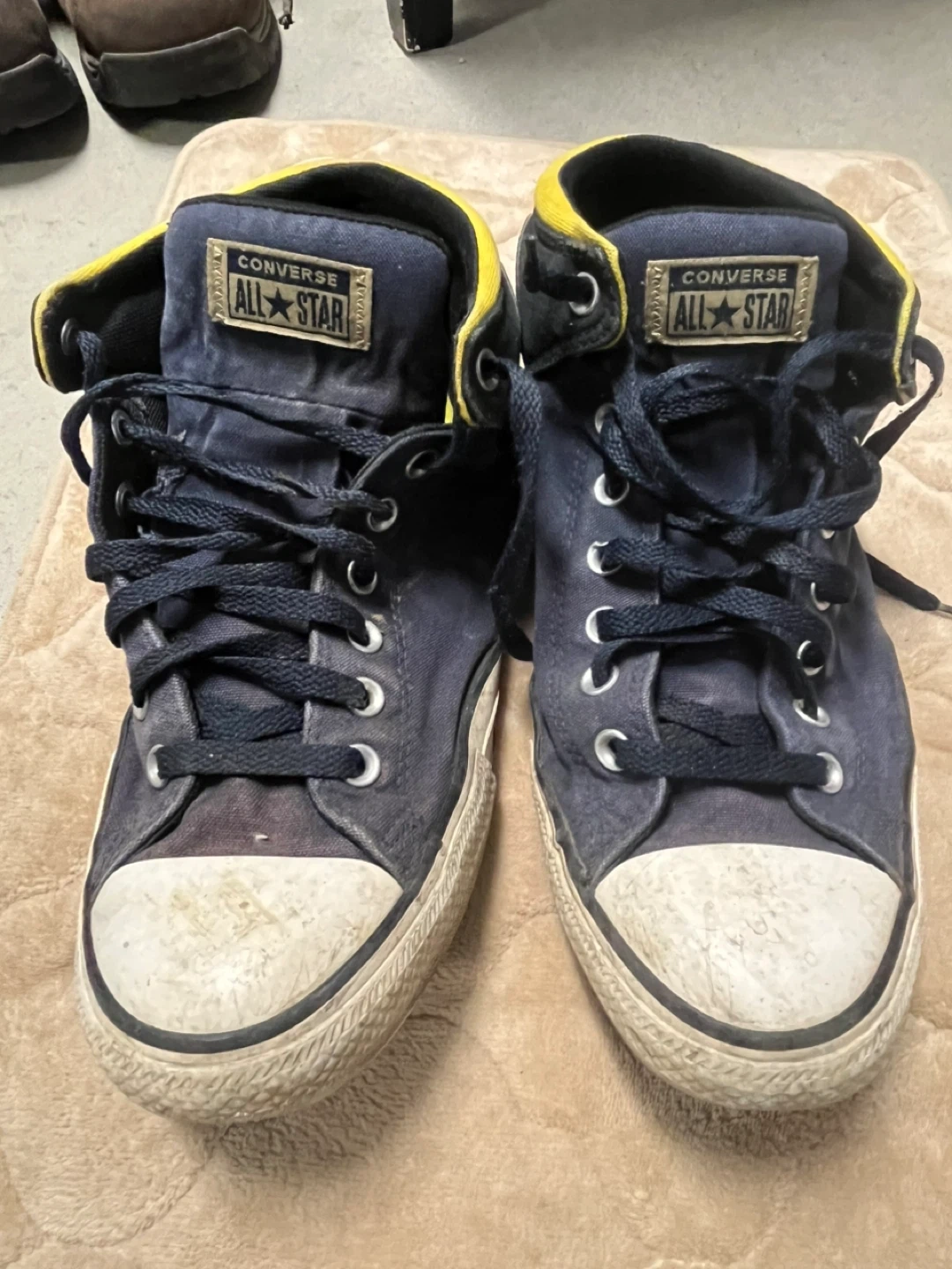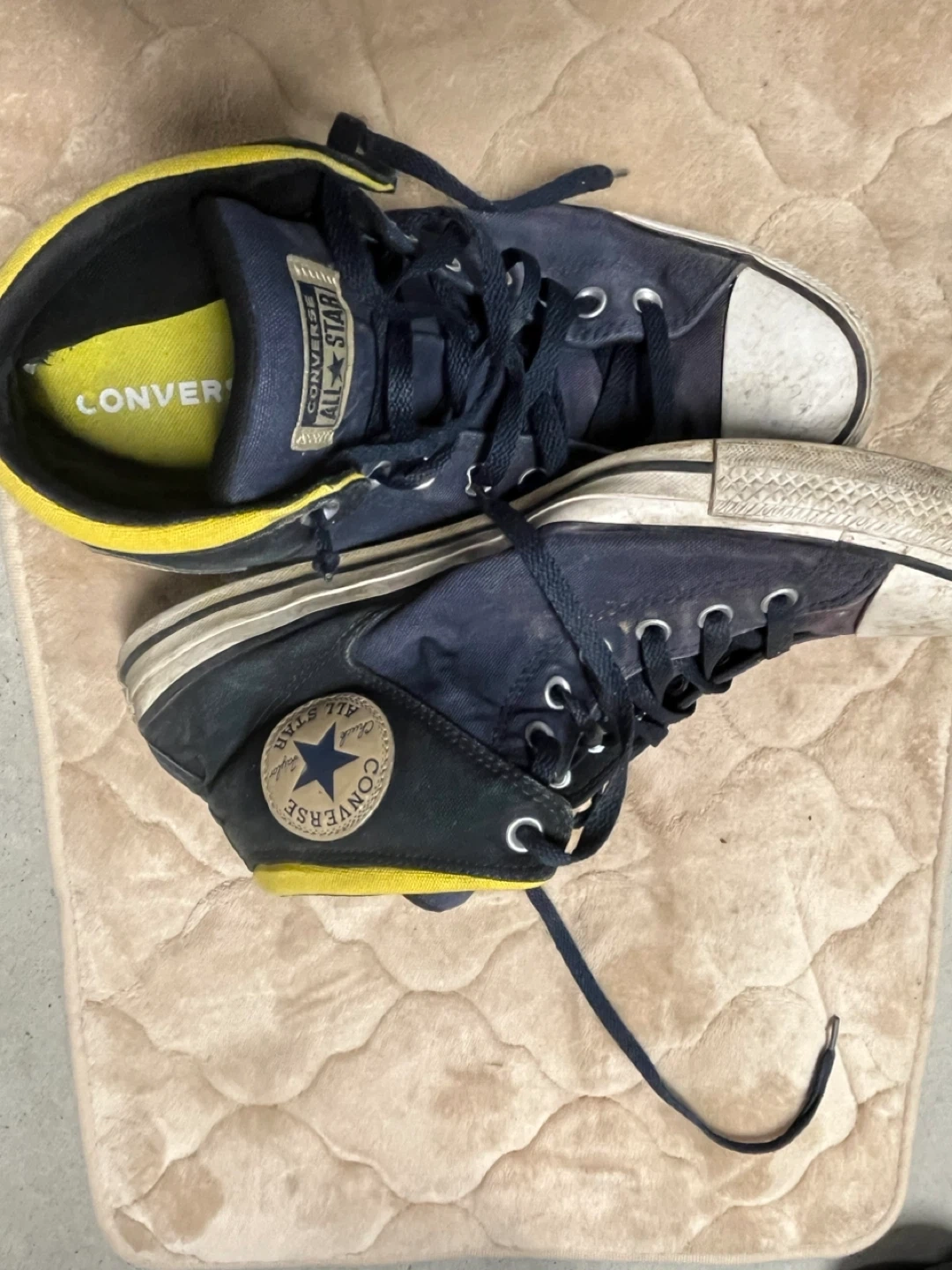 Selling a pair of Converse All Star high tops in size 11.5. They have a navy blue colour with yellow accents. Please see photos for condition