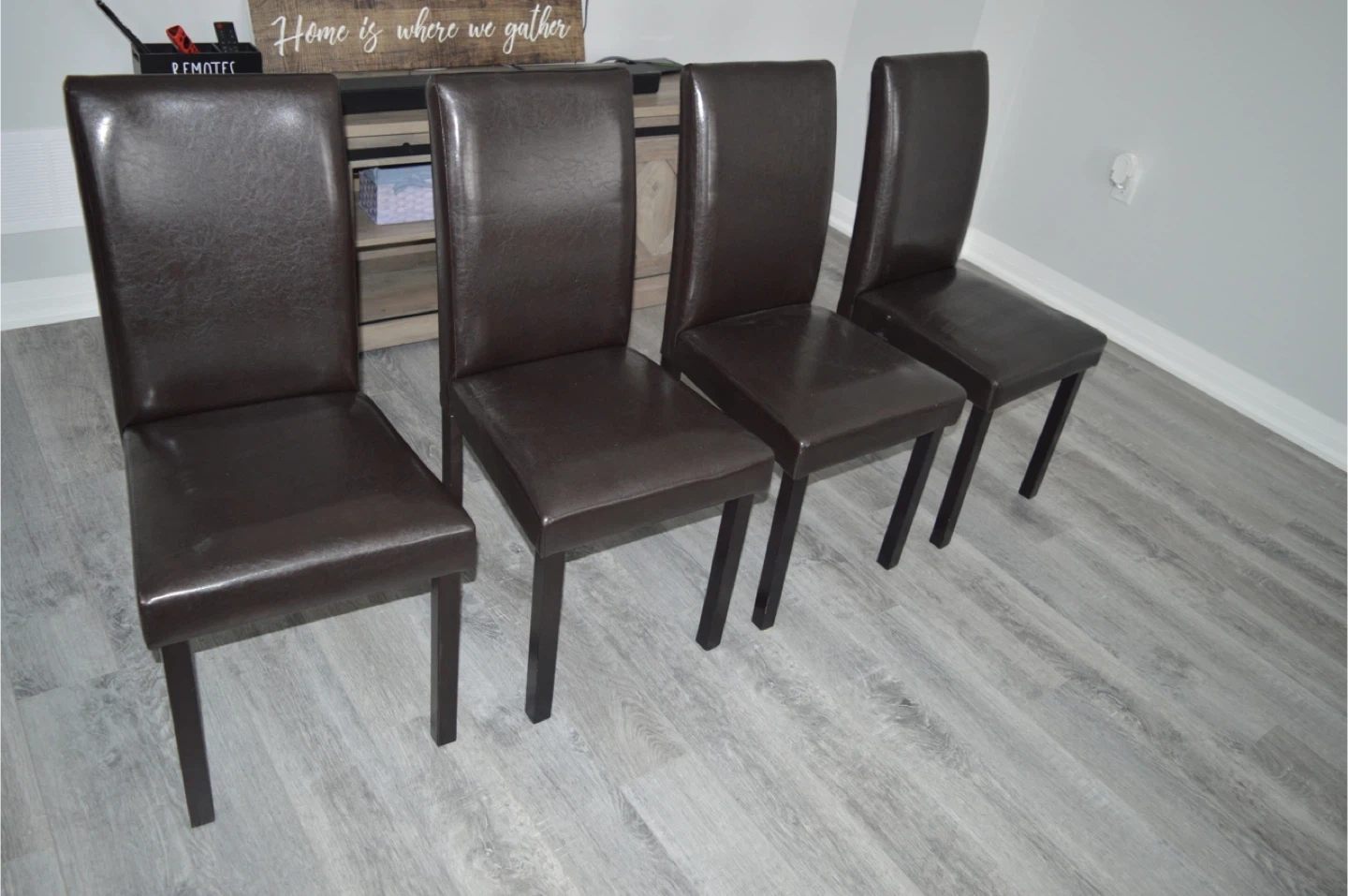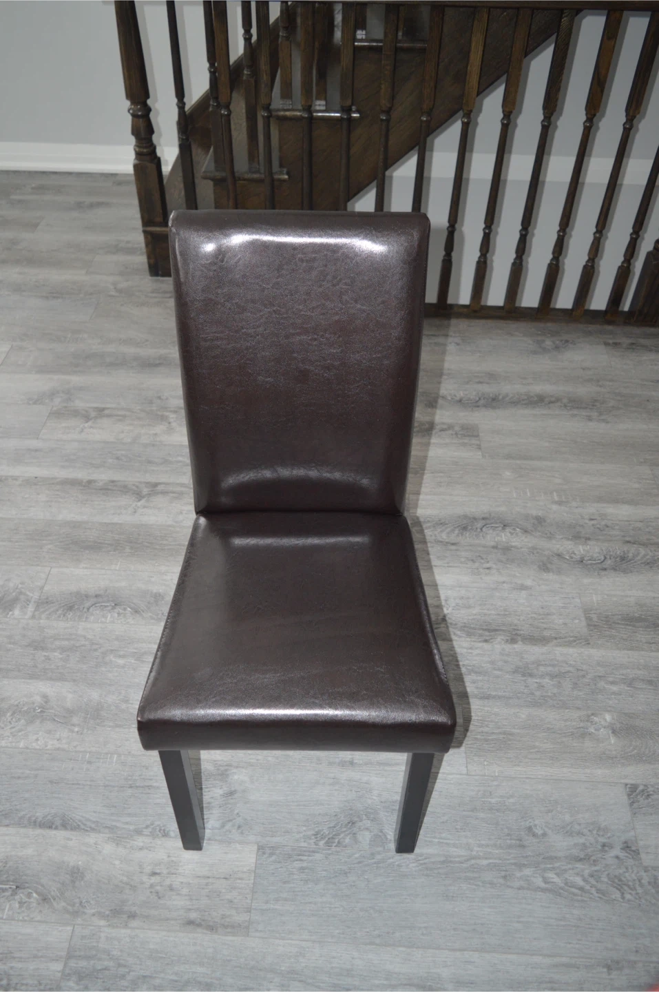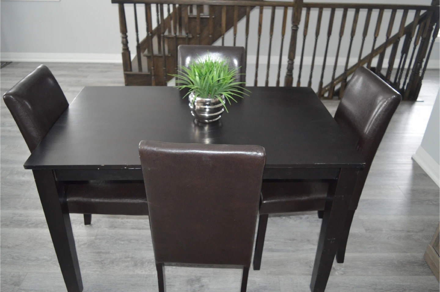 Selling a dining table with four matching leather chairs. The chairs are a dark brown colour and are in good condition. The table is a dark colour as well. Perfect for a small dining space! Minor scratches.