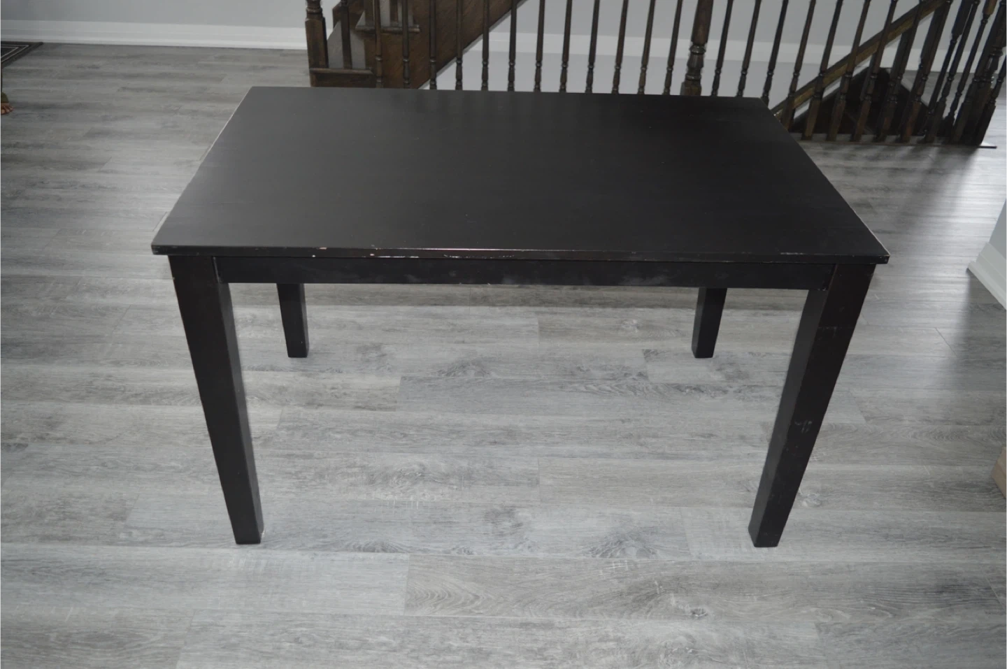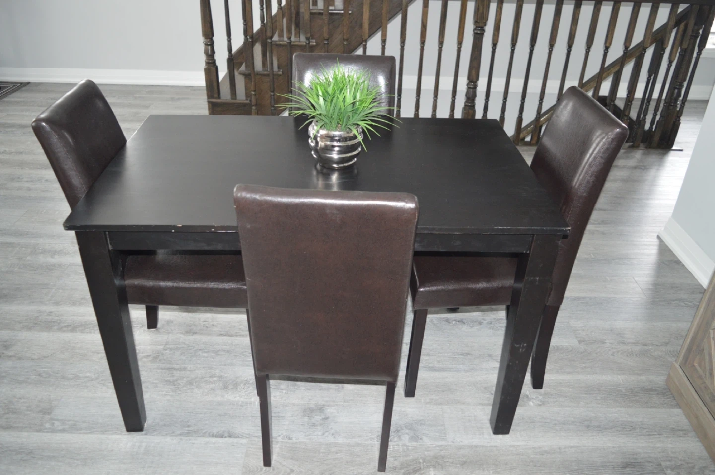 Selling a dining table with four matching leather chairs. The chairs are a dark brown colour and are in good condition. The table is a dark colour as well. Perfect for a small dining space! Minor scratches.