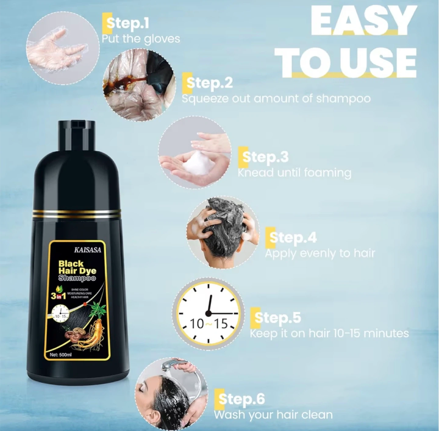 Fácil de usar: no necesita un tazón o cepillo. Simplemente ponga guantes y use nuestro champú para tinte de cabello como un champú normal. Espera de 15 a 20 minutos (20 minutos para una cobertura completa de las canas) y nuestro champú cubrirá todas tus canas sin manchar tu piel.