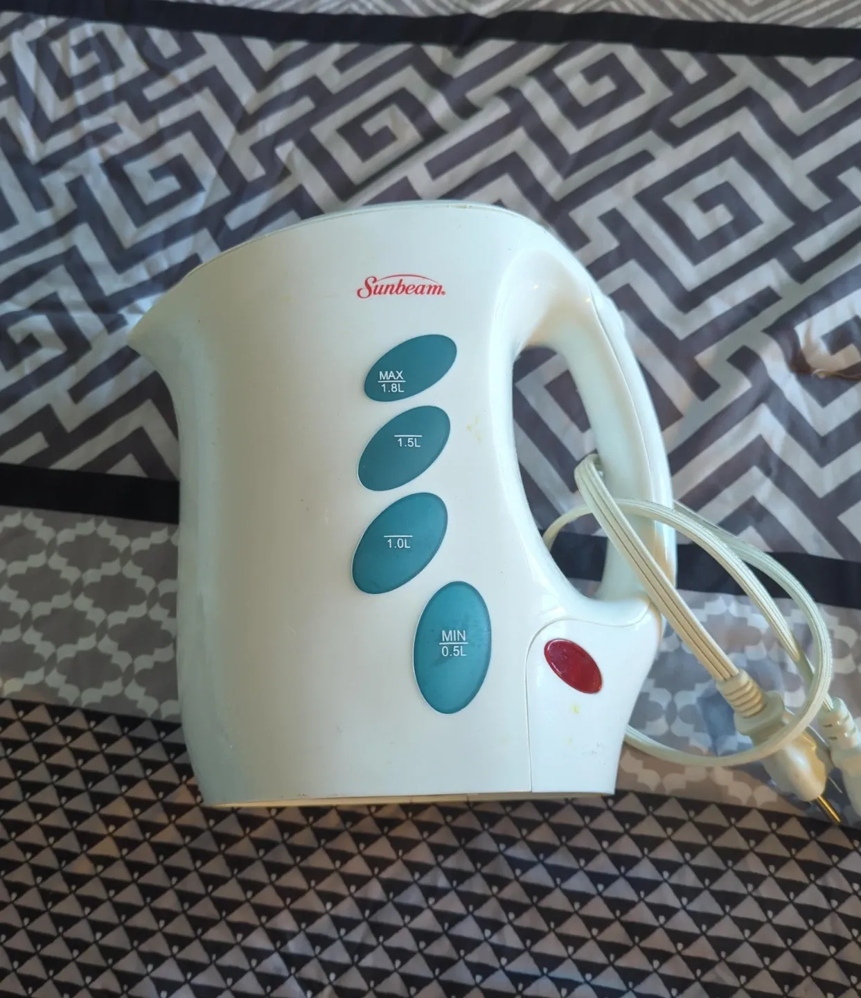 Selling a Sunbeam electric kettle in white. It has a water level indicator with markings for: