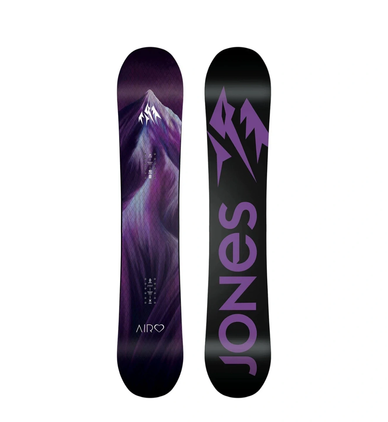 Selling a Jones Air Heart snowboard in purple and black. This board is perfect for hitting the slopes this winter season! The design features a mountain graphic and the Jones logo.
