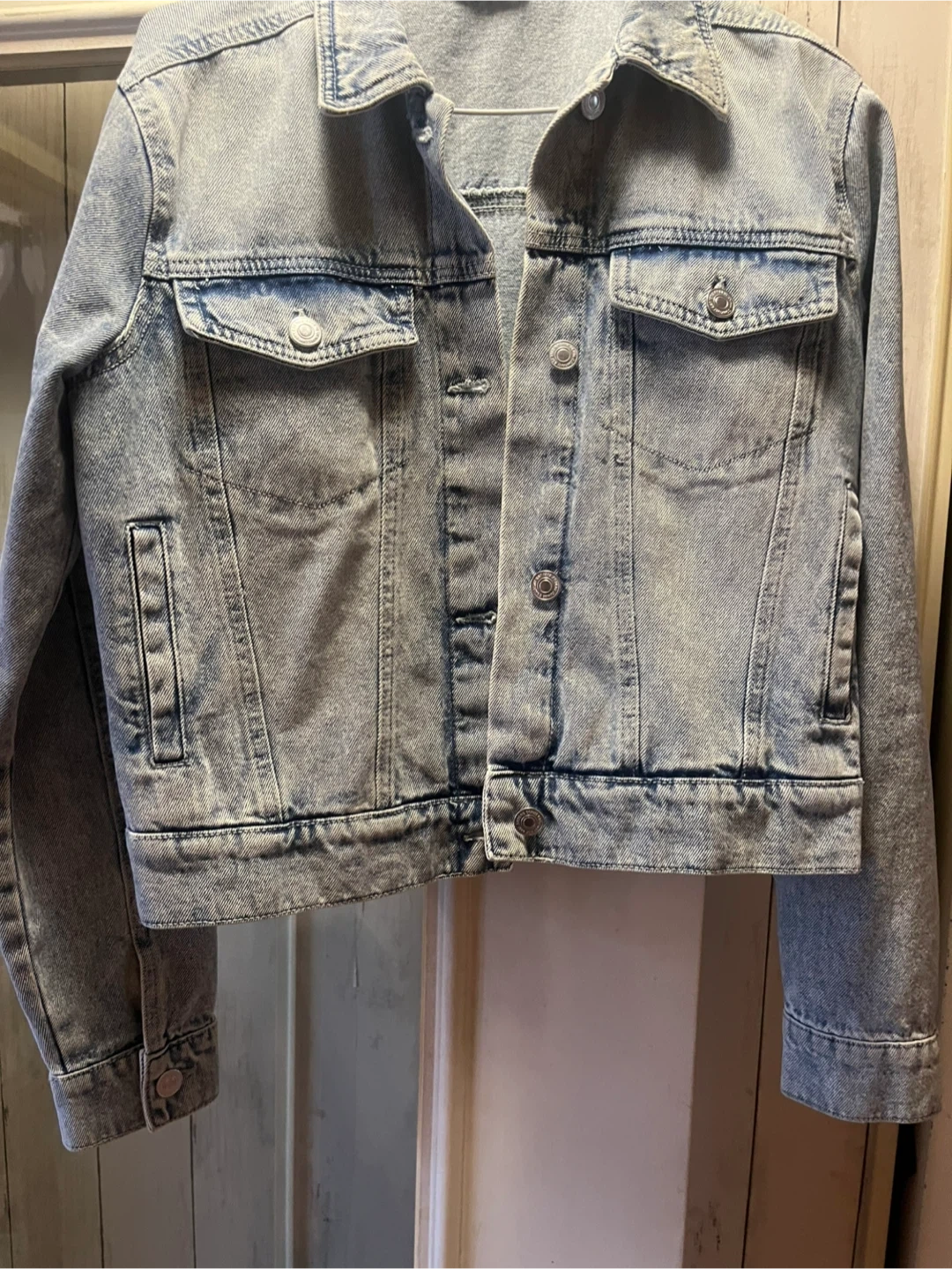 Light wash denim jacket in great condition! Perfect for layering or wearing on its own. It has a classic design with button closures and pockets. Also has inside pockets, size medium. New never worn.