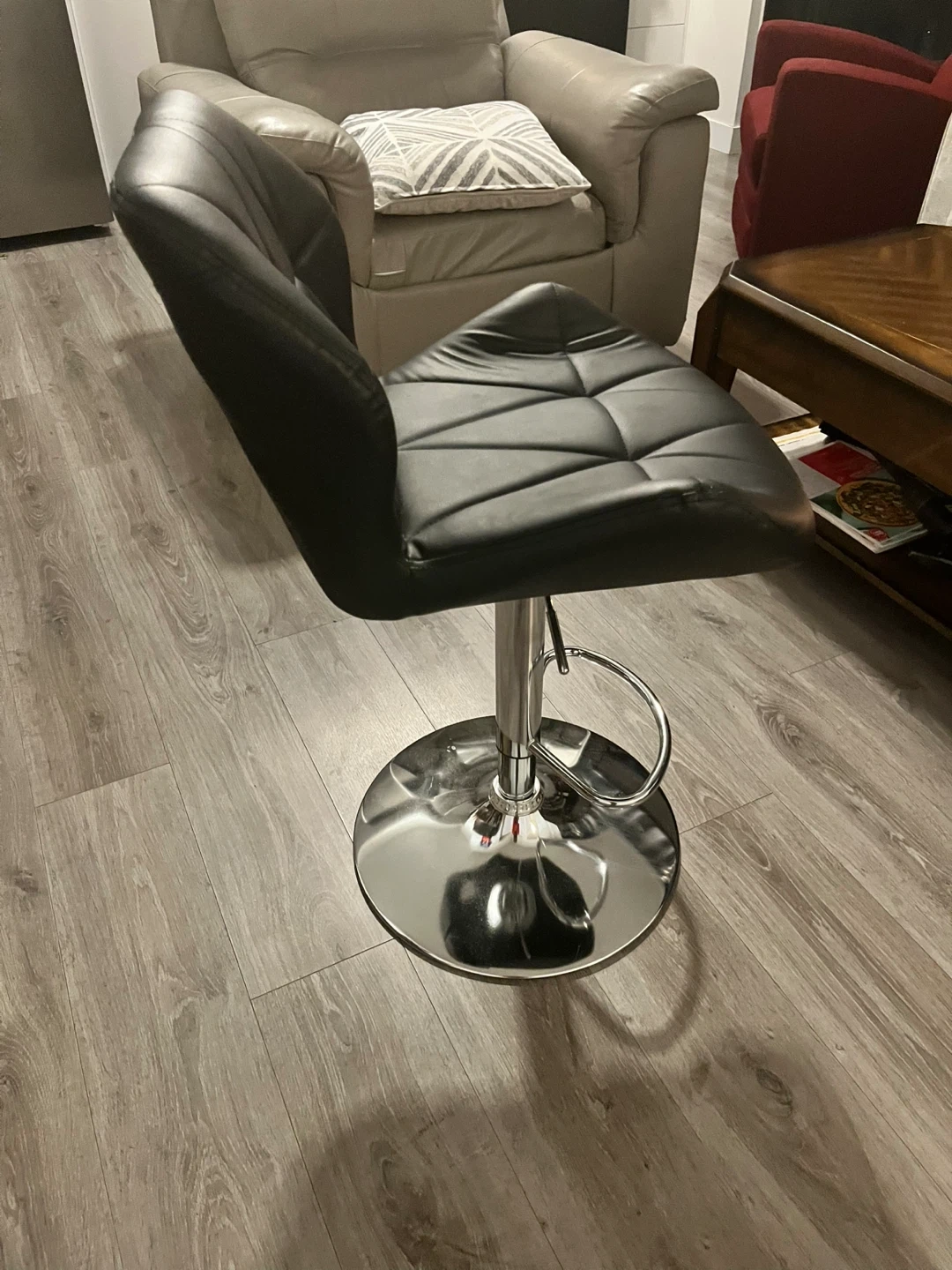 Selling 2 black bar stools. It has a chrome base and a comfortable padded seat. It would be a great addition to any kitchen or bar area!