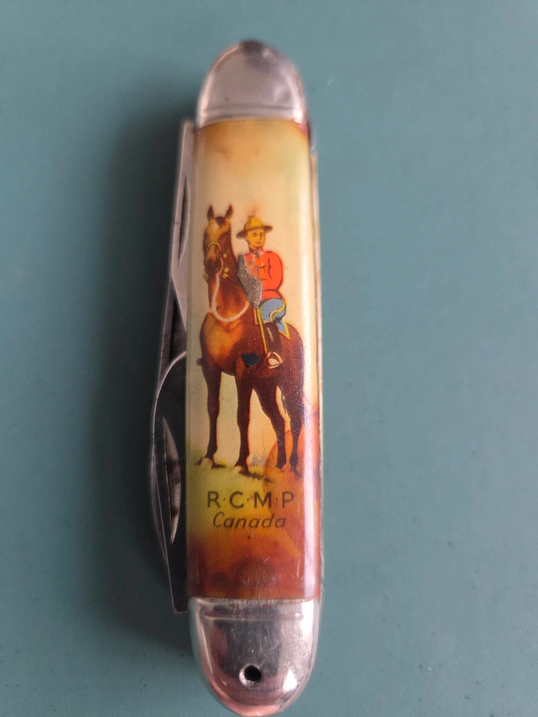 Selling a pocket featuring an image of the Royal Canadian Mounted Police (RCMP) on horseback. It's a unique piece and highly collectible.