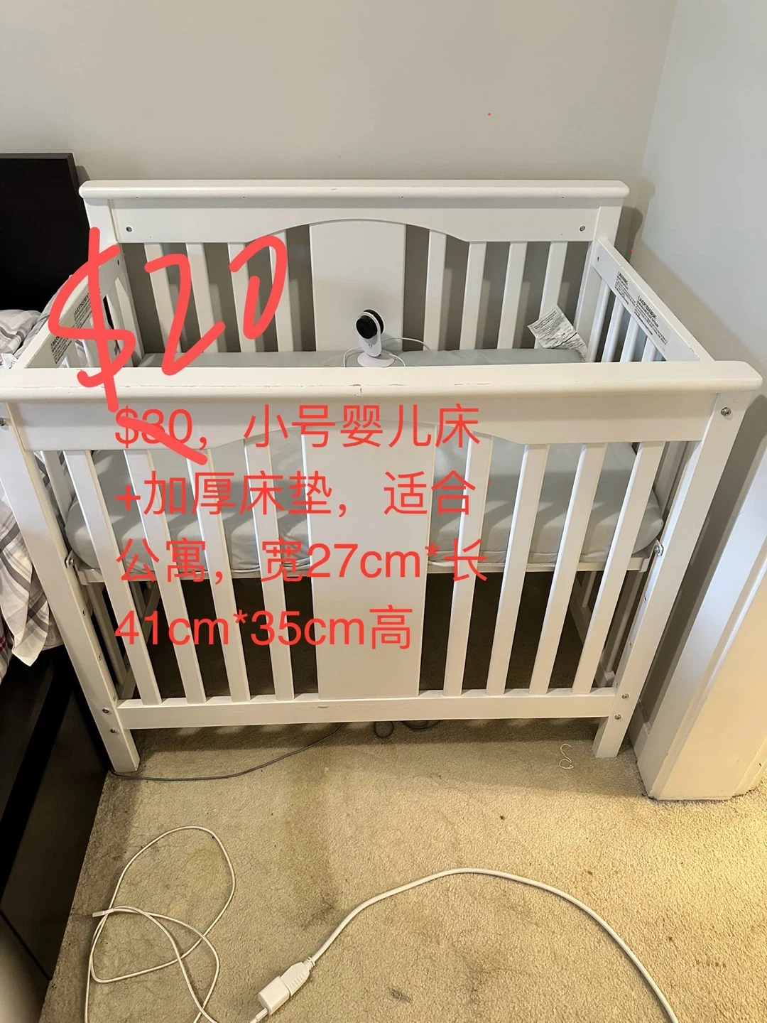 Selling a small baby crib with a thick mattress, perfect for an apartment! The crib measures 27cm wide, 41cm long, and 35cm high