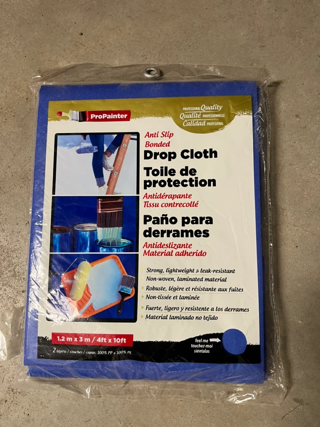 This ProPainter drop cloth, measuring 4ft x 10ft (1.2m x 3m), is new and ready to protect your surfaces during painting or other messy projects. It features an anti-slip bonded design and is made from strong, lightweight, leak-resistant, non-woven laminated material.