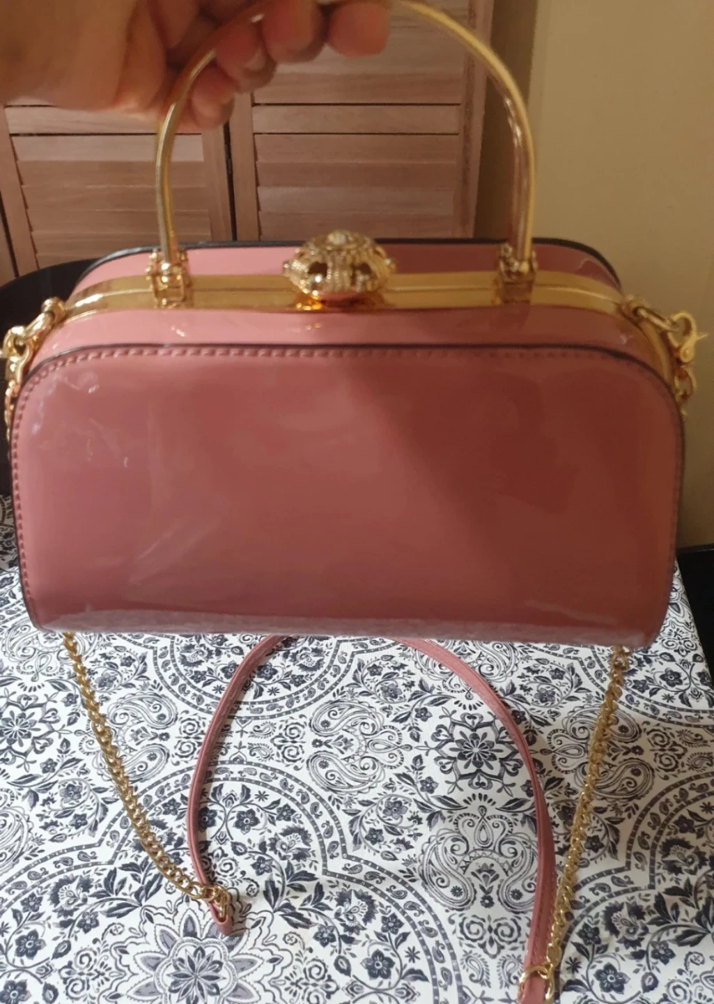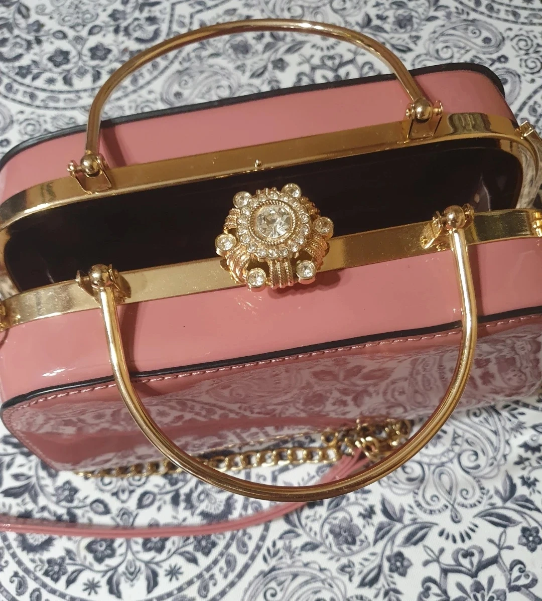 cute pink box handbag with gold accents! It has a unique design inside .The bag features a top handle and a chain strap, making it versatile for different occasions. The inside has a fun pattern too! Also handbag is soft and light