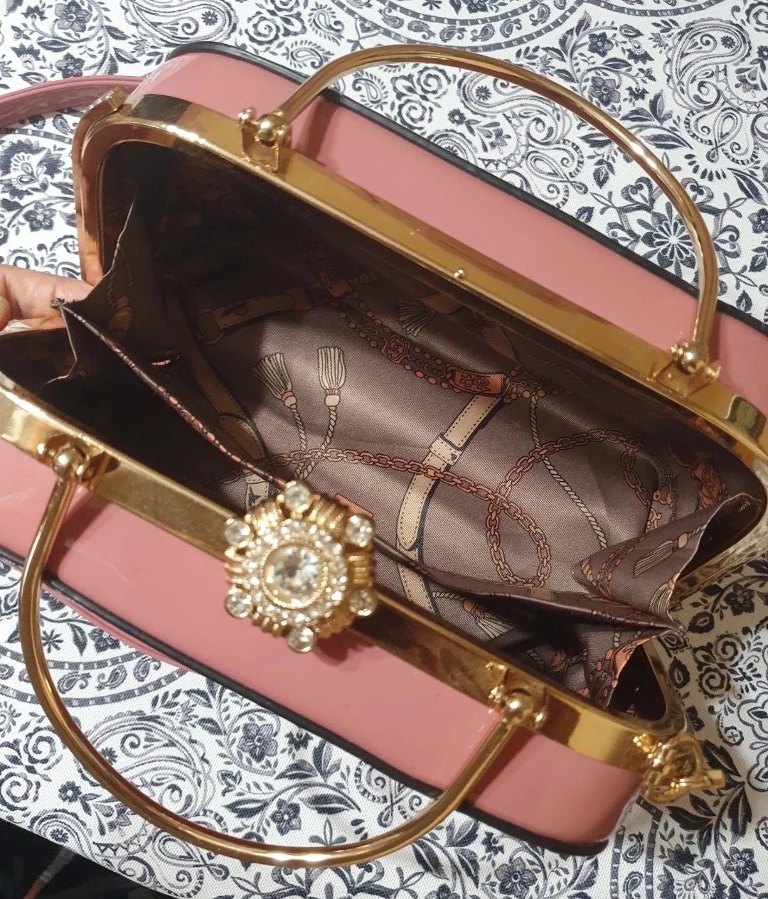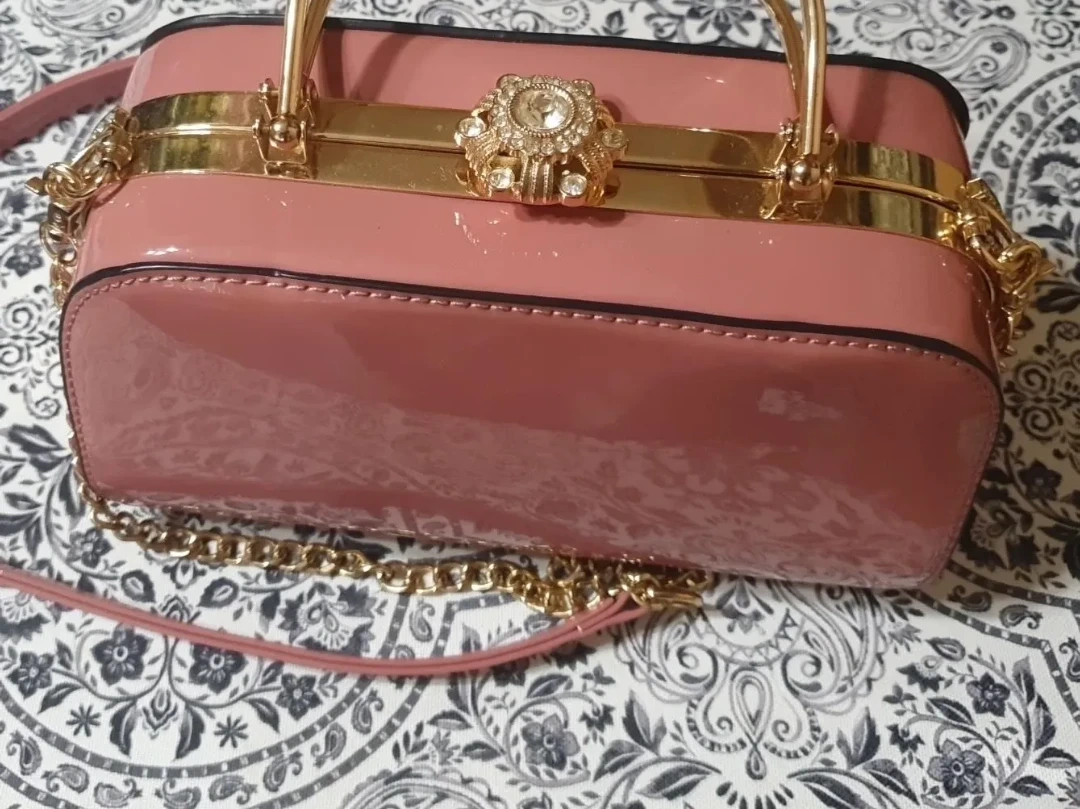 cute pink box handbag with gold accents! It has a unique design inside .The bag features a top handle and a chain strap, making it versatile for different occasions. The inside has a fun pattern too! Also handbag is soft and light