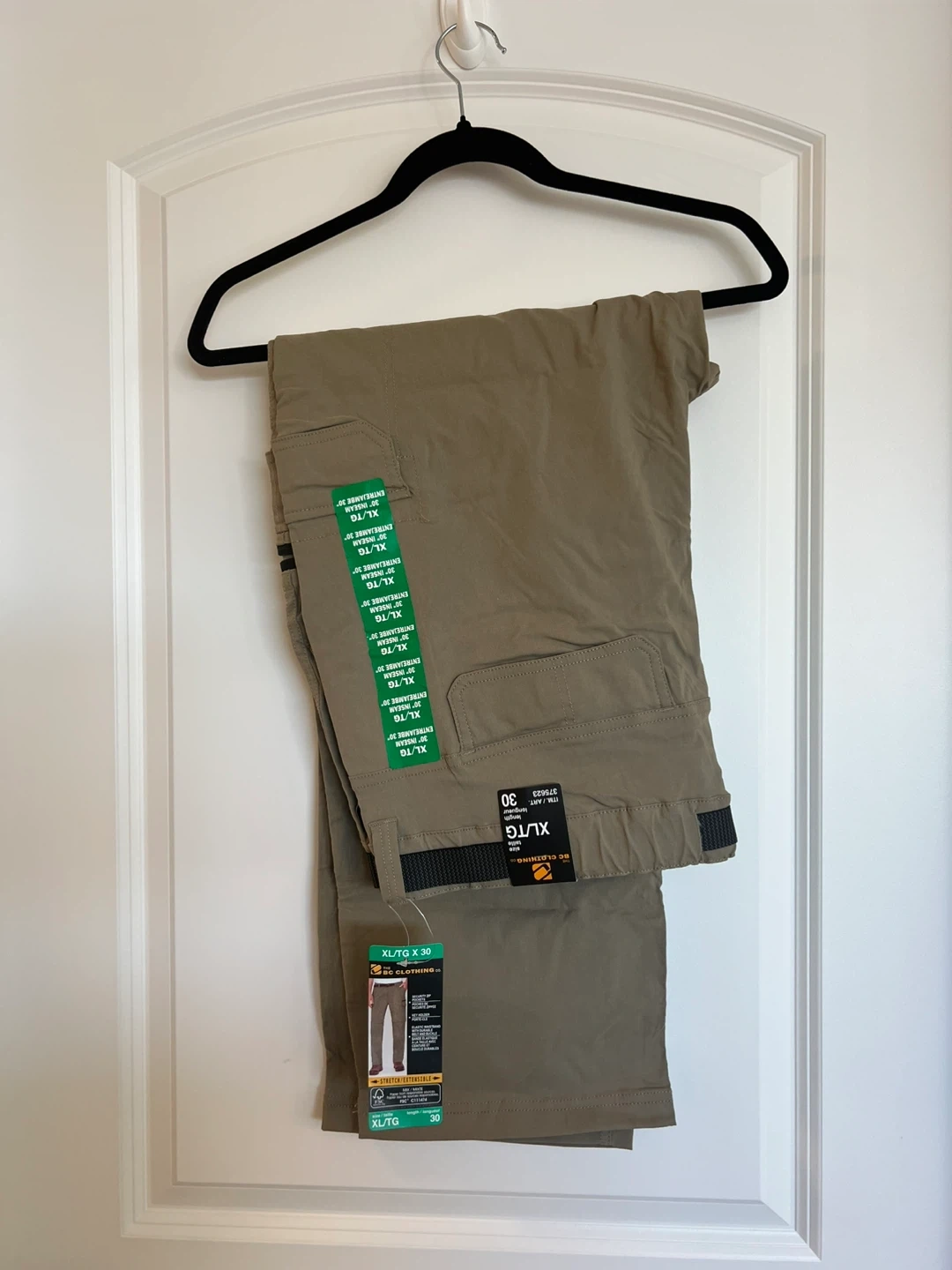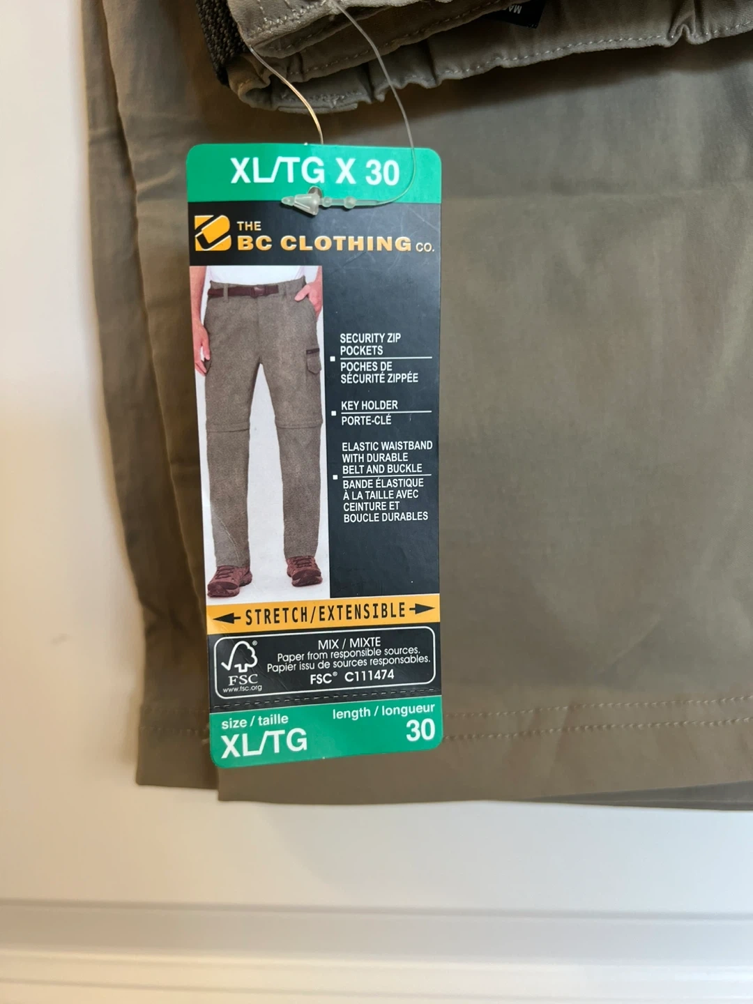 These The BC Clothing Co. convertible pants are size XL/TG and feature a 30-inch length. They have security zip pockets, a key holder, and an elastic waistband with a belt and buckle. These pants are also stretchable and durable.