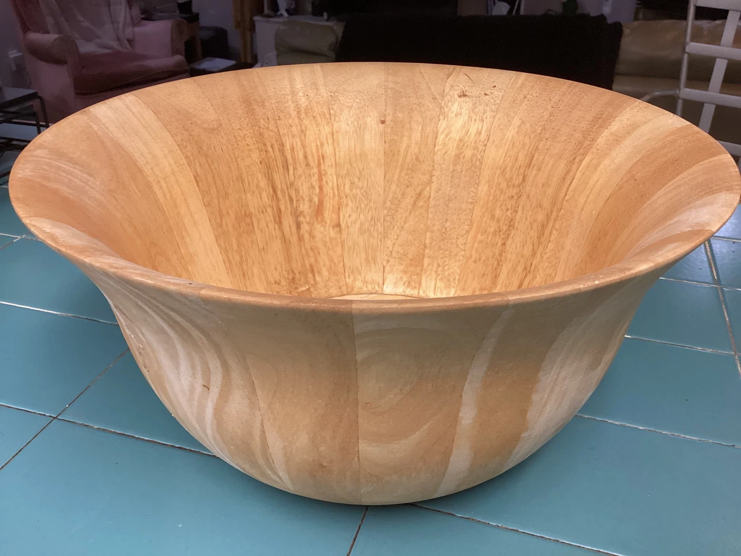 Selling a wooden salad bowl. It's perfect for serving salads or as a decorative piece. The bowl has a nice, natural wood grain finish. It's in good condition and ready to use in your home