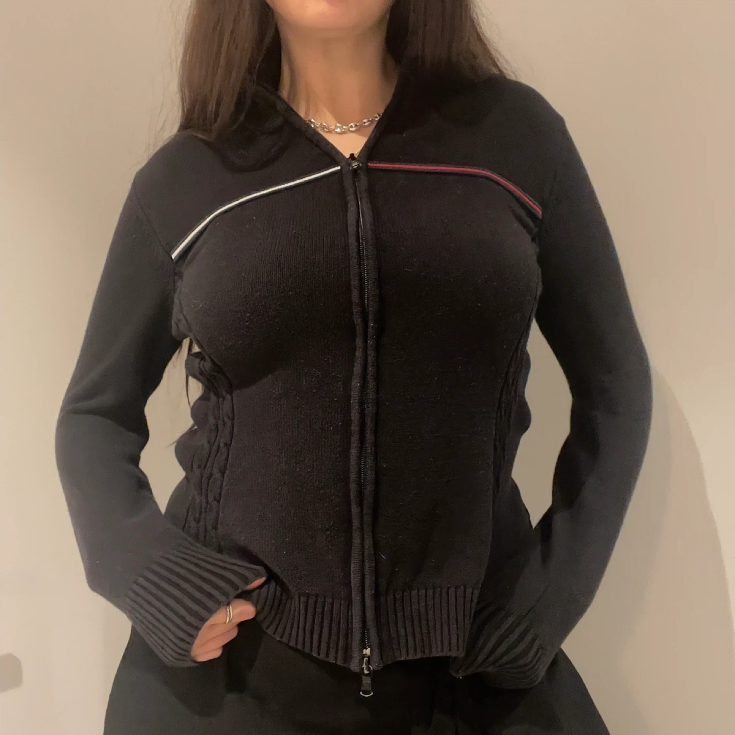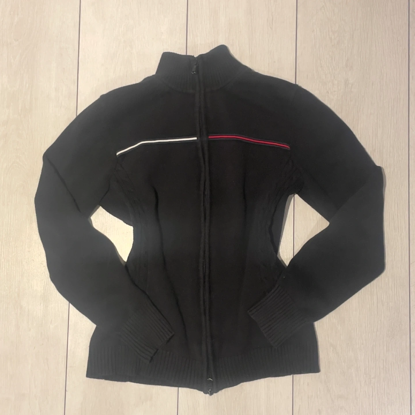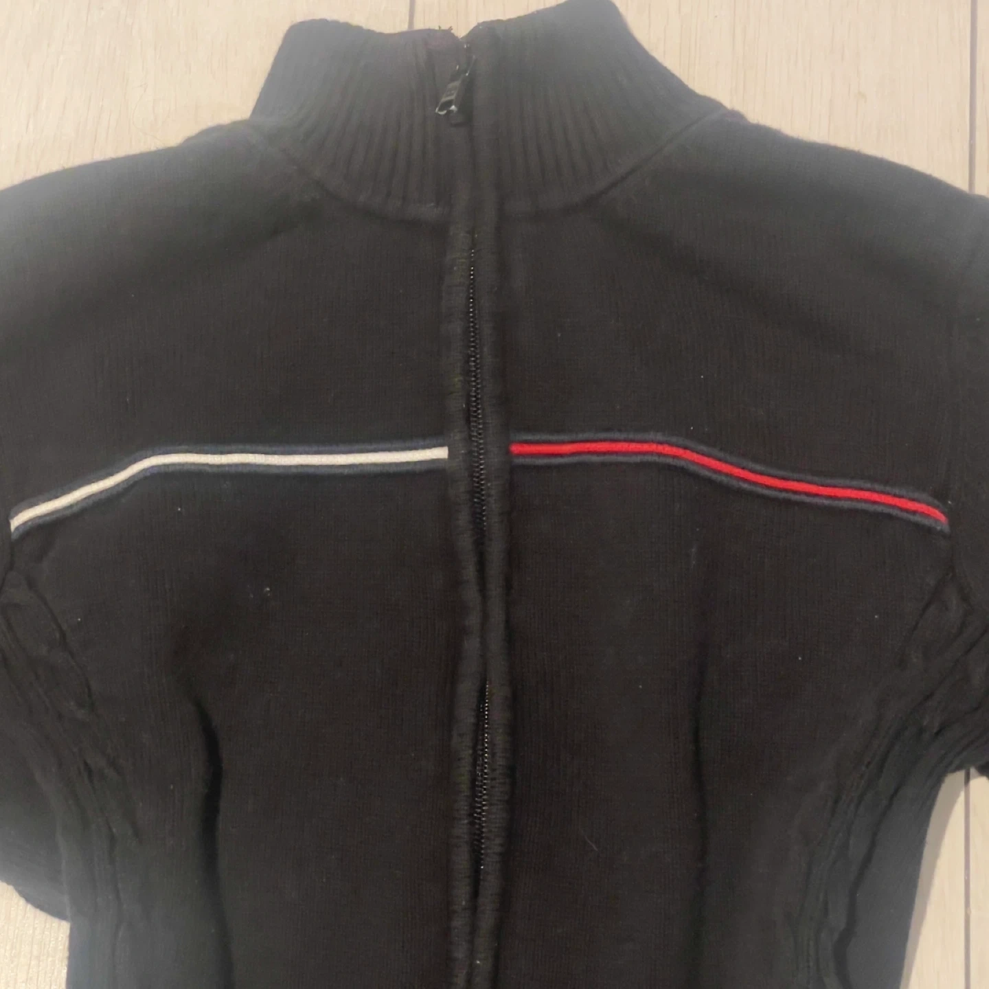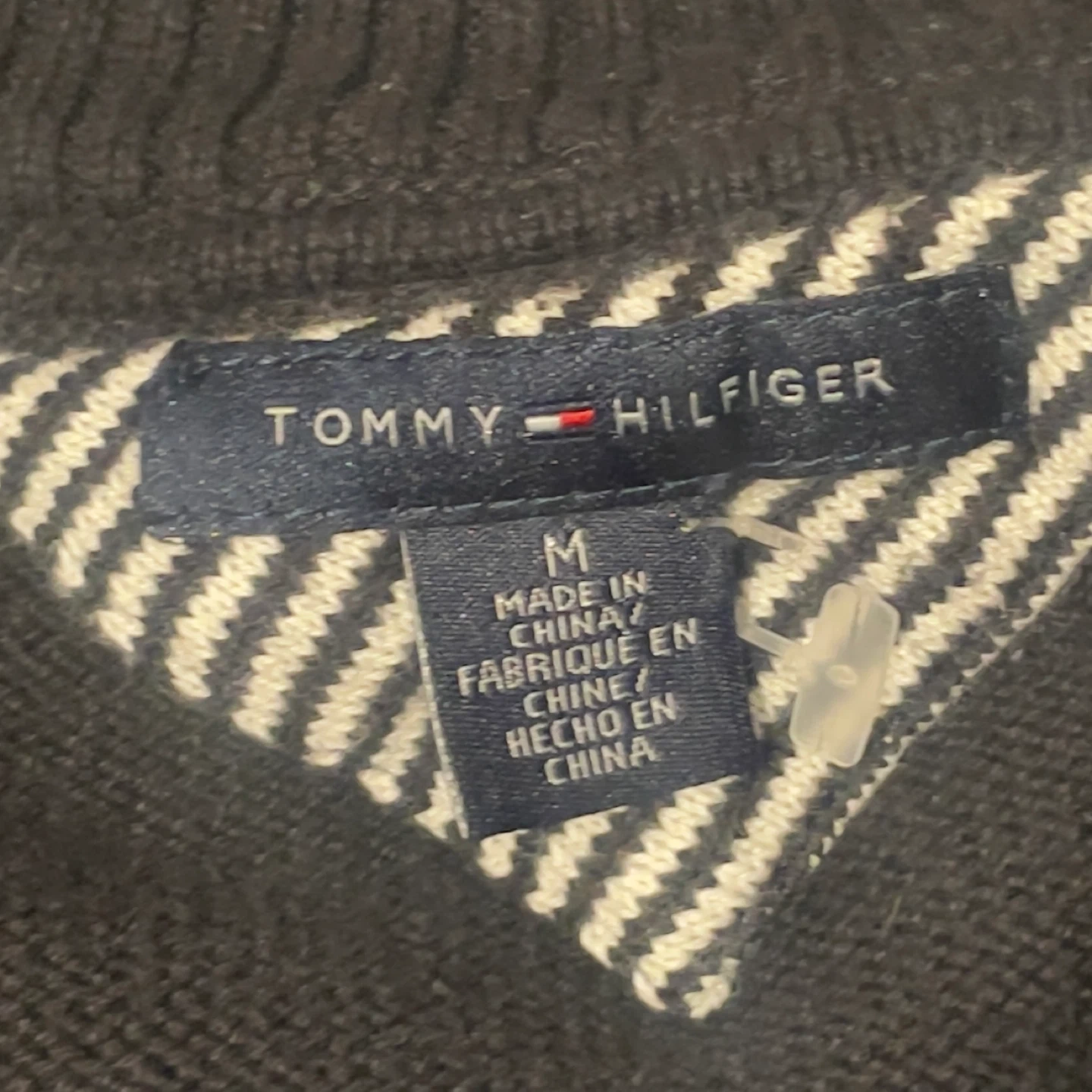 Selling a Tommy Hilfiger zip-up sweater in size medium. It's a classic black colour with the iconic Tommy Hilfiger stripe detail. Perfect for layering or wearing on its own. In great condition! Sz M