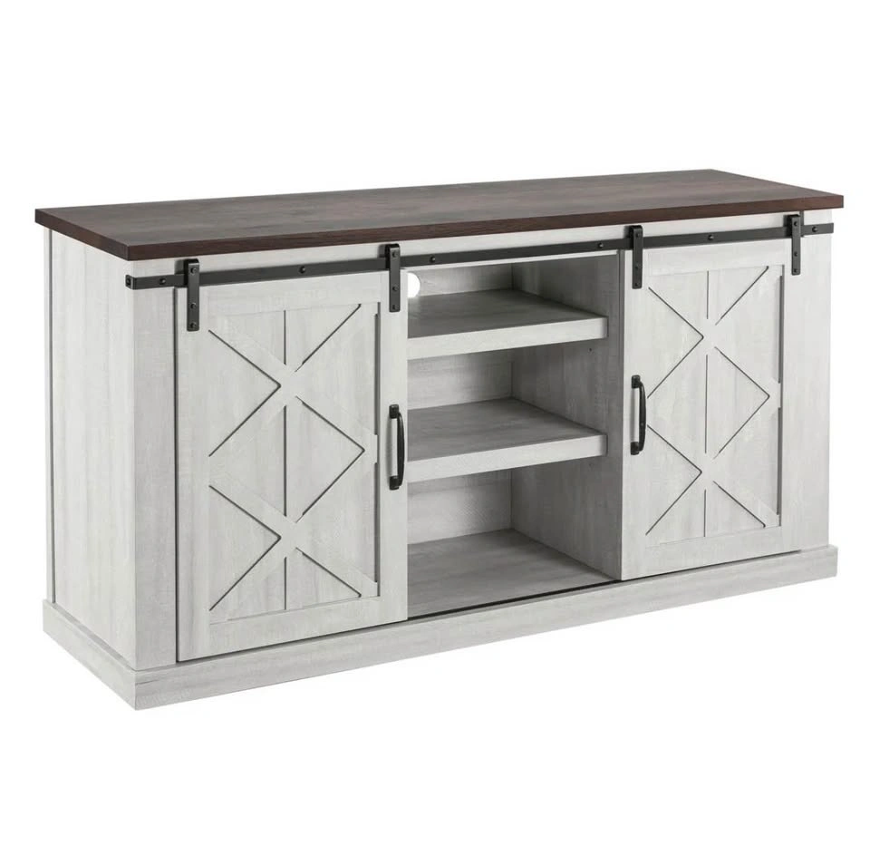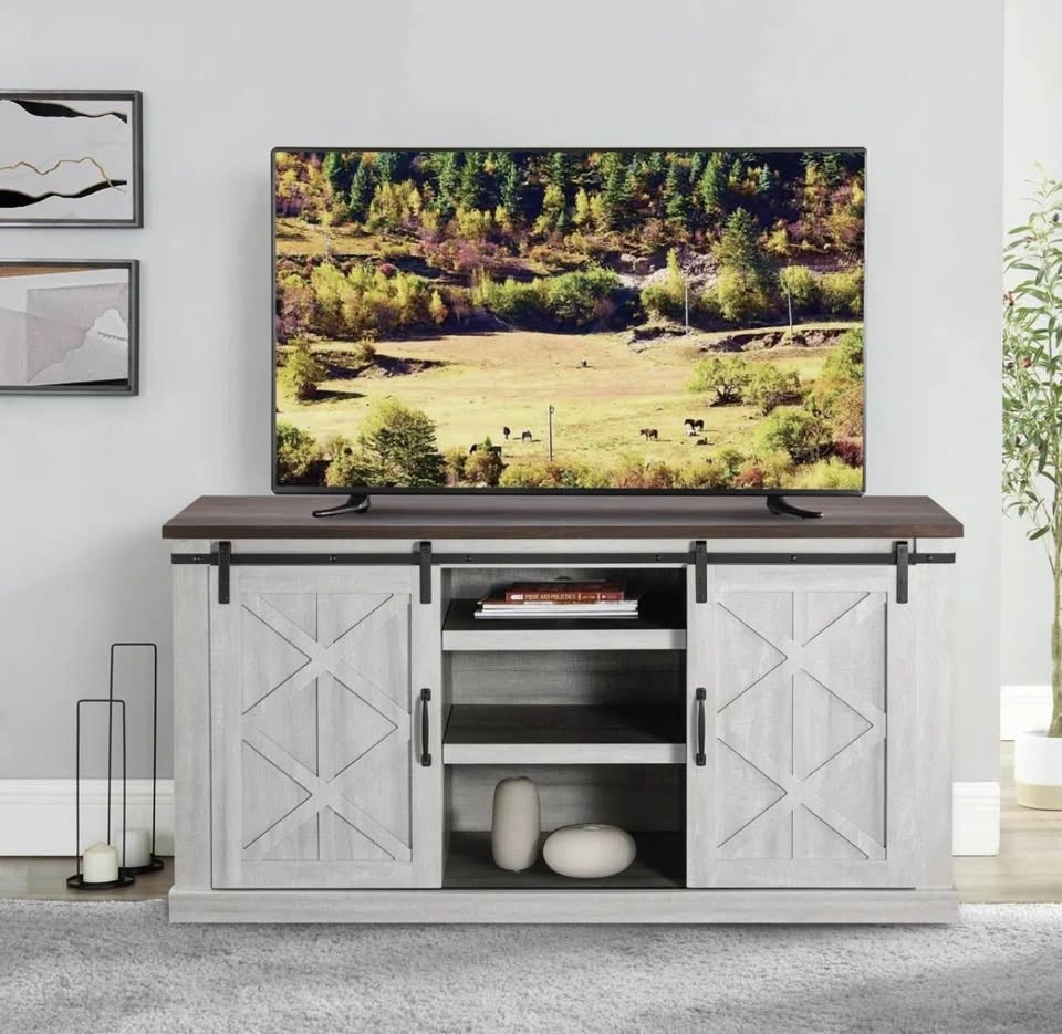 Beautiful modern farmhouse TV stand with sliding barn doors and wood finish. Solid, stylish, and perfect for condos or living rooms.